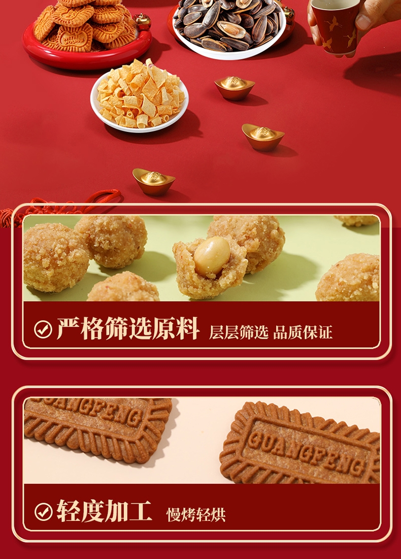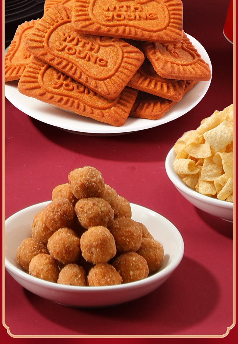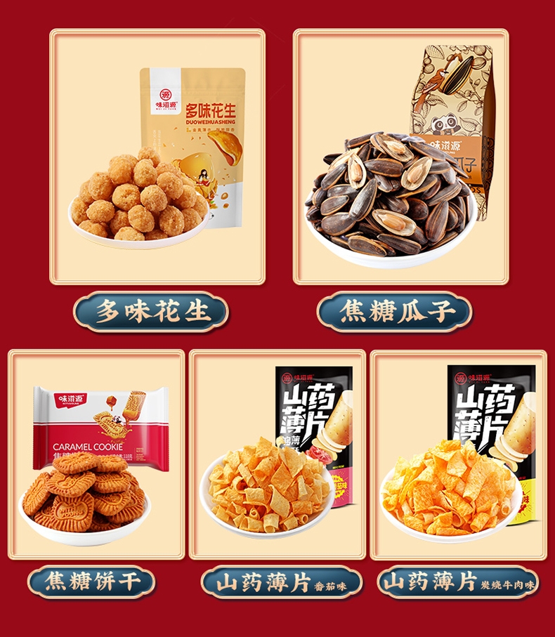 配置清单:多味花生120g*1袋 焦糖瓜子120g*1袋 焦糖饼干118g*1袋 山药薄片番茄味35g*1袋 山药薄片炭烧牛肉味35g*1袋