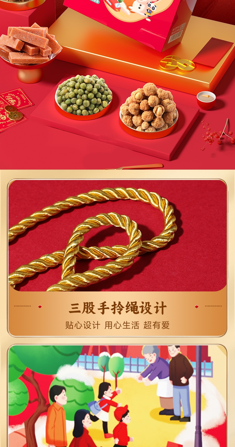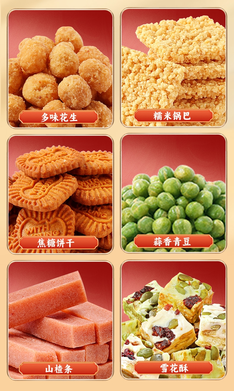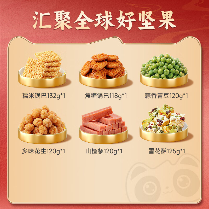 配置清单:青豆120g*1袋 山楂条120g*1袋 雪花酥125g*1袋 多味花生120g*1袋 焦糖饼干118g*1袋 原味糯米锅巴132g*1袋
