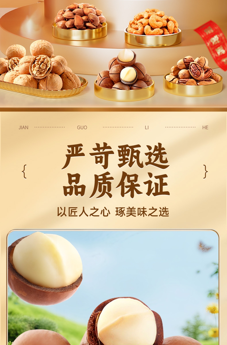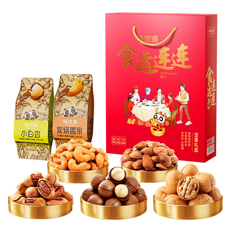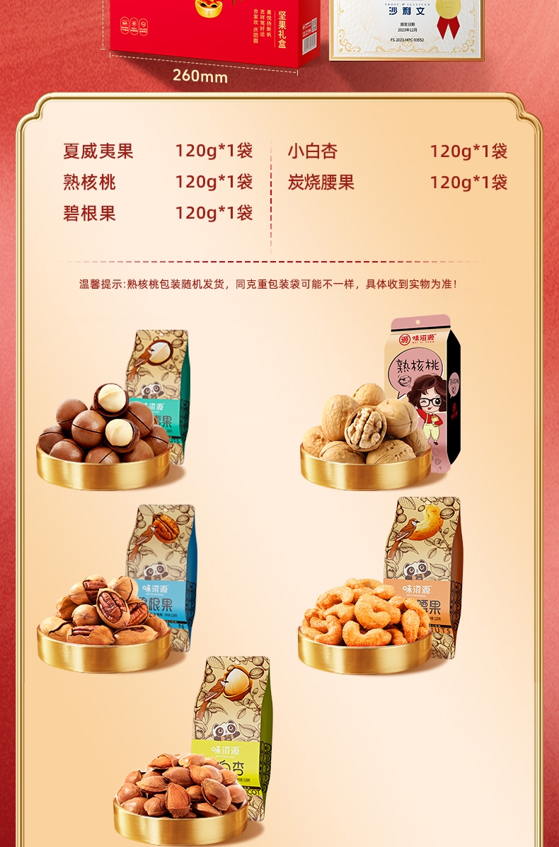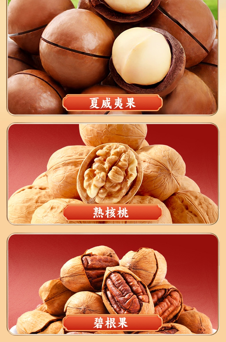 配置清单:腰果120g*1袋 碧根果120g*1袋 小白杏120g*1袋 熟核桃120g*1袋 夏威夷果120g*1袋
