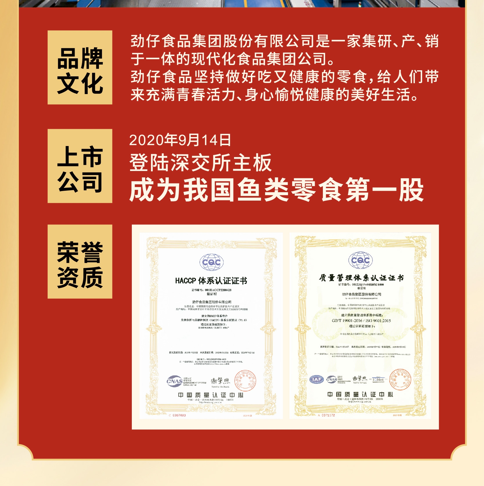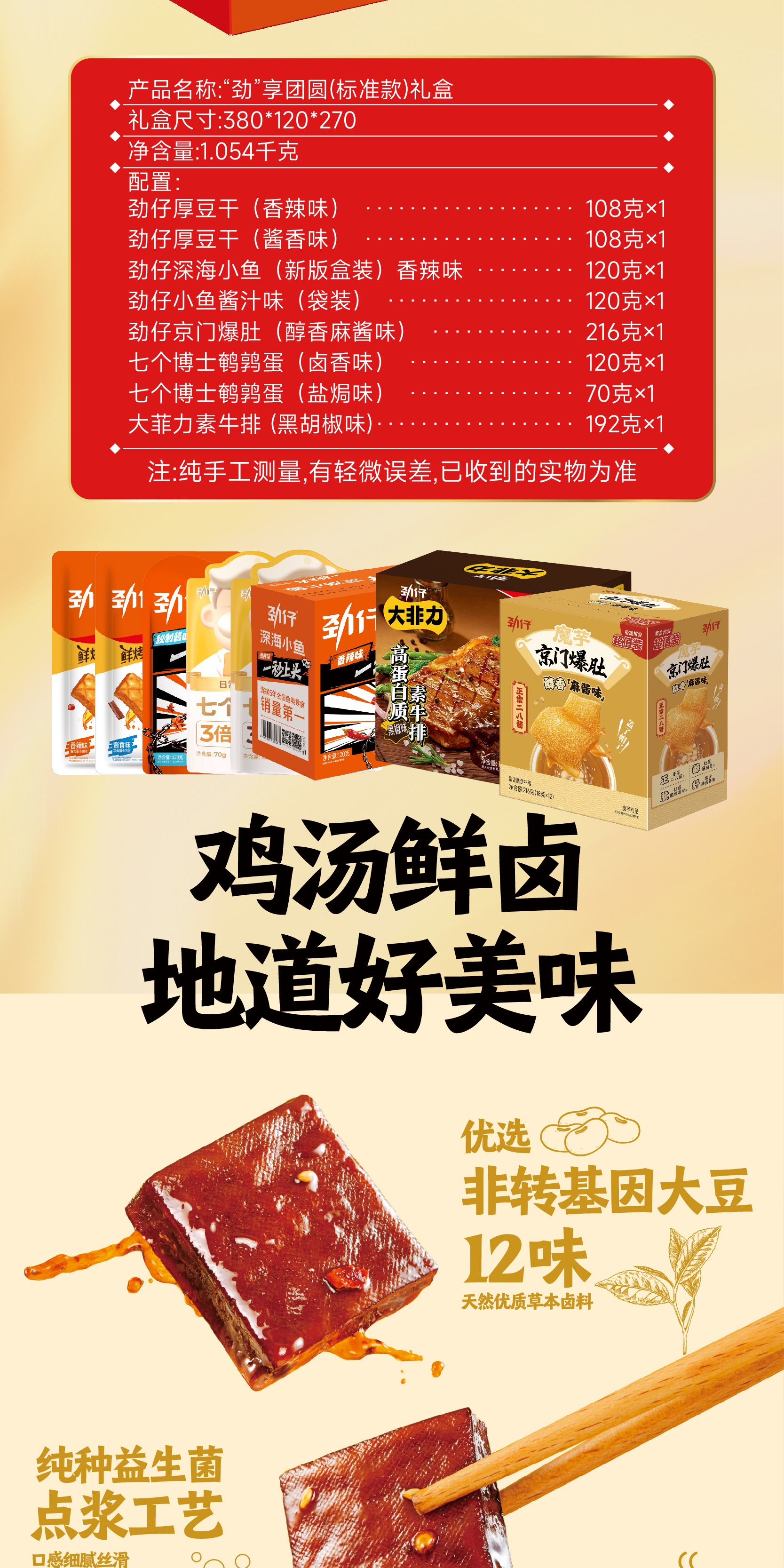 配置清单:108g劲仔厚豆干(香辣味) 108g劲仔厚豆干(酱香味) 120g劲仔深海小鱼(新版盒装)香辣味 120g劲仔小鱼酱汁味(袋装) 216g京门爆肚醇香麻酱味 70g七个博士鹌鹑蛋(盐焗味) 120g七个博士鹌鹑蛋(卤香味) 192g大菲力素牛排(黑椒味)