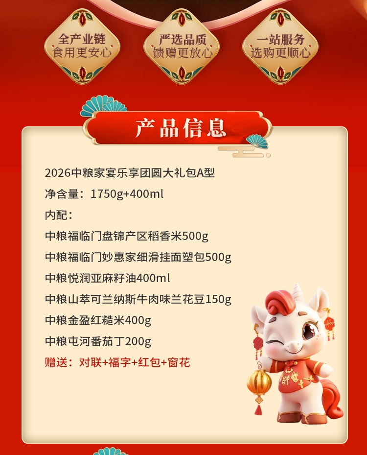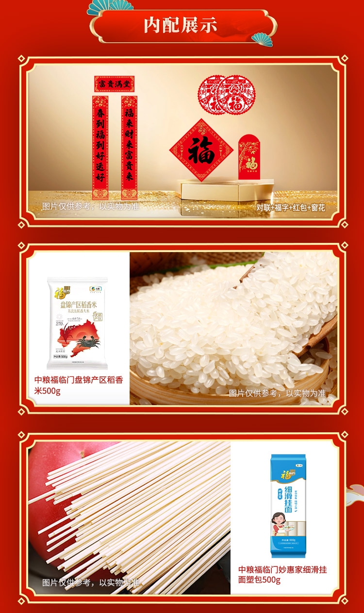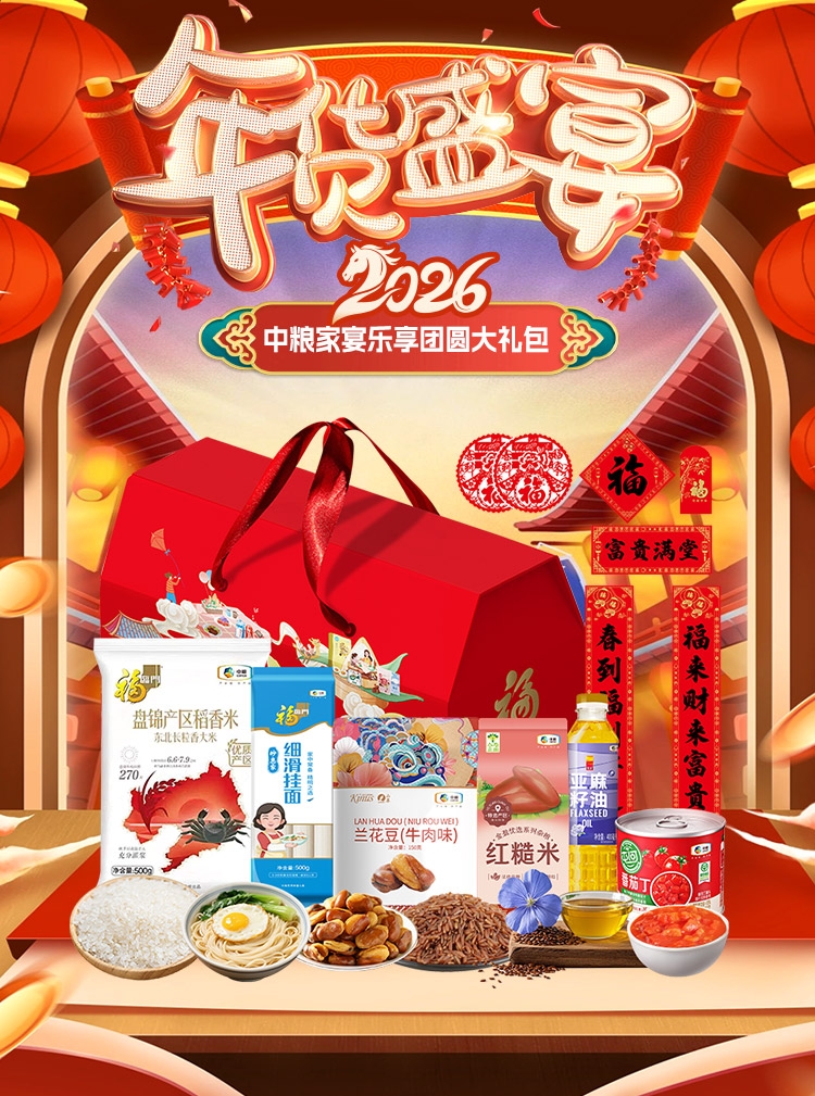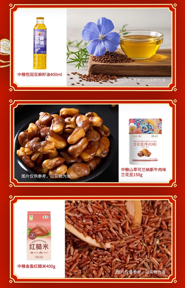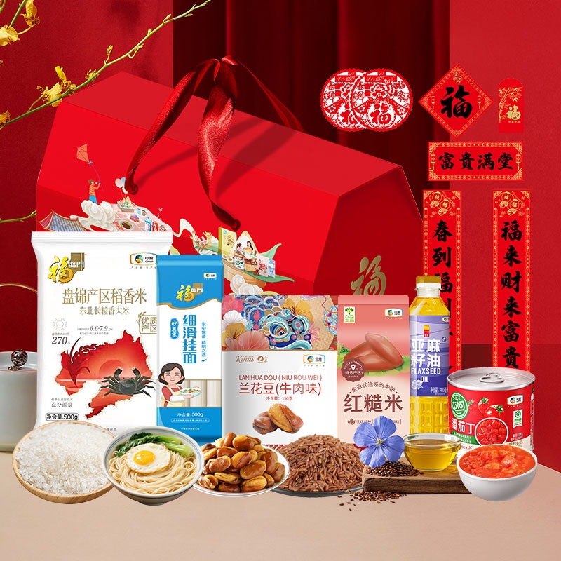 配置清单:净含量:1750g+400ml 内配: 中粮福临门盘锦产区稻香米500g 中粮福临门妙惠家细滑挂面塑包500g 中粮悦润亚麻籽油400ml 中粮山萃可兰纳斯牛肉味兰花豆150g 中粮金盈红糙米400g 中粮屯河番茄丁200g 赠送:对联+福字+红包+窗花