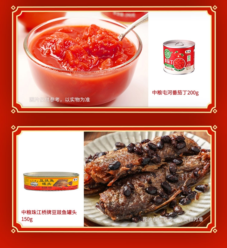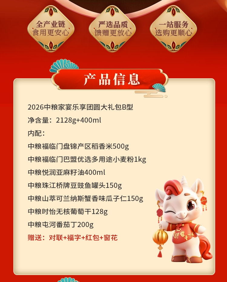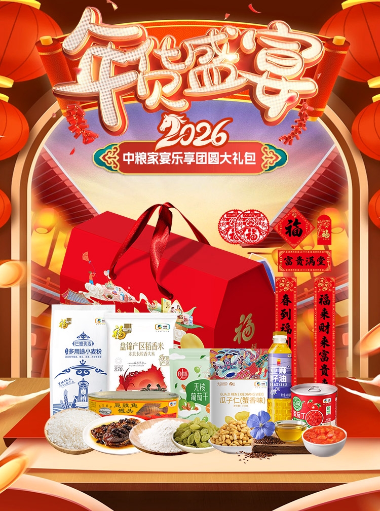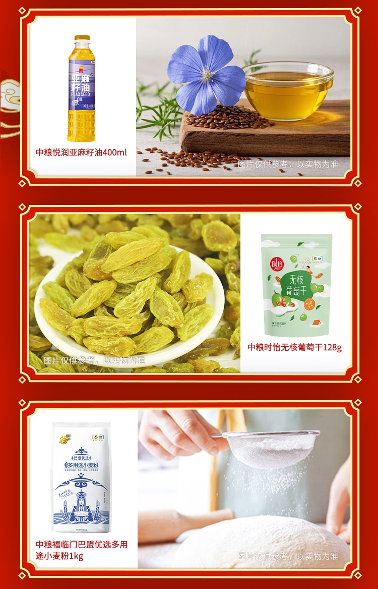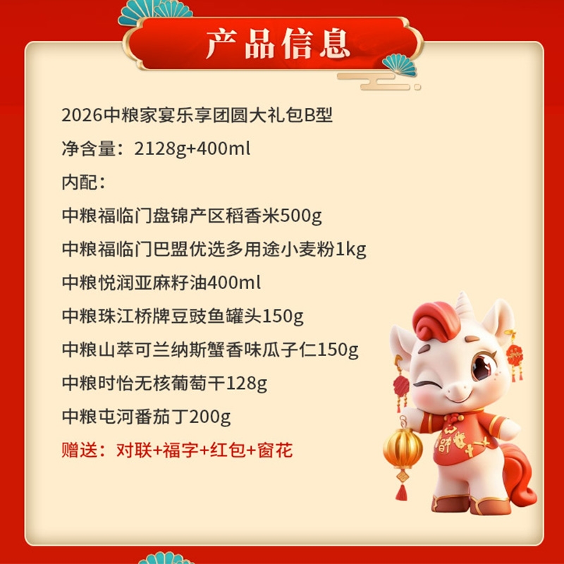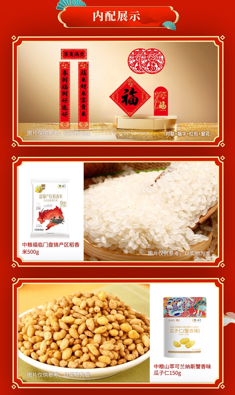 配置清单:净含量:2128g+400ml 内配: 中粮福临门盘锦产区稻香米500g 中粮福临门巴盟优选多用途小麦粉1kg 中粮悦润亚麻籽油400ml 中粮珠江桥牌豆豉鱼罐头150g 中粮时怡无核葡萄干128g 中粮山萃可兰纳斯蟹香味瓜子仁150g 中粮屯河番茄丁200g 赠送:对联+福字+红包+窗花