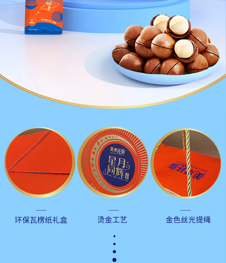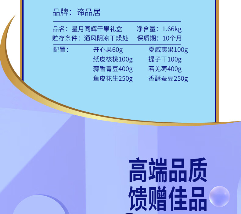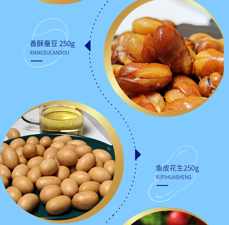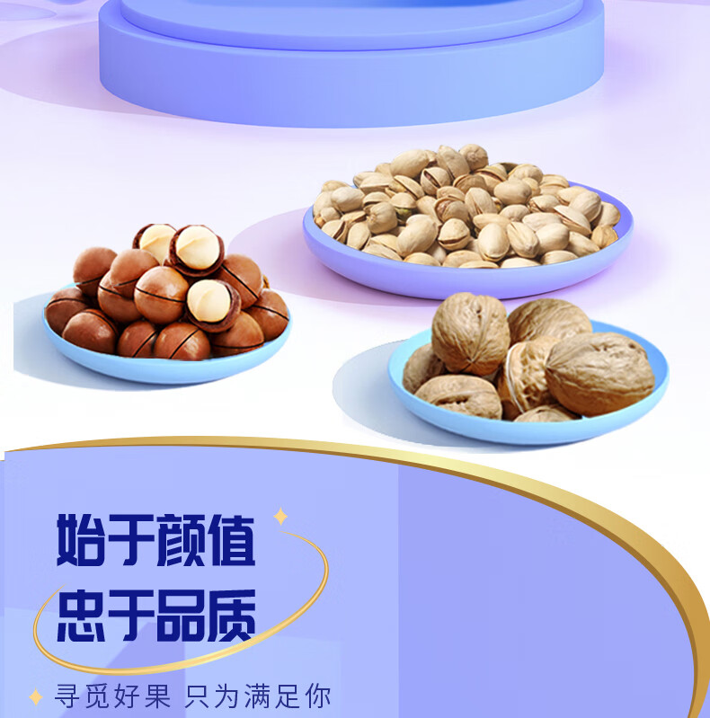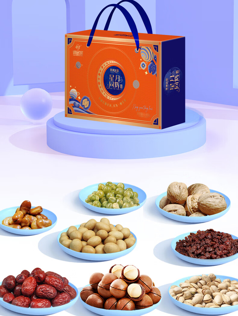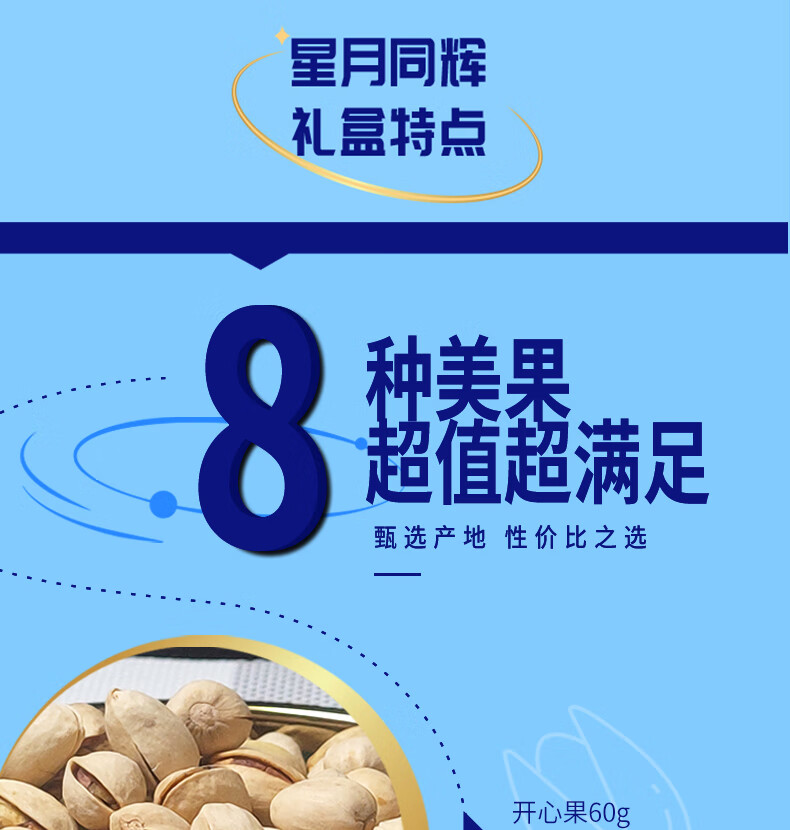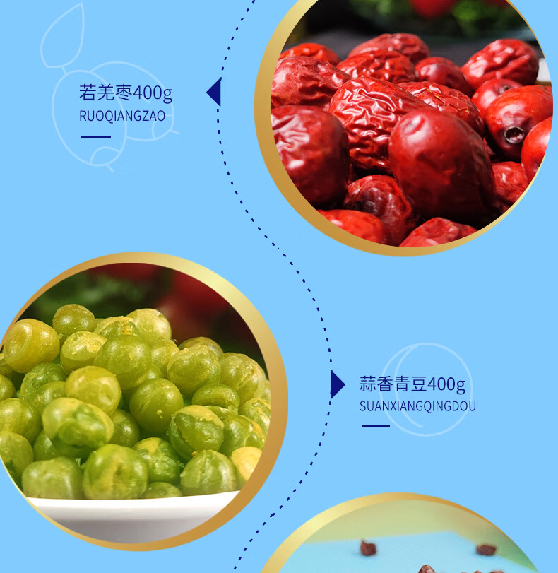 配置:开心果60g 夏威夷果100g 纸皮核桃100g 提子干100g 蒜香青豆400g 若羌枣400g 鱼皮花生250g香酥蚕豆250g