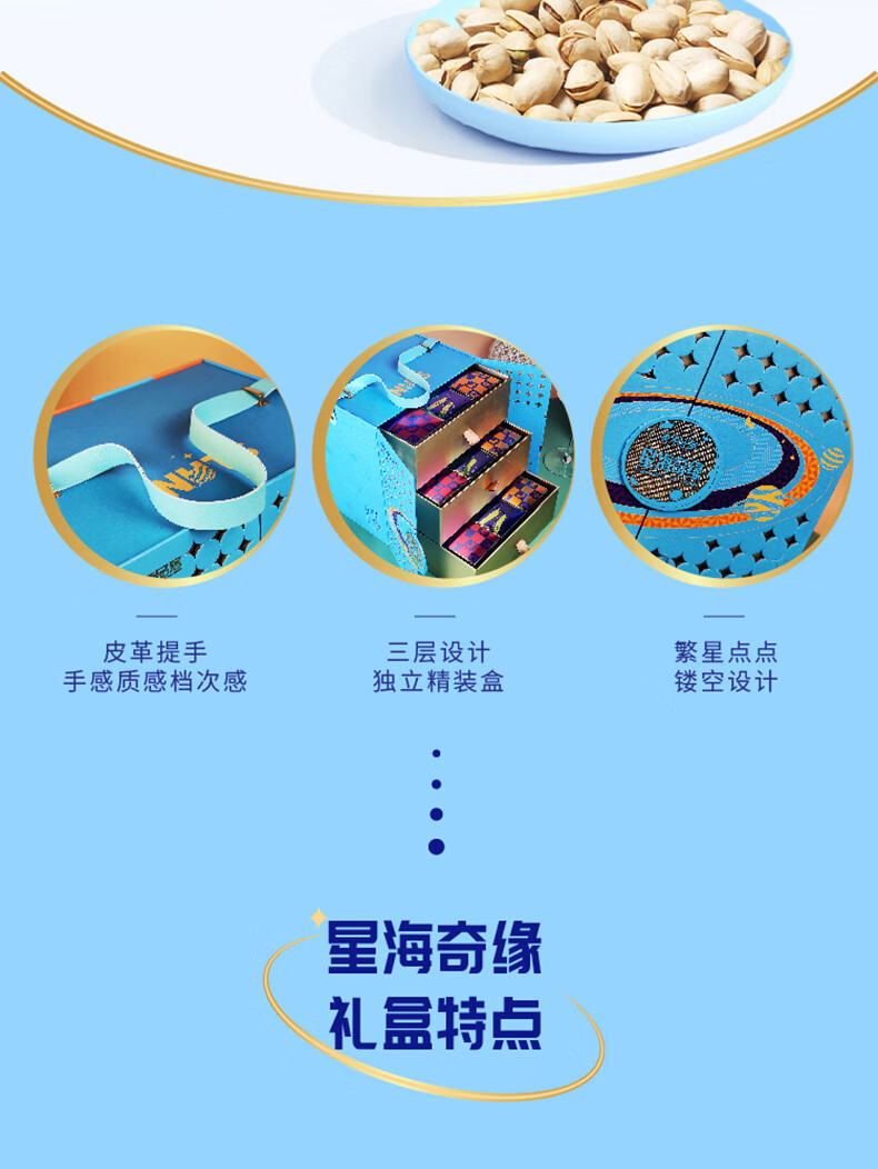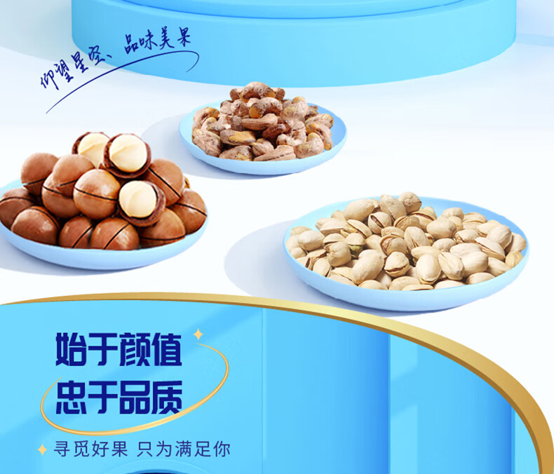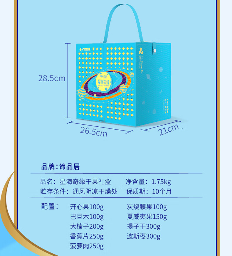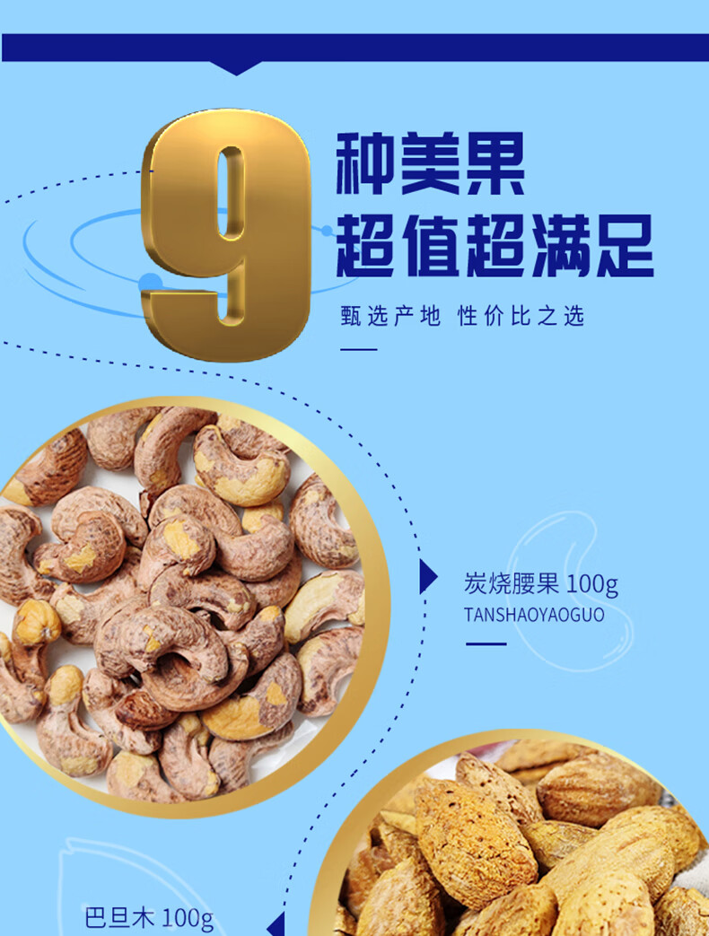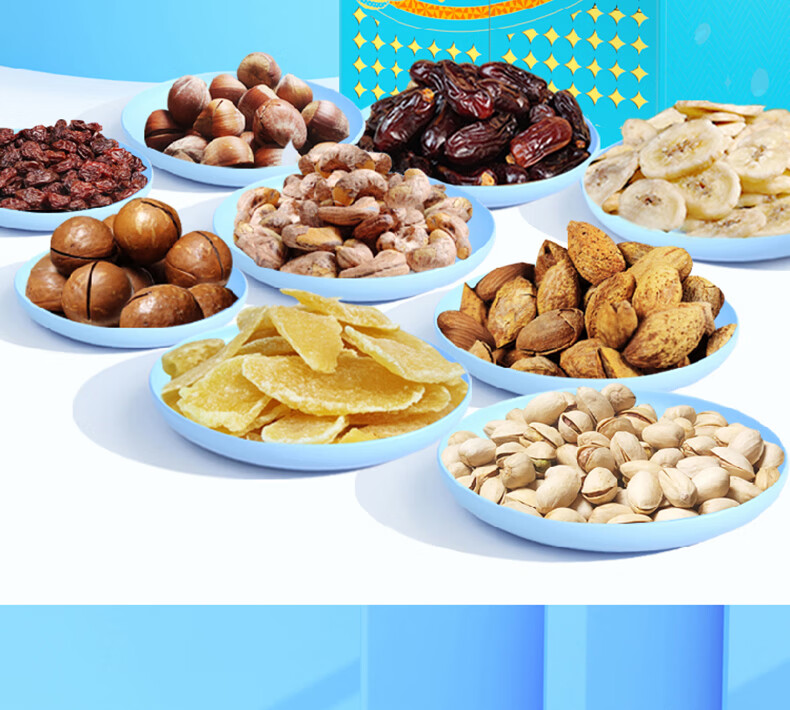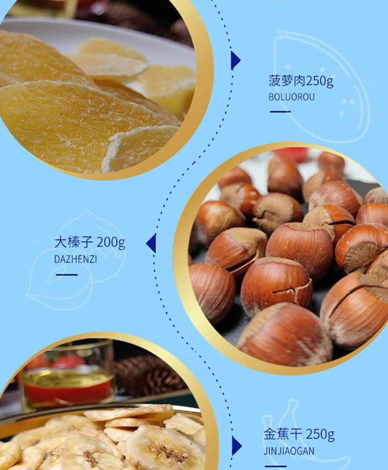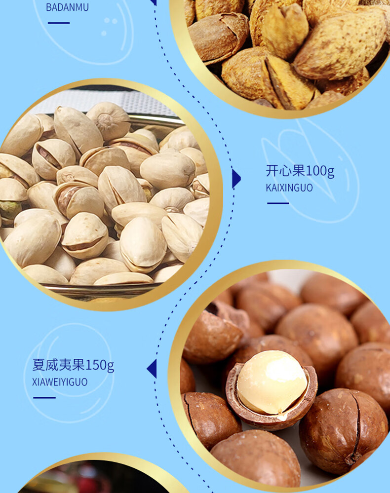 配置:开心果100g 炭烧腰果100g 巴旦木100g 夏威夷果150g 大榛子200g 提子干300g 香蕉片250g 波斯枣300g 菠萝肉250g