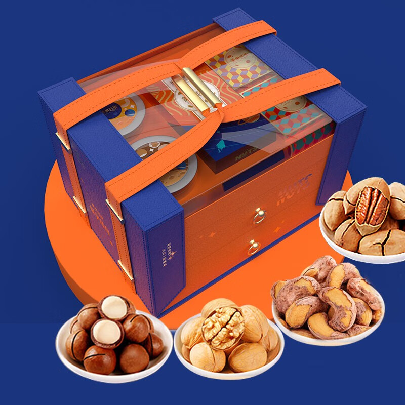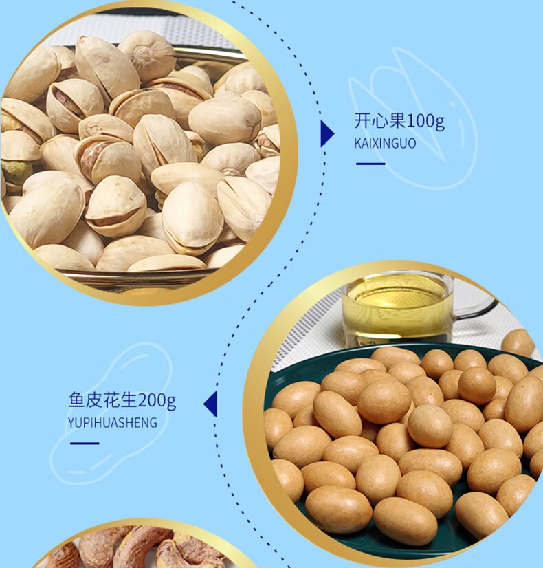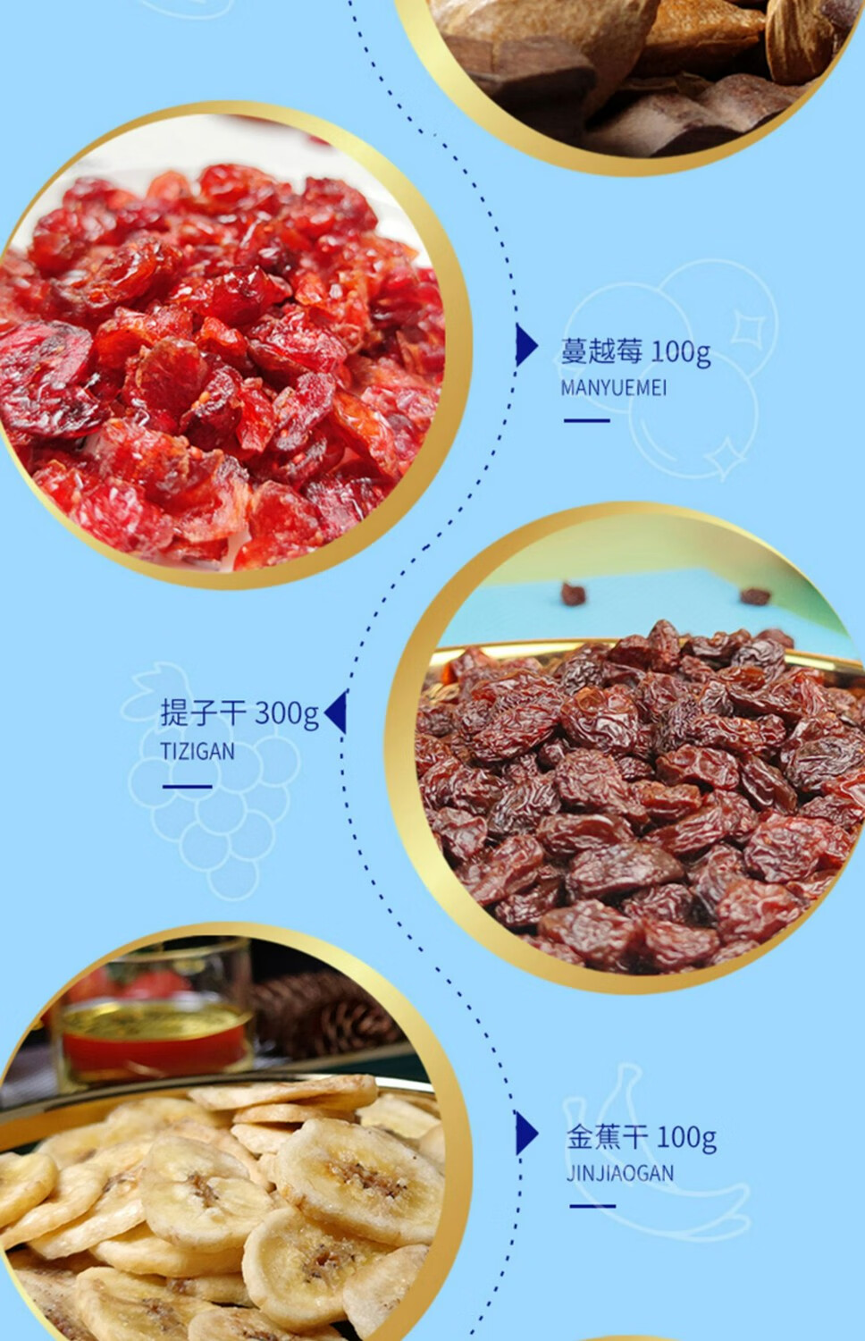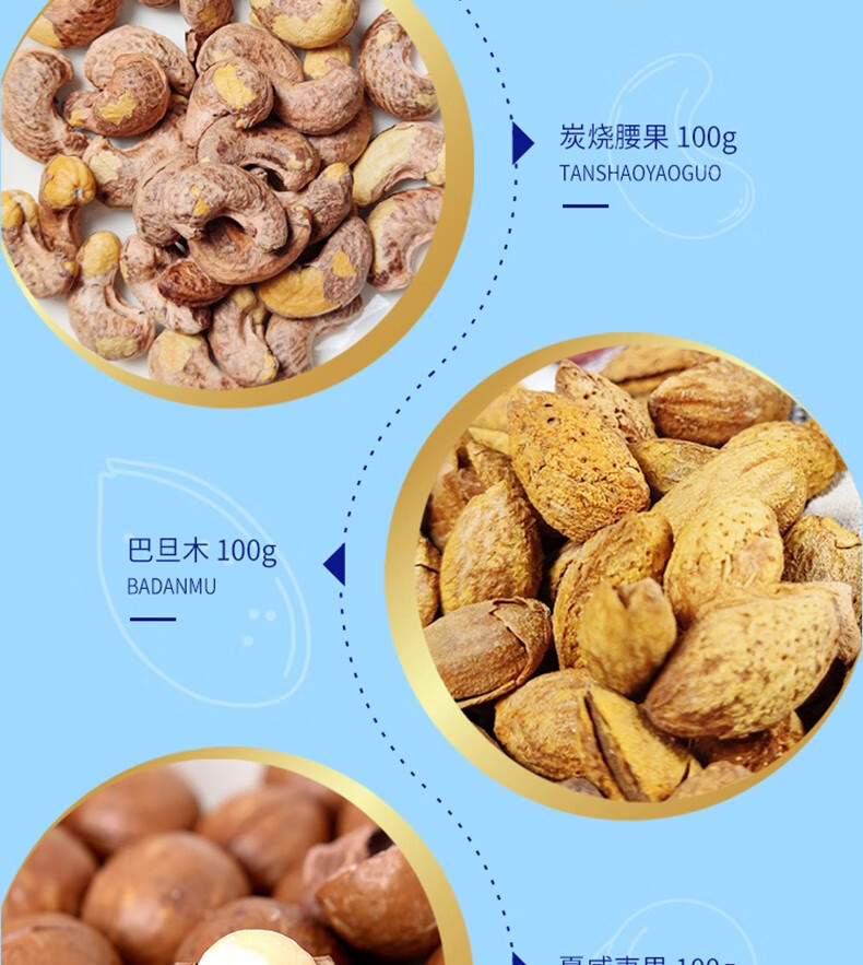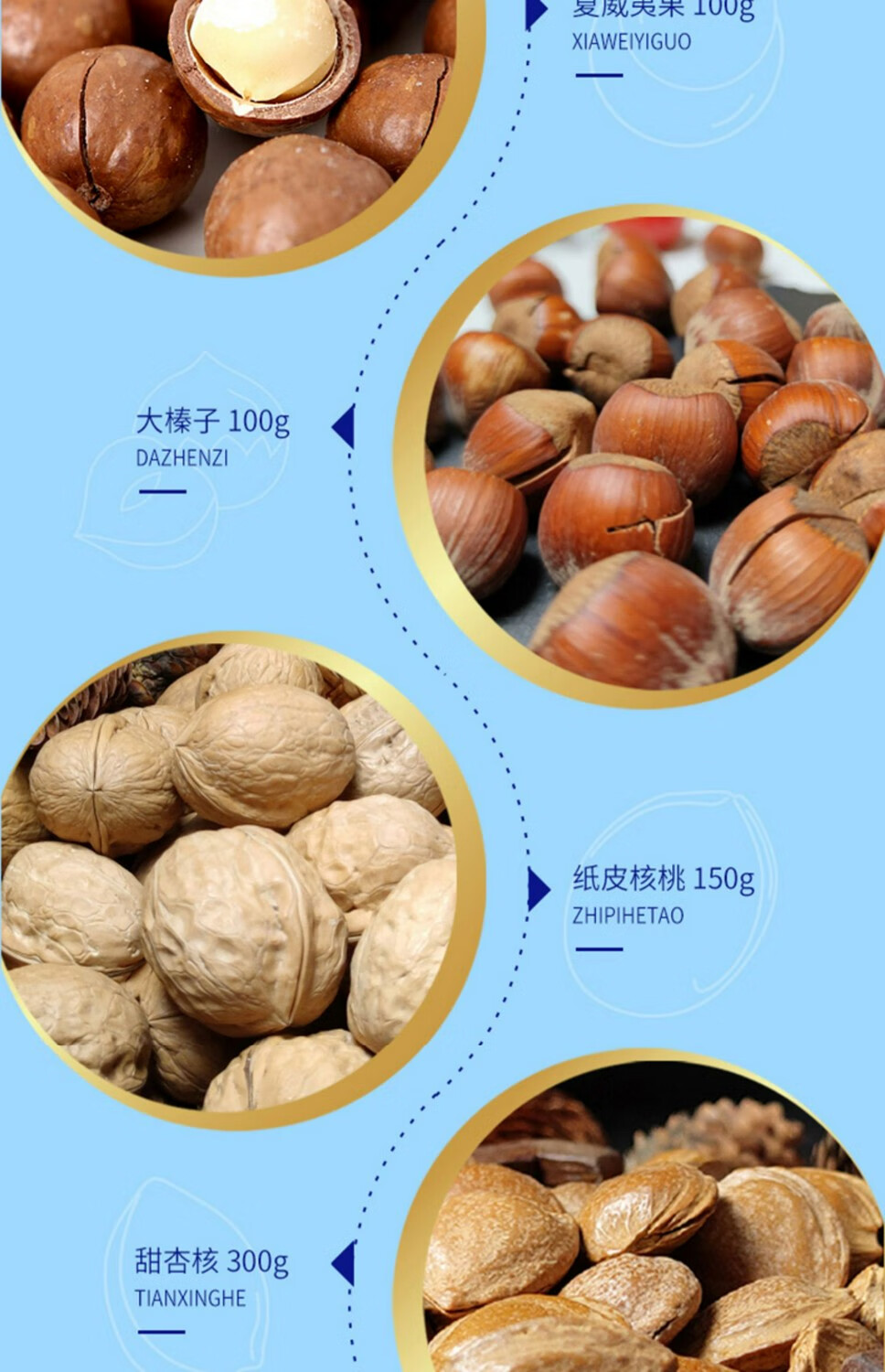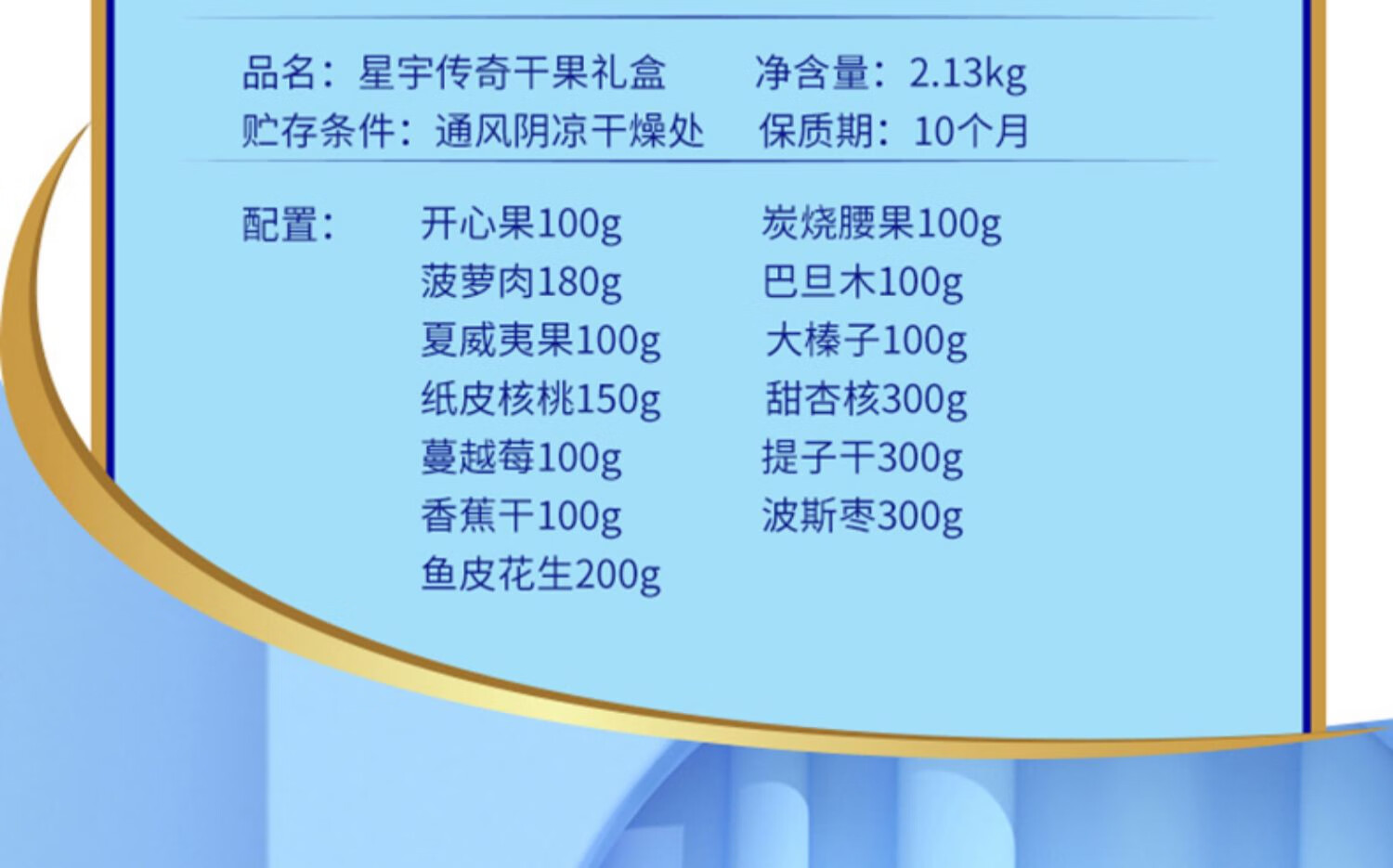 配置:开心果100g 炭烧腰果100g 菠萝肉180g 巴旦木100g 夏威夷果100g 大榛子100g 纸皮核桃150g 甜杏核300g 蔓越莓100g 提子干300g 金蕉干100g 波斯枣300g 鱼皮花生200g