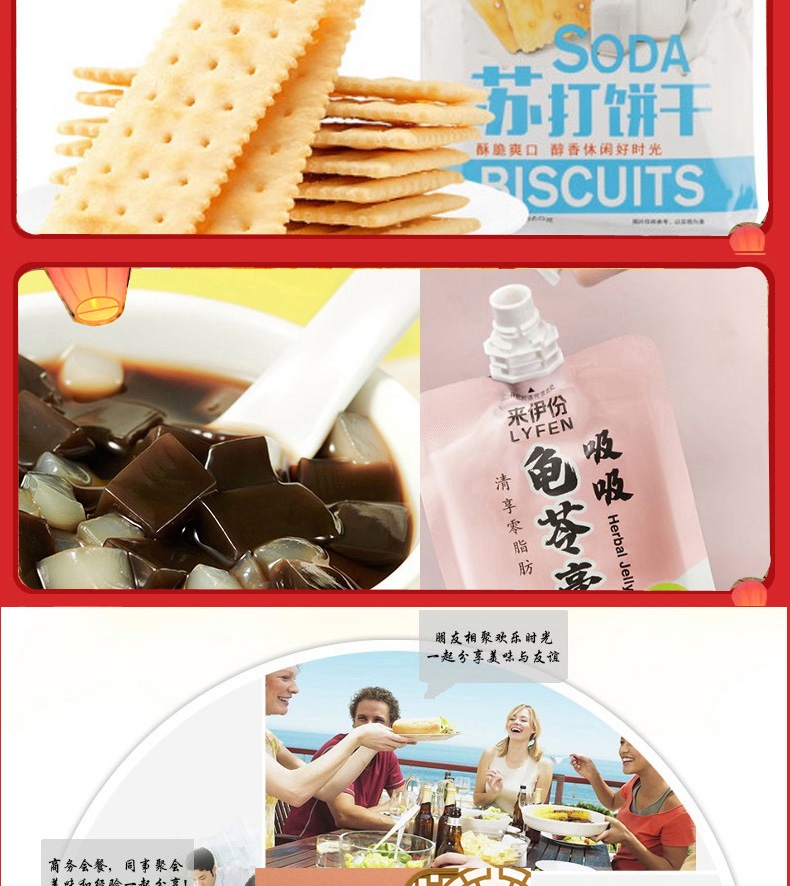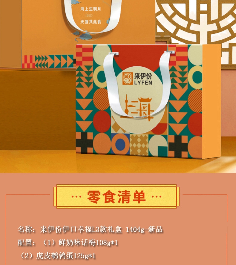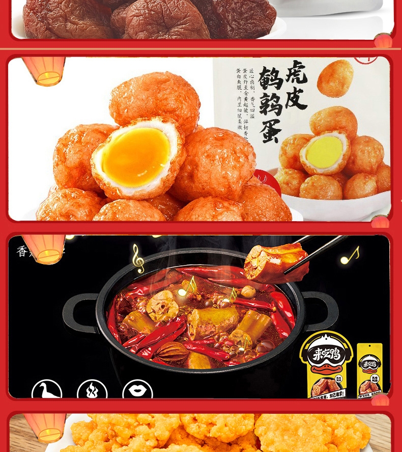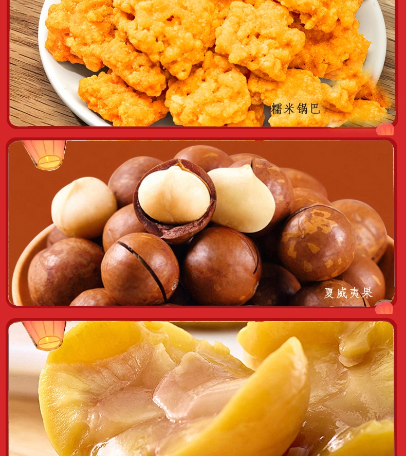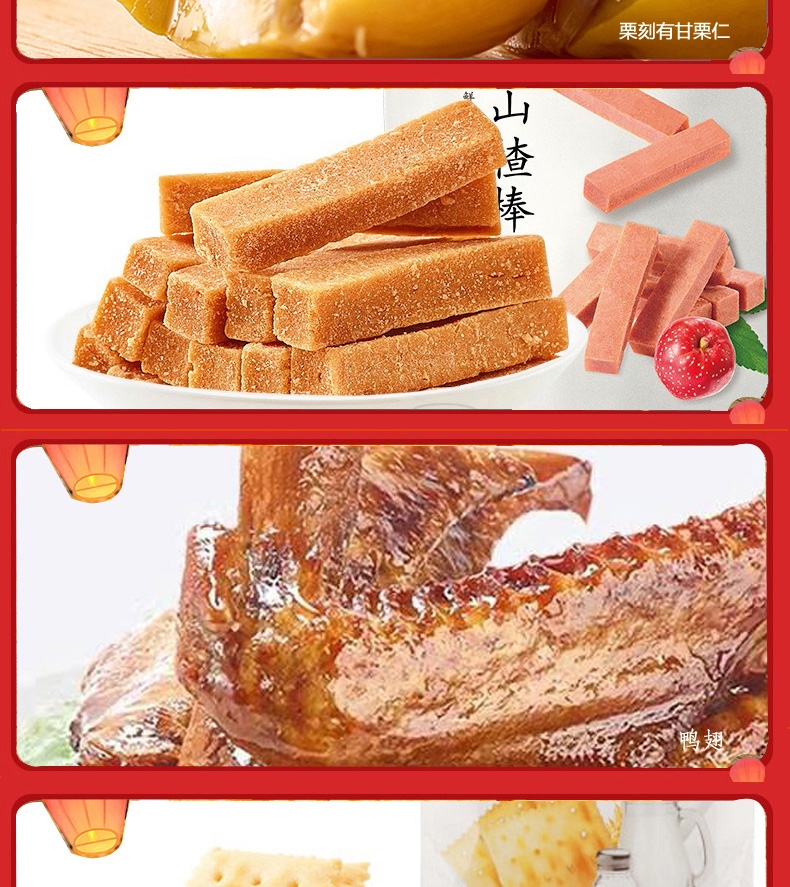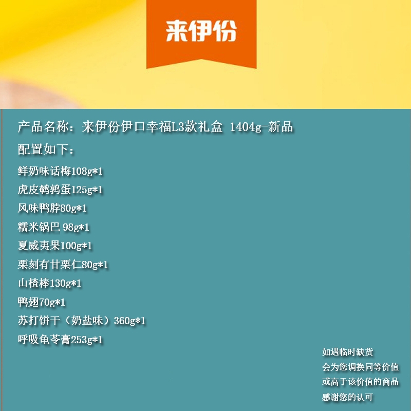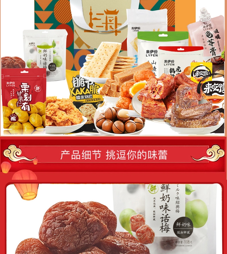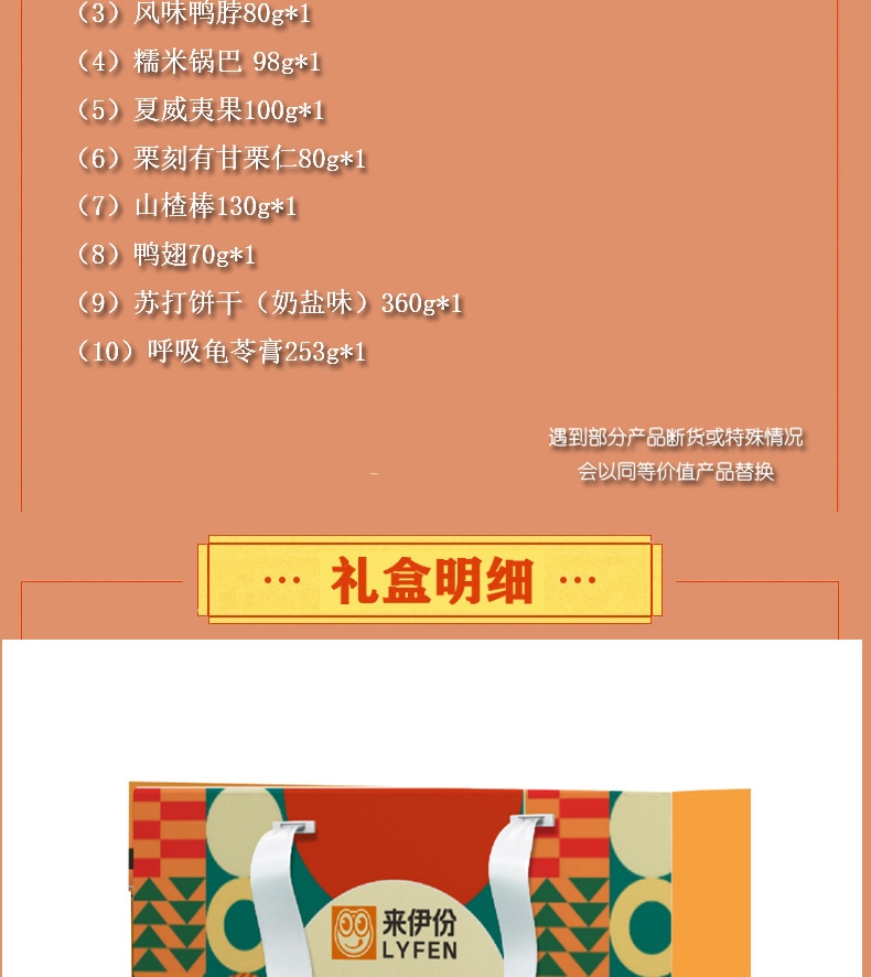 配置:鲜奶味话梅108g*1 虎皮鹌鹑蛋125g*1 风味鸭脖80g*1 糯米锅巴(蟹黄味)98g*1 夏威夷果100g*1 栗刻有甘栗仁80g*1 山楂棒130g*1 鸭翅70g*1 苏打饼干(奶盐味)360g*1 呼吸龟苓膏253g*1
