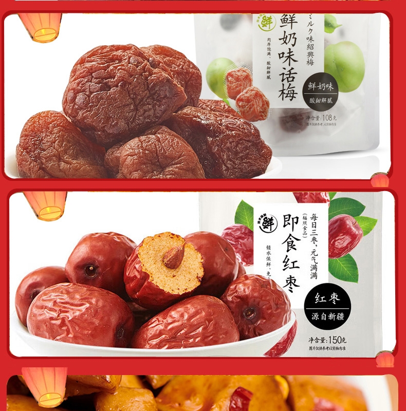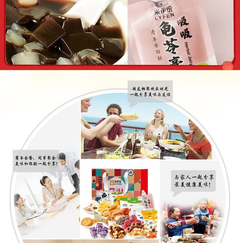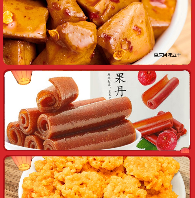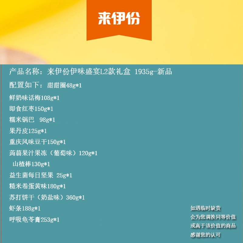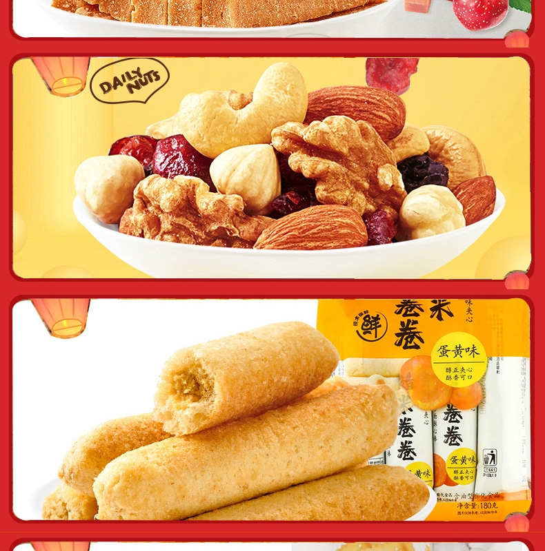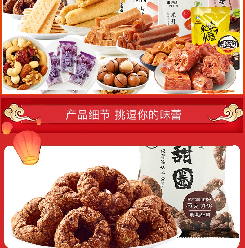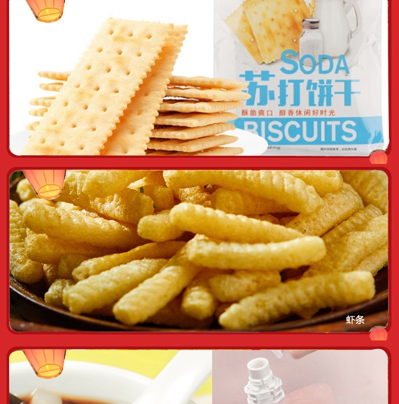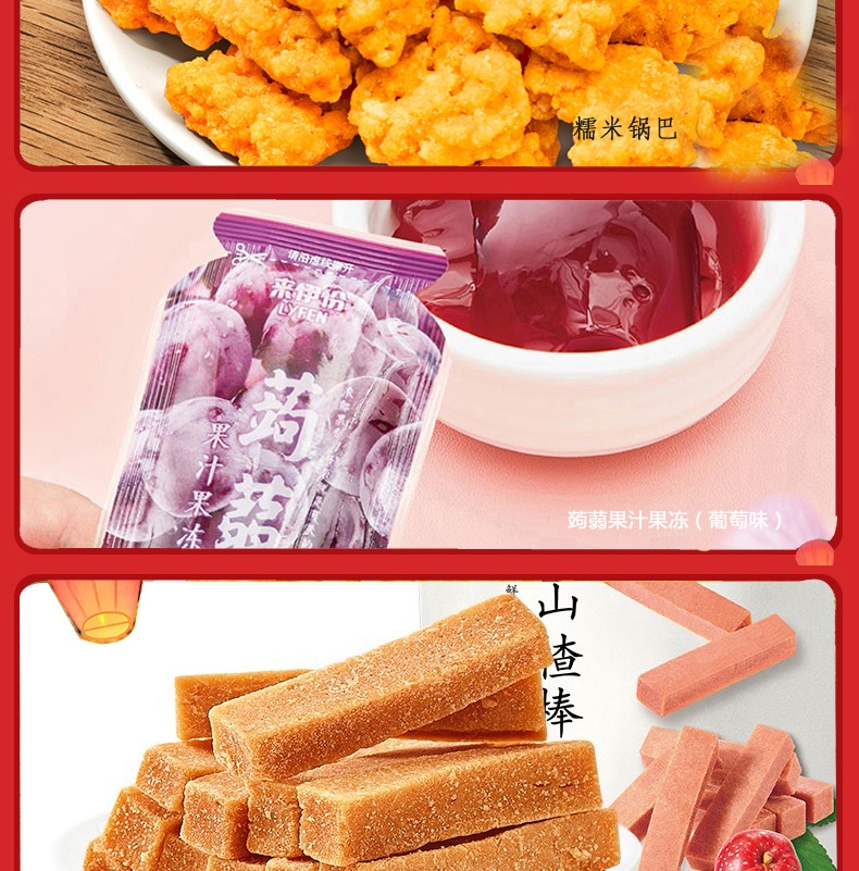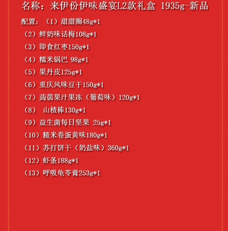 配置:甜甜圈48g*1 鲜奶味话梅108g*1 即食红枣150g*1 糯米锅巴(蟹黄黄味)98g*1 果丹皮125g*1 重庆风味豆干150g*1 蒟蒻果汁果冻(葡萄味)120g*1 山楂棒130g*1 益生菌每日坚果 25g*1 糙米卷蛋黄味180g*1 苏打饼干(奶盐味)360g*1 虾条188g*1 呼吸龟苓膏253g*1
