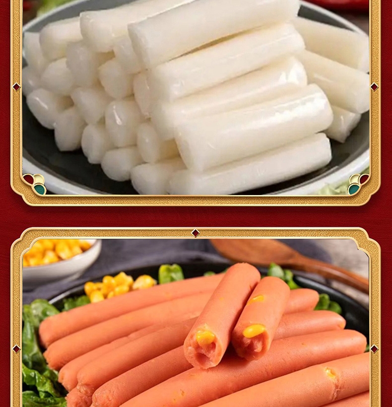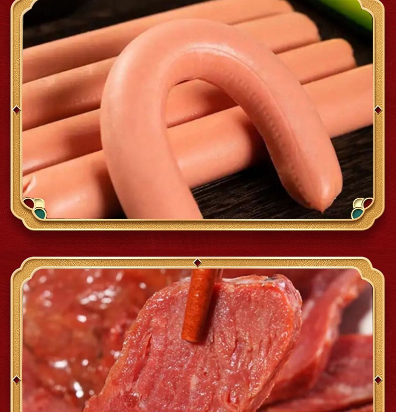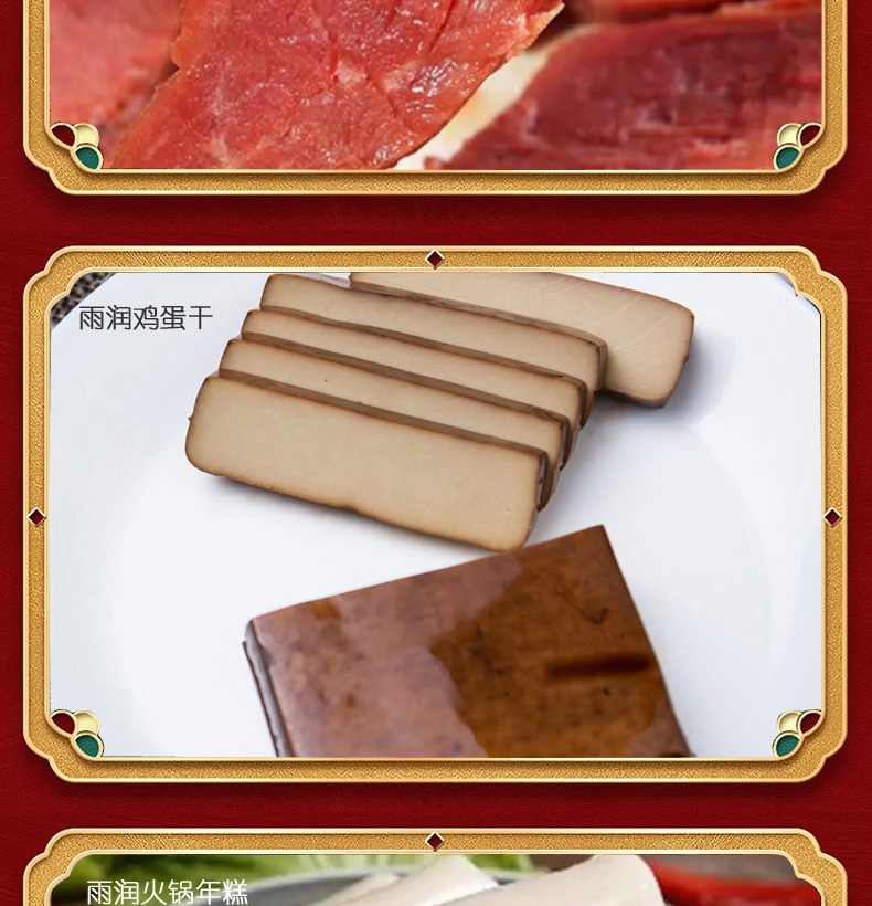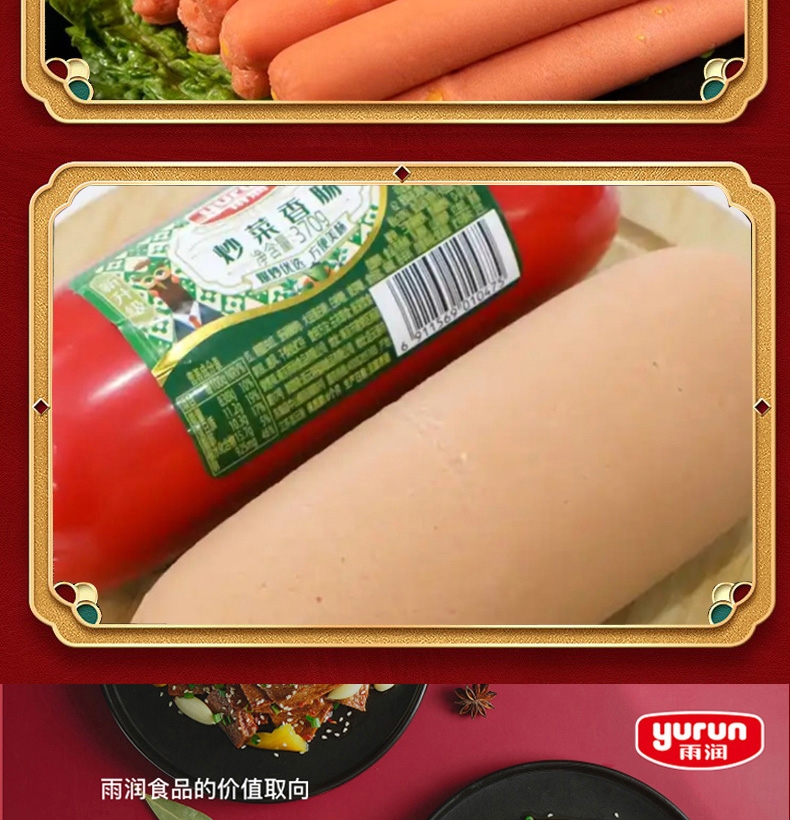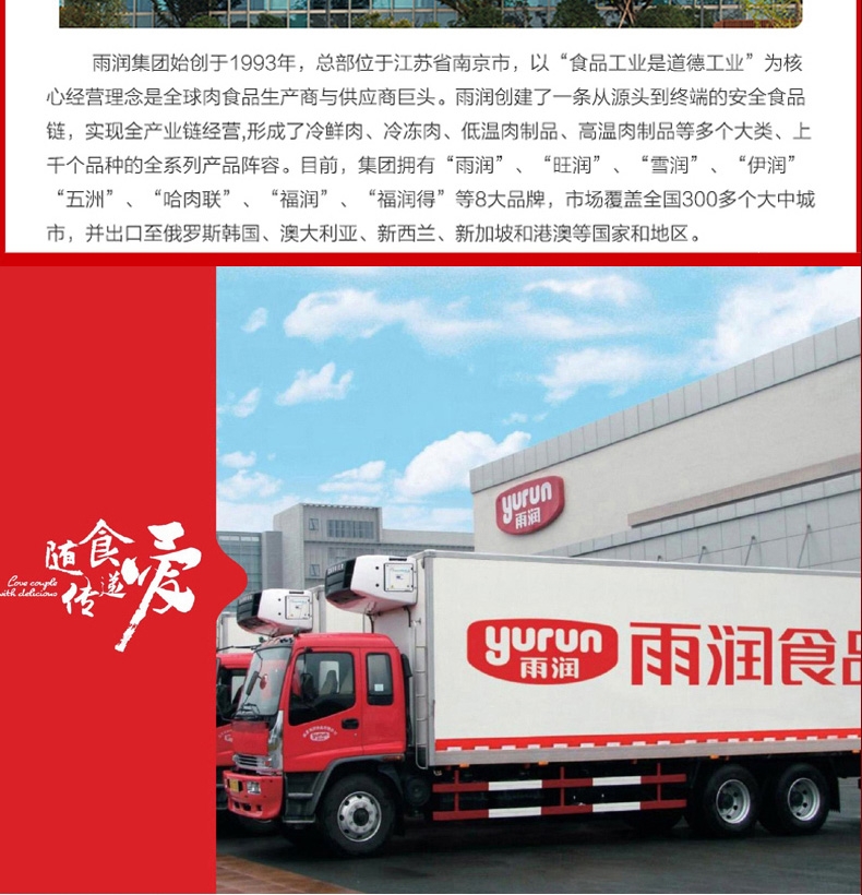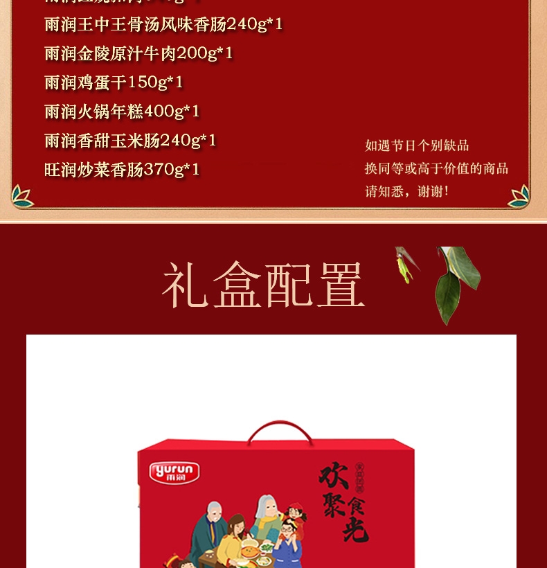 配置:雨润高汤猪蹄280g*1 雨润红烧扣肉340g*1 雨润王中王骨汤风味香肠240g*1 雨润金陵原汁牛肉200g*1 雨润鸡蛋干150g*1 雨润火锅年糕400g*1 雨润香甜玉米肠240g*1 旺润炒菜香肠370g*1