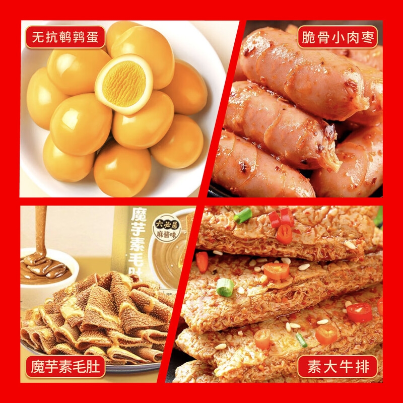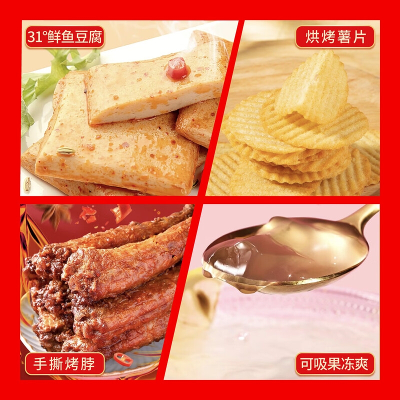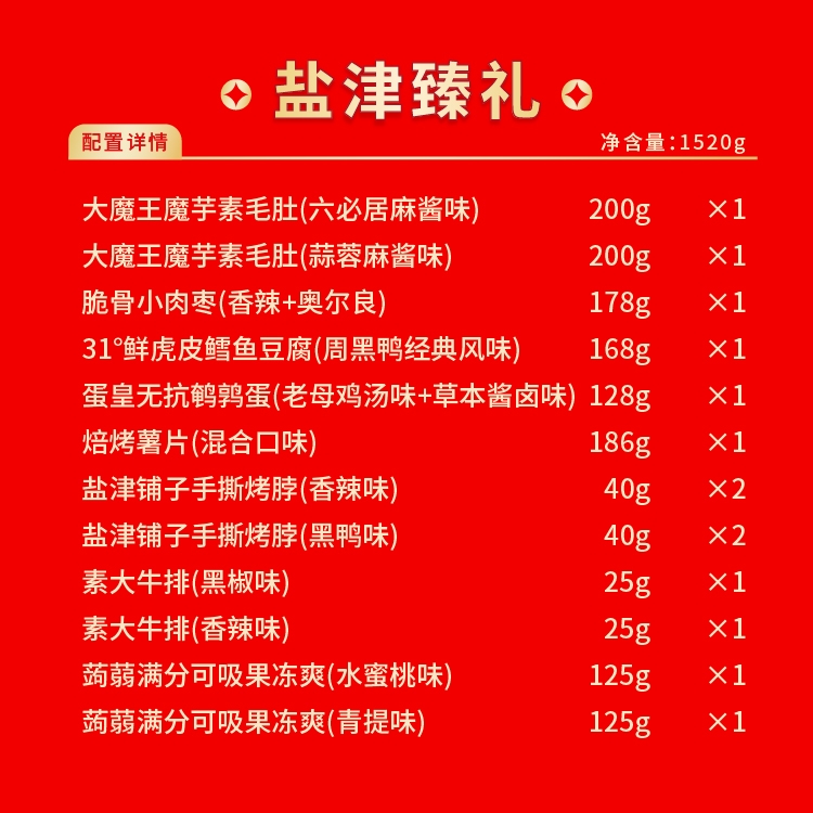 配置:200g大魔王魔芋素毛肚(六必居麻酱味)*1 200g大魔王魔芋素毛肚(香辣麻酱味)*1或200g大魔王魔芋素毛肚(蒜蓉麻酱味)*1 178g脆骨小肉枣(香辣+奥尔良)*1 168g31°鲜虎皮鳕鱼豆腐(周黑鸭经典风味)*1 128g蛋皇无抗鹌鹑蛋(老母鸡汤味+草本酱卤味)*1 186g焙烤薯片(混合口味)*1 40g盐津铺子手撕烤脖(香辣味)*2 40g盐津铺子手撕烤脖(黑鸭味)*2 25g素大牛排(黑椒味)*1 25g素大牛排(香辣味)*1 125g蒟蒻满分可吸果冻爽(水蜜桃味)*1 125g蒟蒻满分可吸果冻爽(青提味)*1