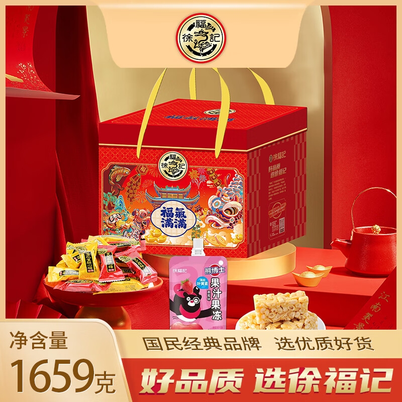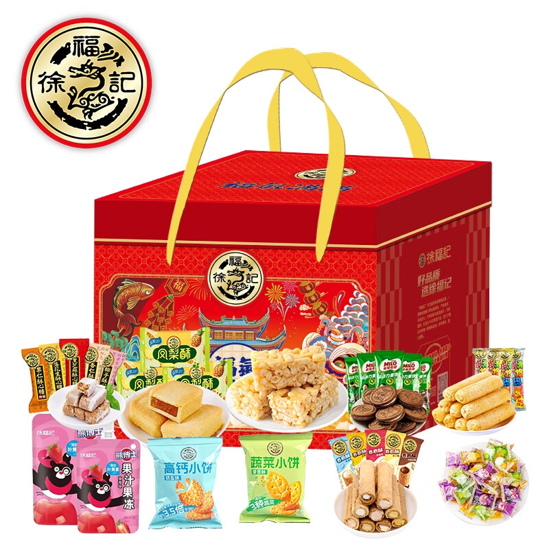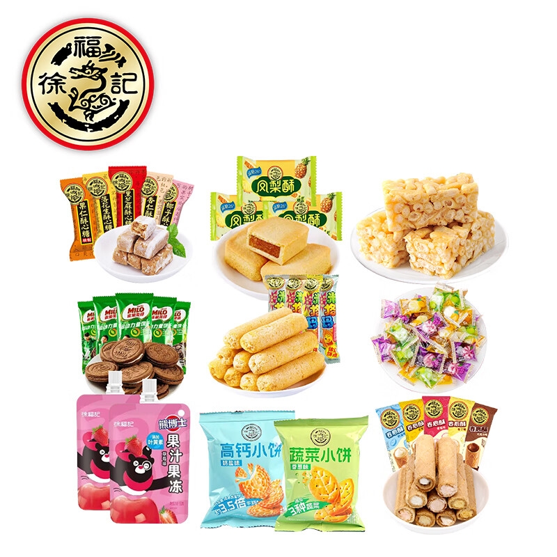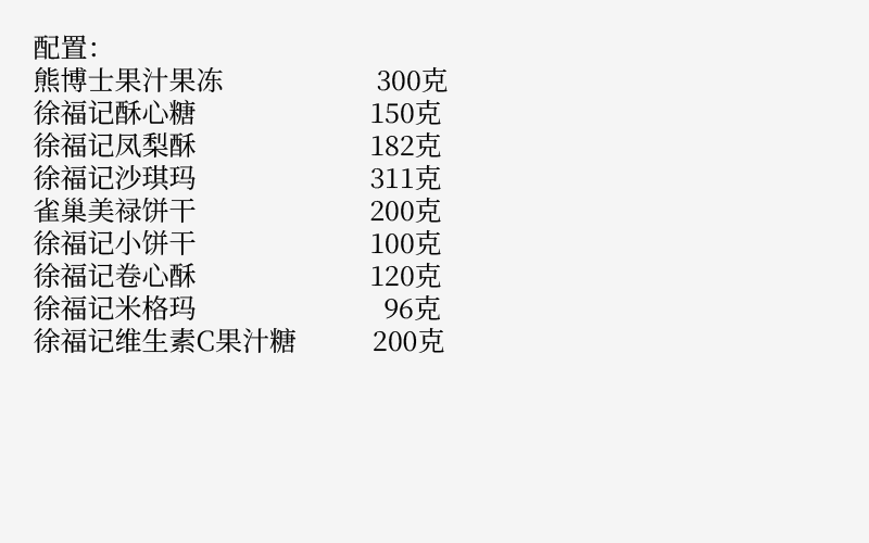 配置:熊博士果汁果冻 300克 徐福记酥心糖 150克 徐福记凤梨酥 182克 徐福记沙琪玛 311克 雀巢美禄饼干 200克 徐福记小饼干 100克 徐福记卷心酥 120克 徐福记米格玛 96克 徐福记维生素C果汁糖 200克