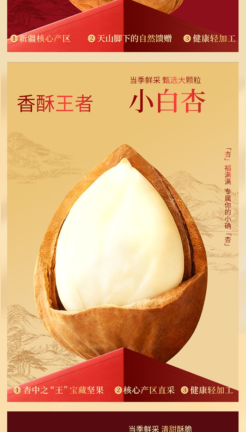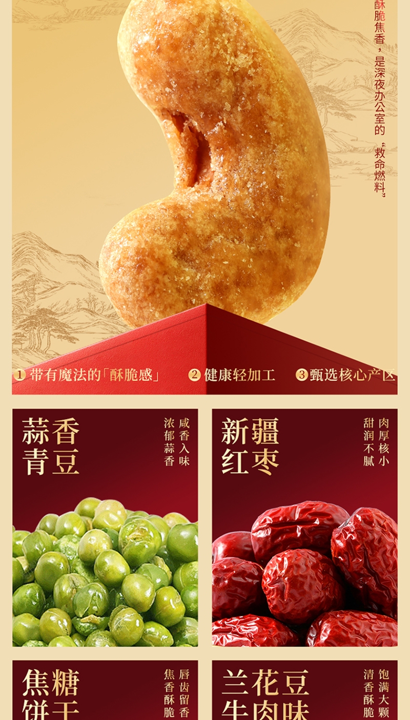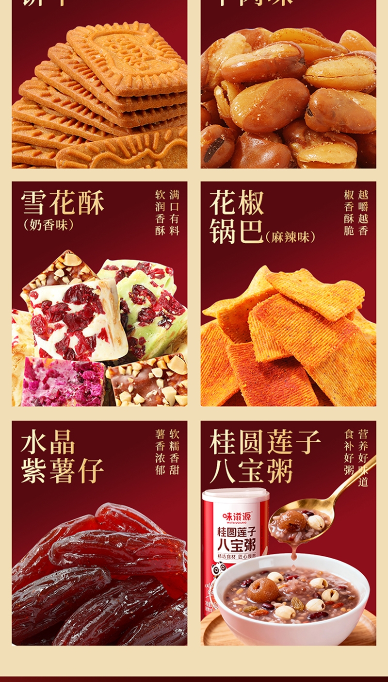 配置清单:夏威夷果100g 熟核桃100g 小白杏100g 紫薯仔150 新疆红枣200g 八宝粥320g 炭烧腰果100g 蒜香青豆188g 蚕豆188 焦糖饼干118g 花椒锅巴158g(麻辣味) 雪花酥(奶香味)125g