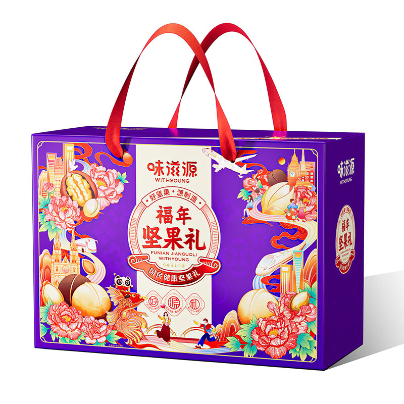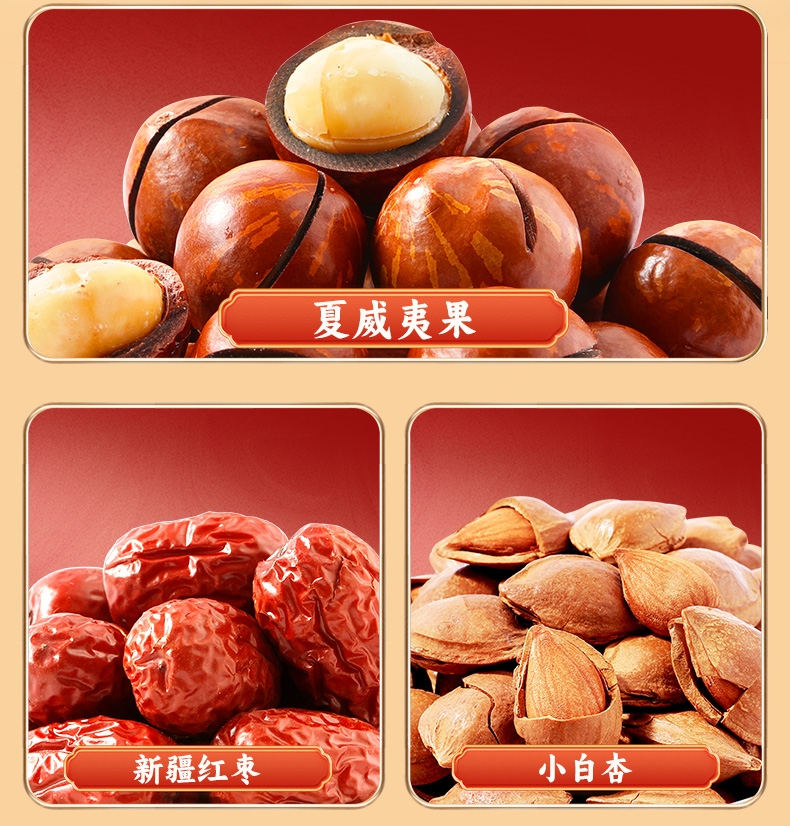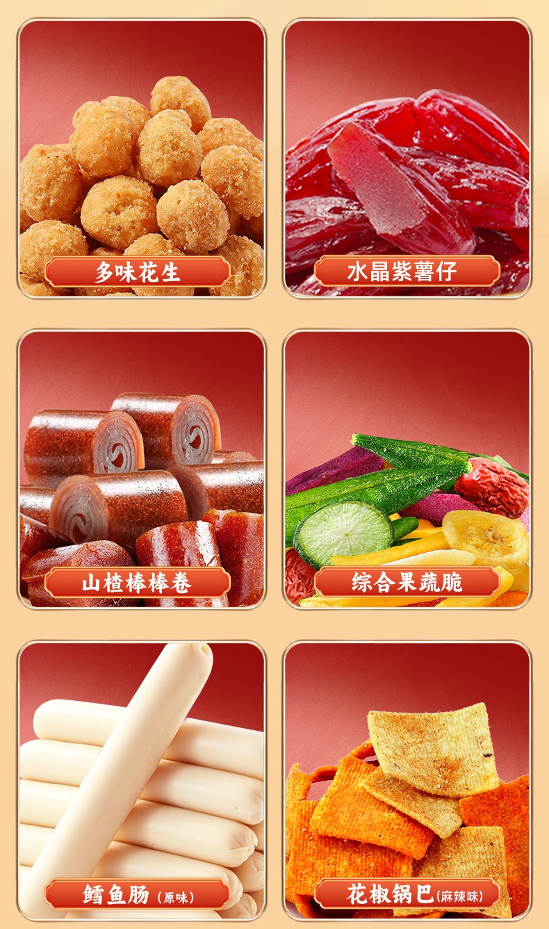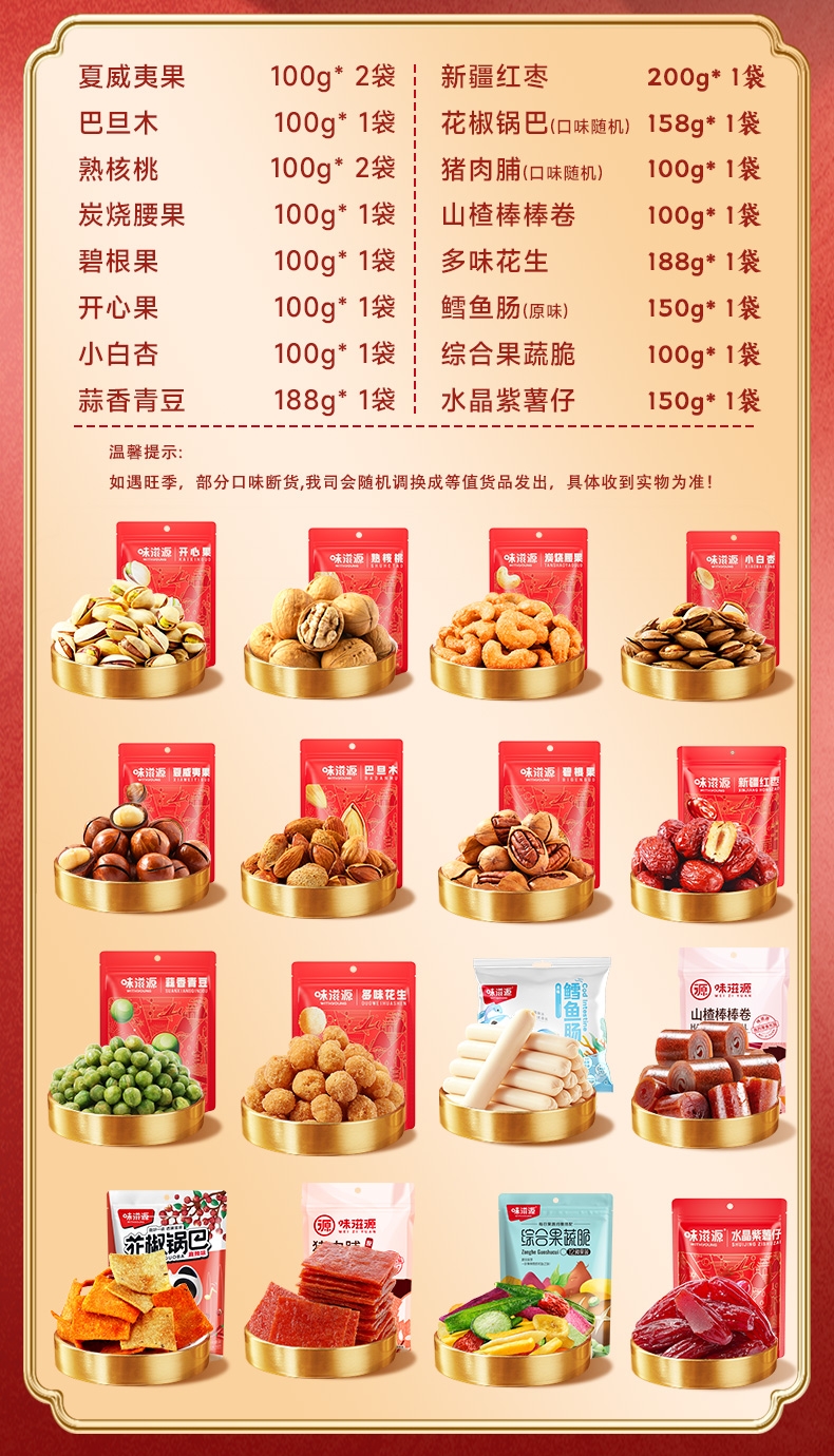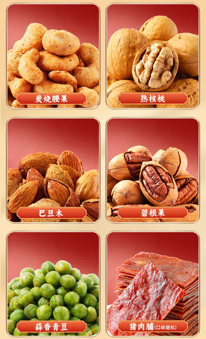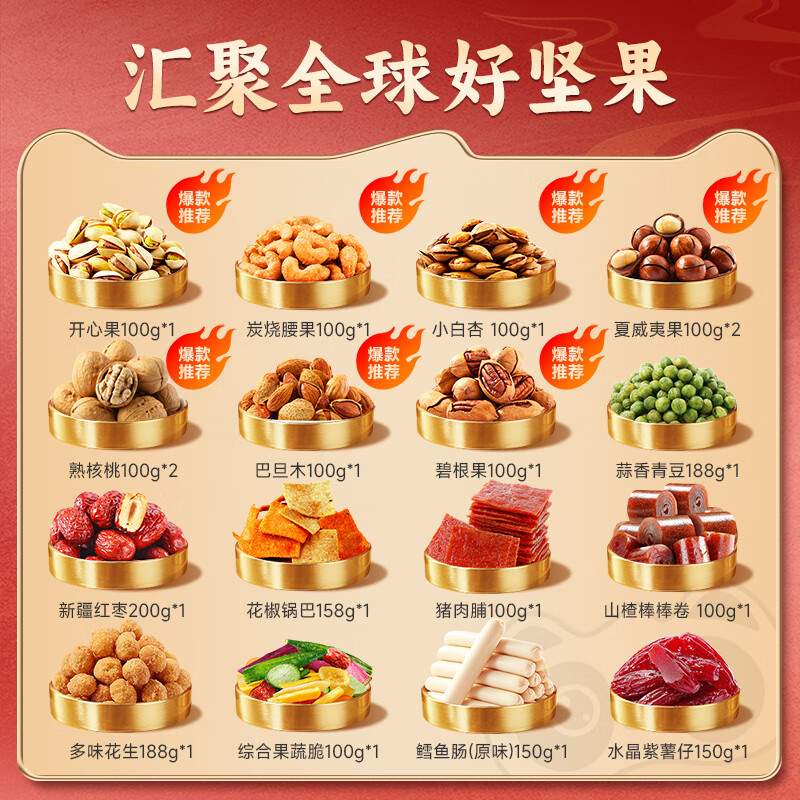 配置清单:夏威夷果100g*2 巴旦木100g 熟核桃100g*2 炭烧腰果100g 碧根果100g 开心果100g 小白杏100g 青豆188g 花椒锅巴158g 新疆红枣200g 猪肉脯100g 山楂棒棒卷100g 紫薯仔150 多味花生188g 综合果蔬脆100g 鳕鱼肠原味150g