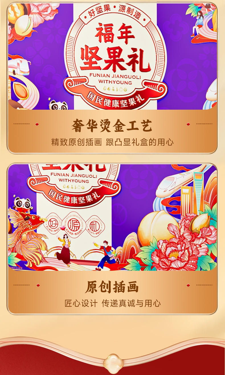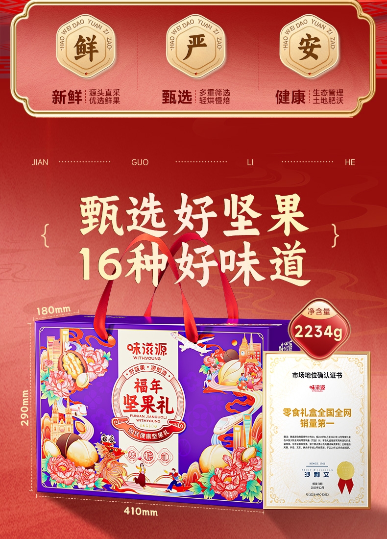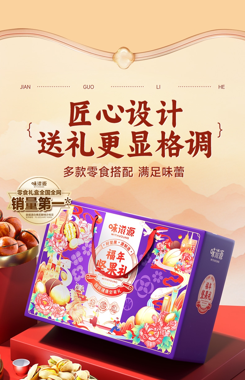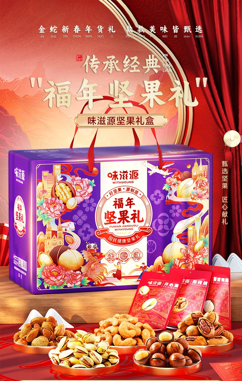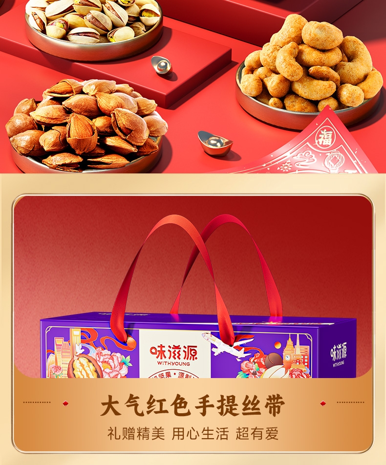配置清单:夏威夷果100g*2 巴旦木100g 熟核桃100g*2 炭烧腰果100g 碧根果100g 开心果100g 小白杏100g 青豆188g 花椒锅巴158g 新疆红枣200g 猪肉脯100g 山楂棒棒卷100g 紫薯仔150 多味花生188g 综合果蔬脆100g 鳕鱼肠原味150g