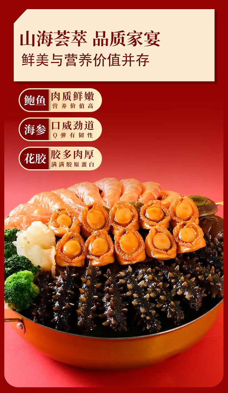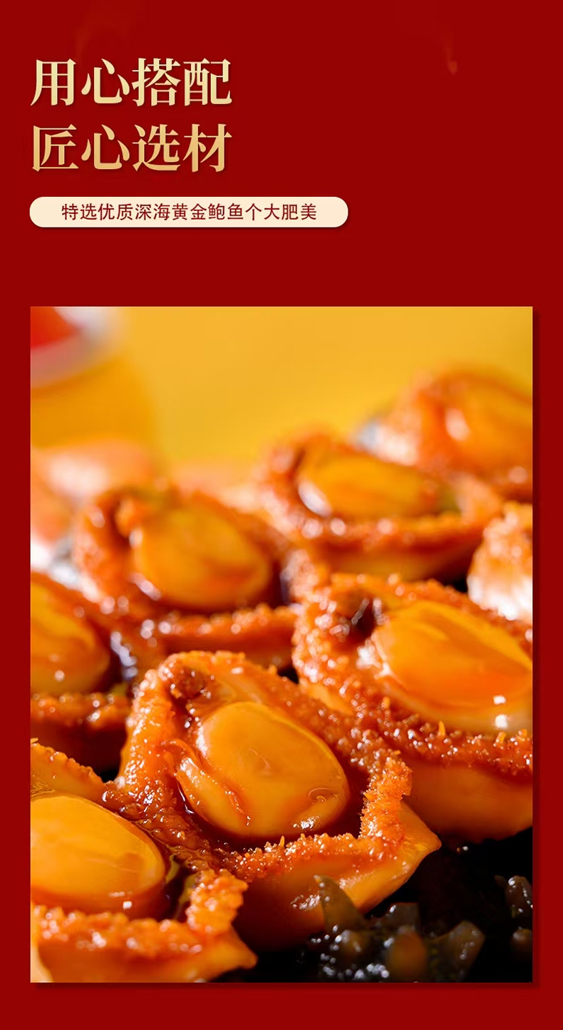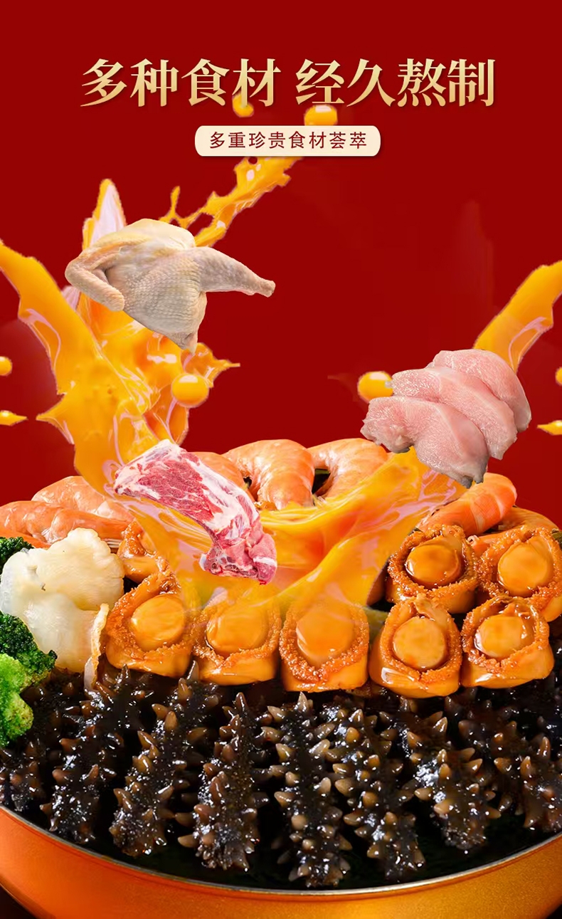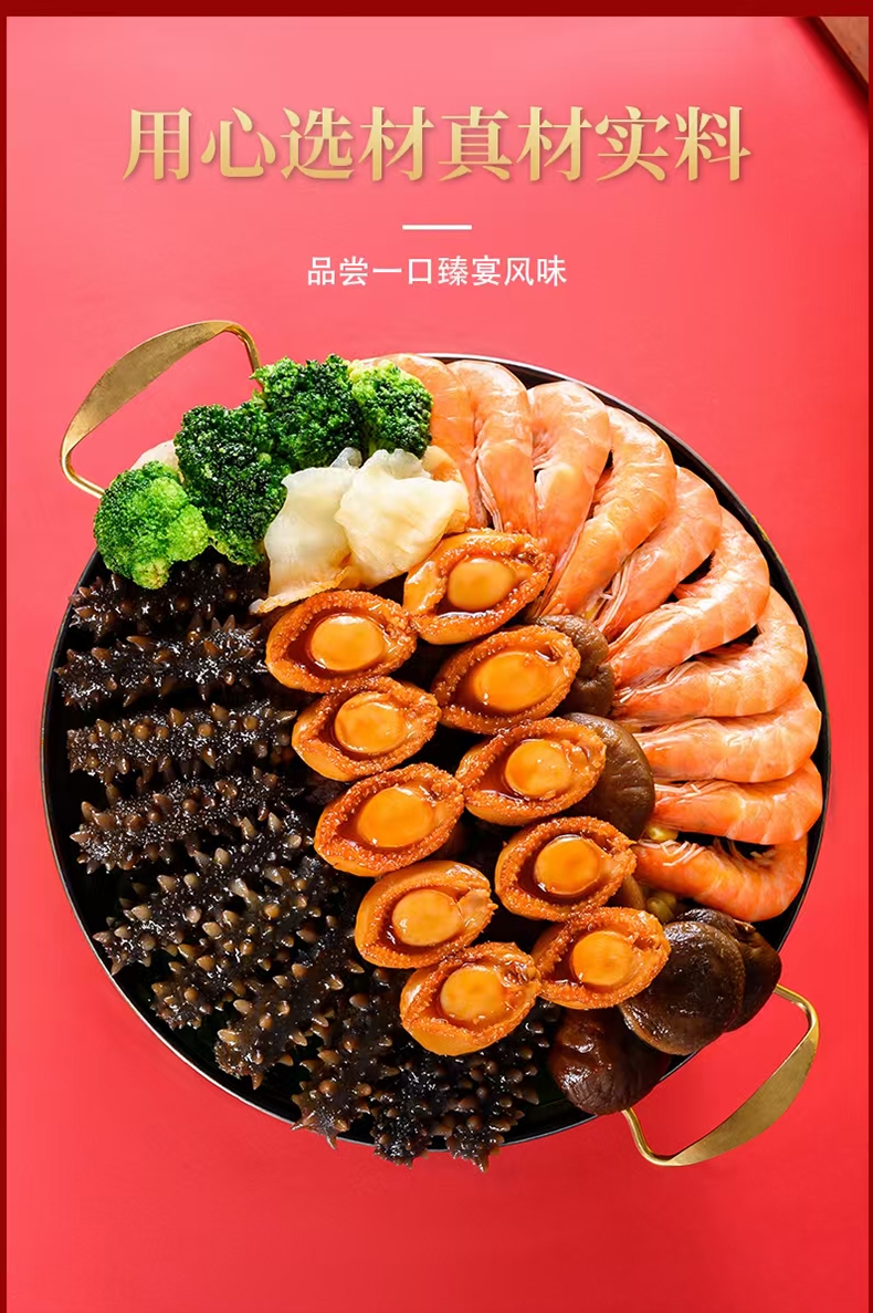 配置清单:鲍汁、海参、鲍鱼、虾、杏鲍菇、虾味丸、竹耳丝花菇、鱼胶、螺片
