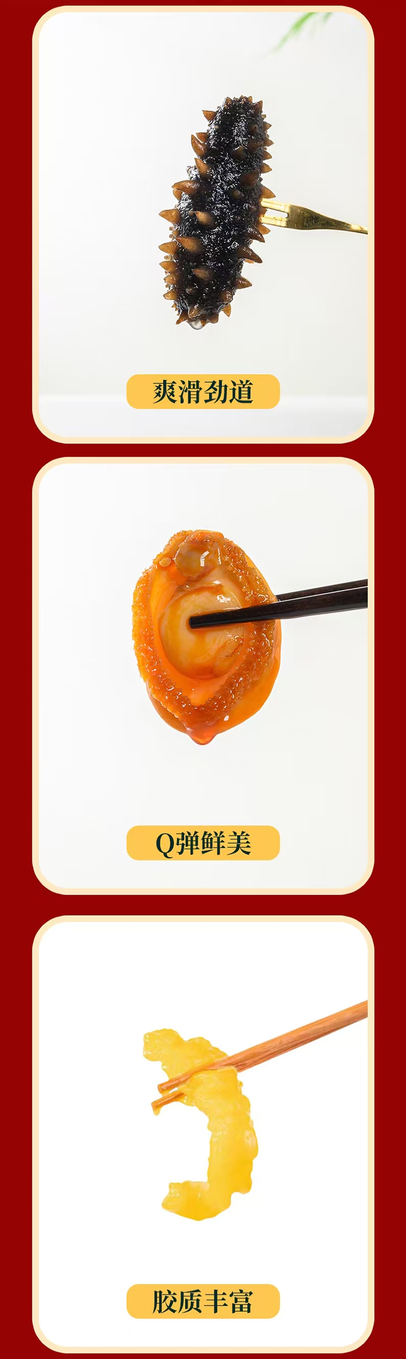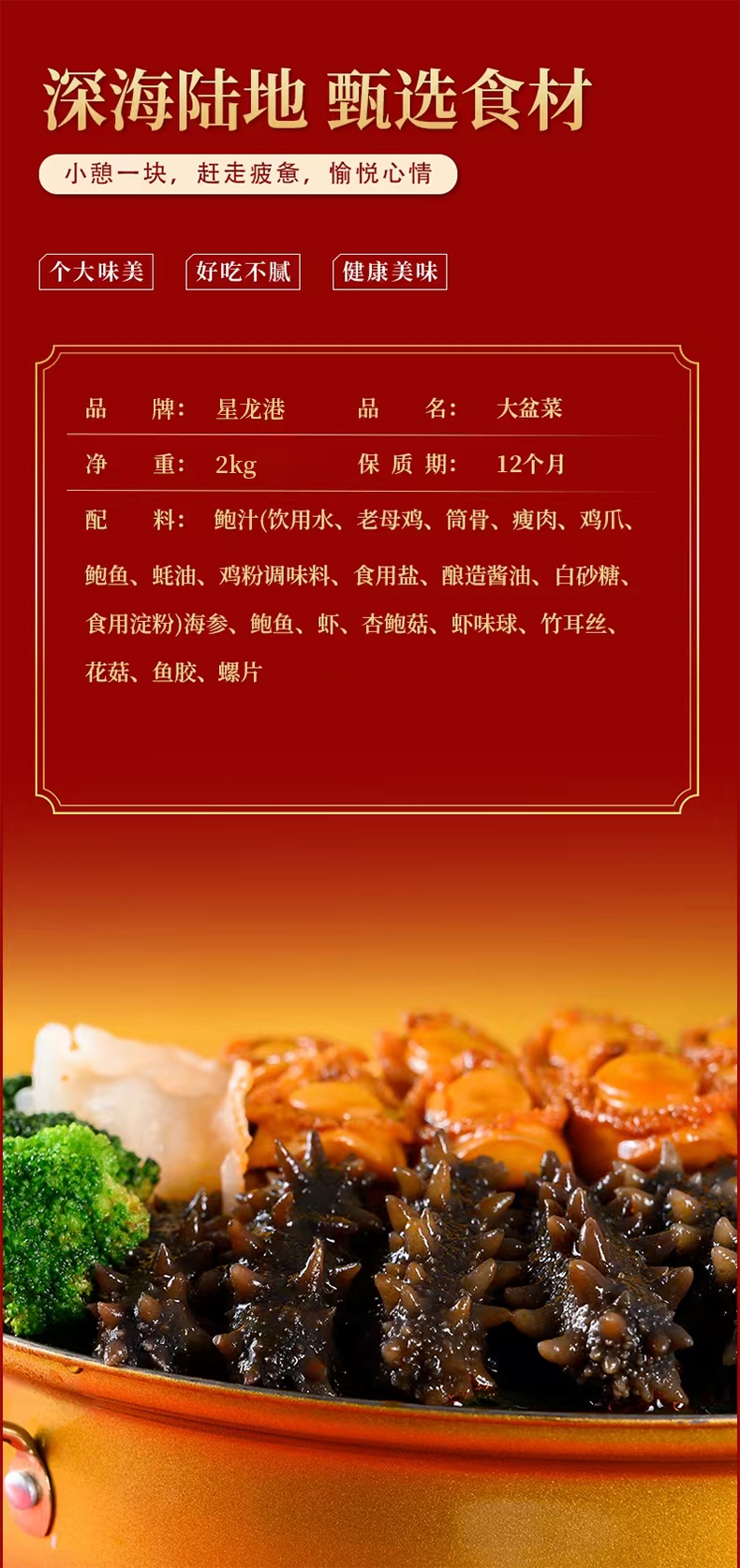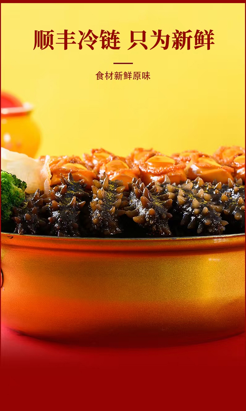 配置清单:鲍汁、海参、鲍鱼、虾、杏鲍菇、虾味丸、竹耳丝花菇、鱼胶、螺片