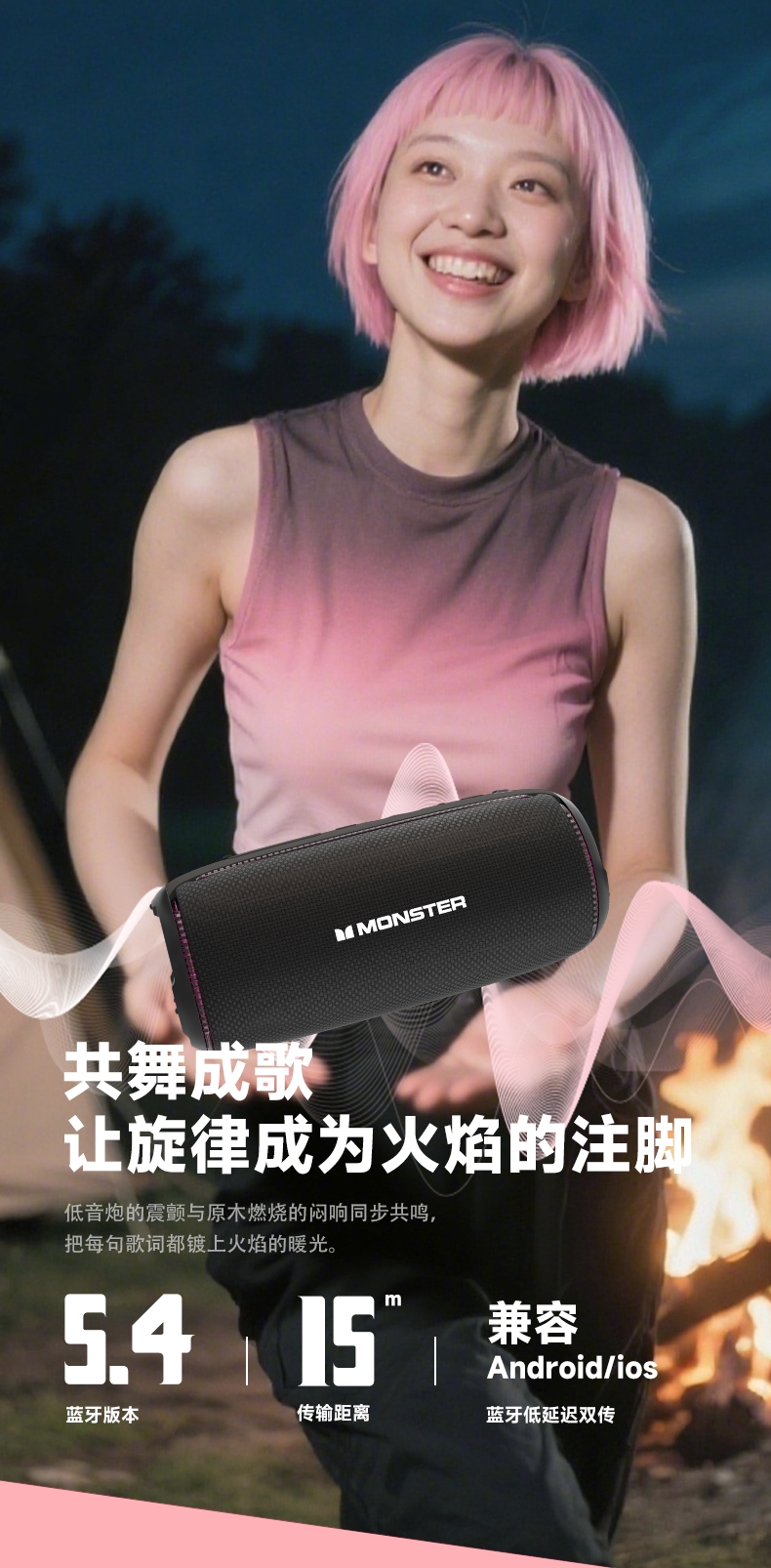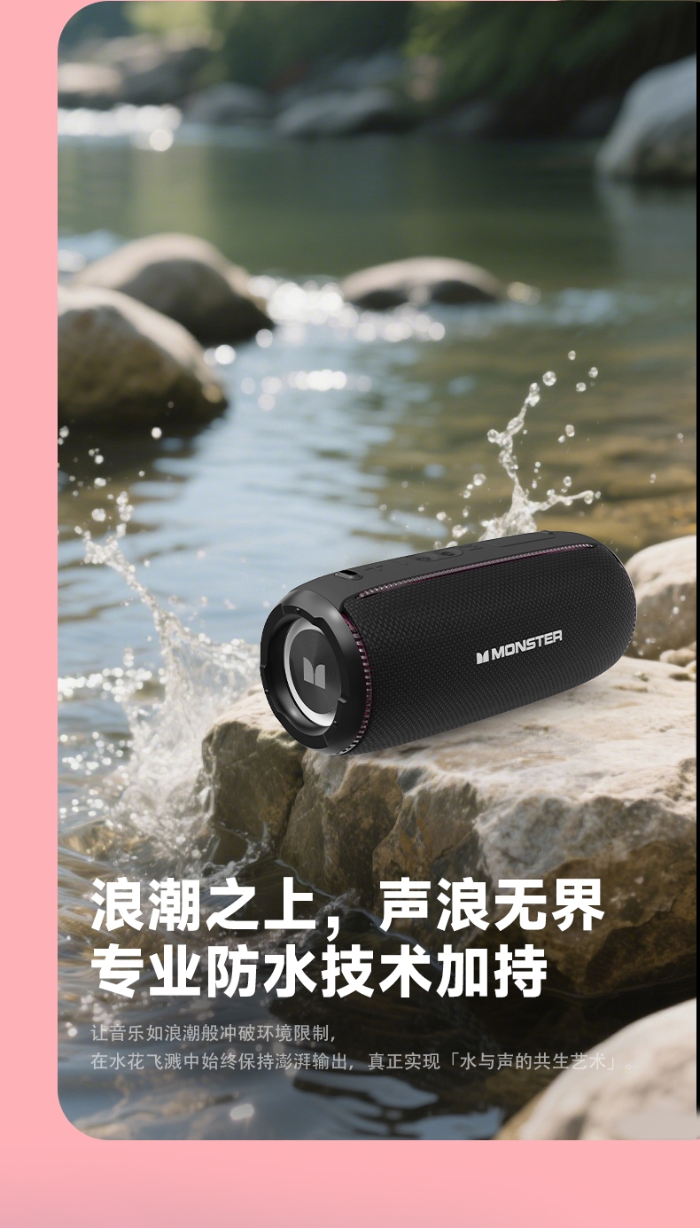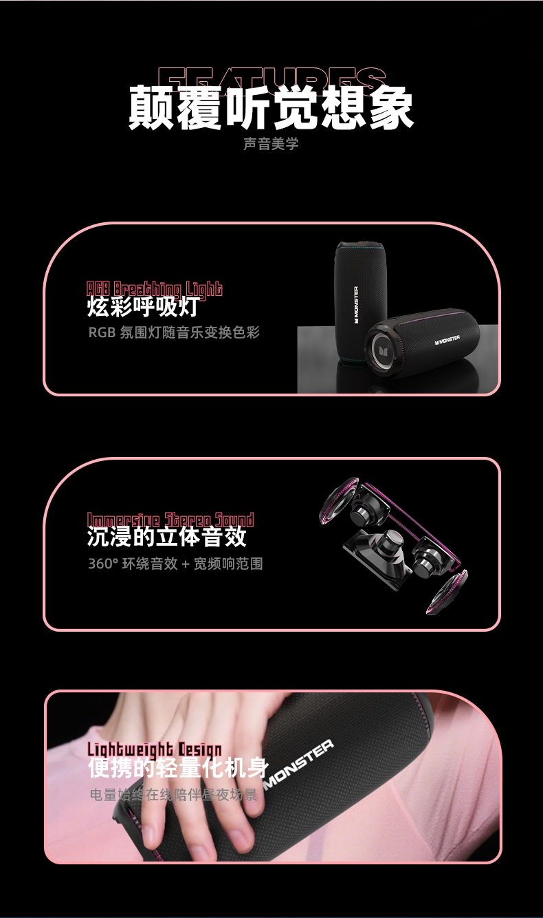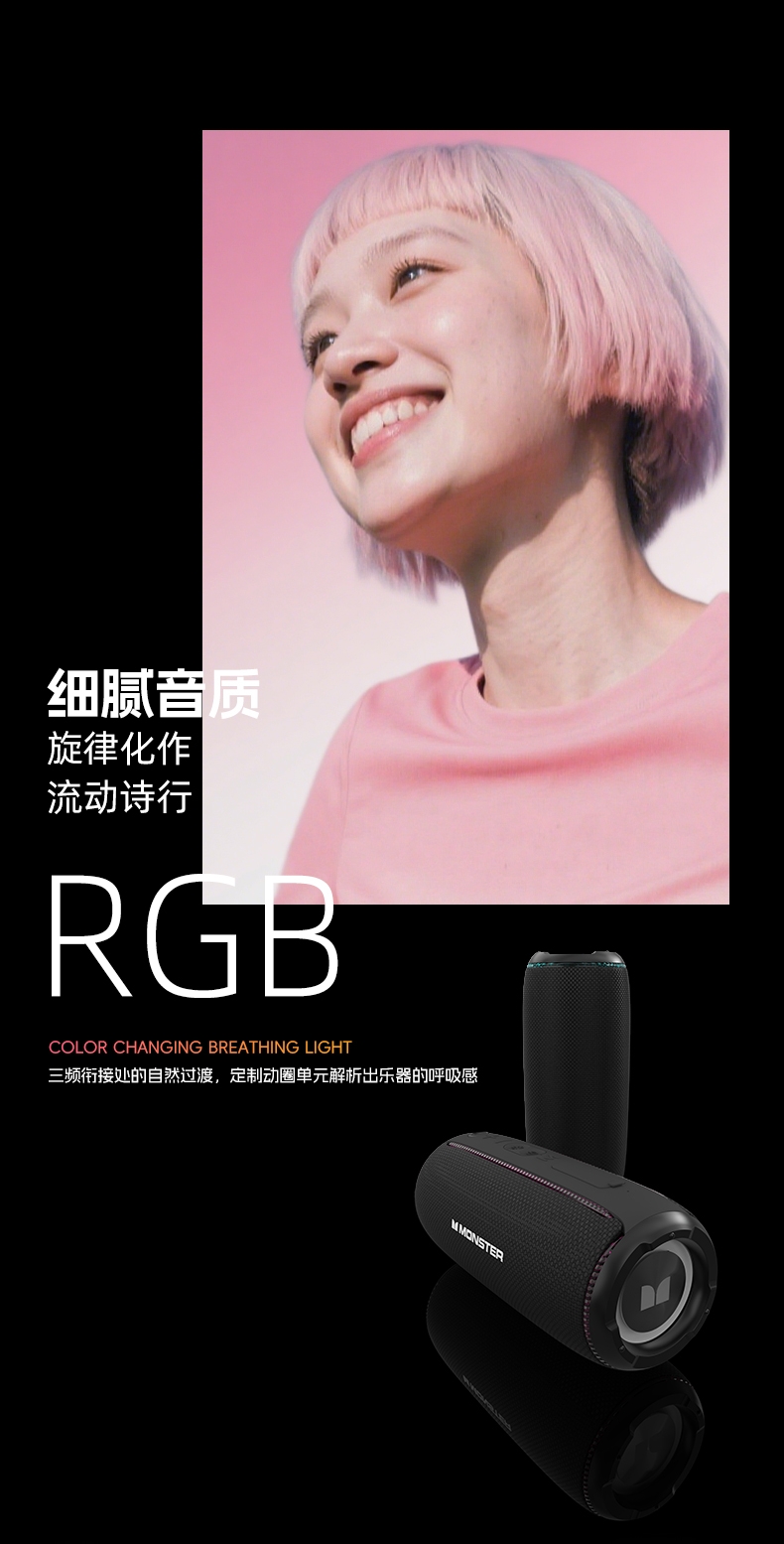 TWS互联,享受杜比环绕声;支持蓝牙、 AUX、TF卡、U盘等多种音源输入方式;大容量电池,超长继航;便携低音炮随身音乐C位担当多模式幻彩RGB灯效;全新声道系统,带来强劲低音和清晰中高音音质层次分明