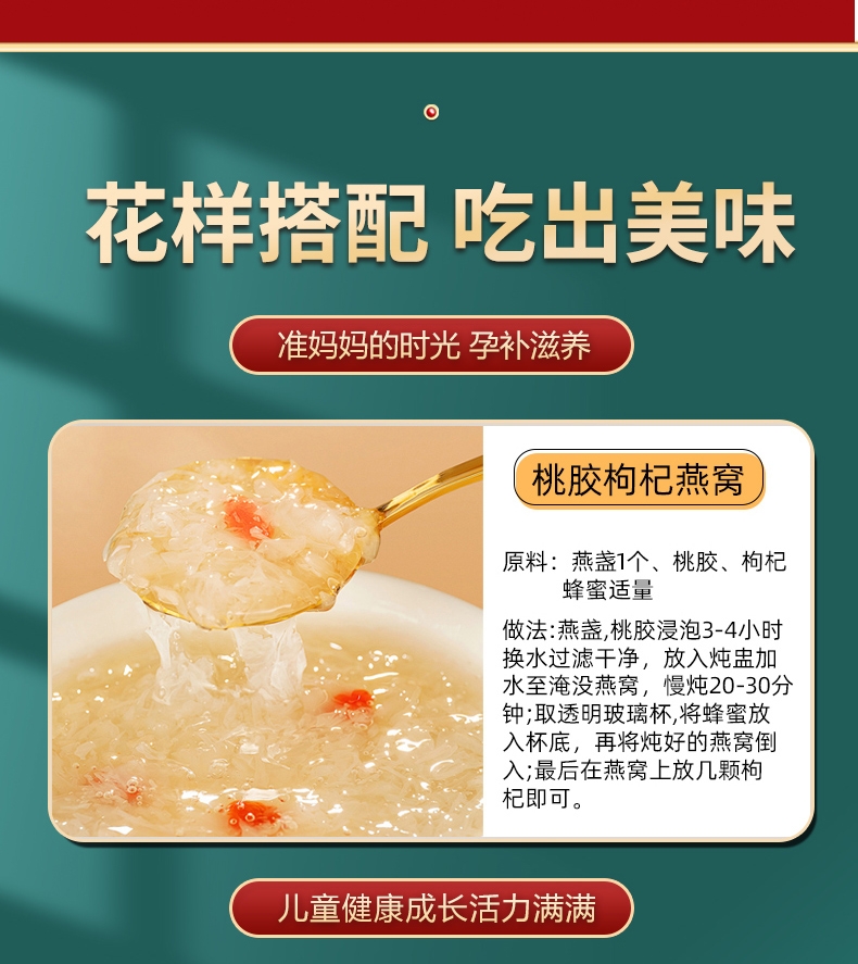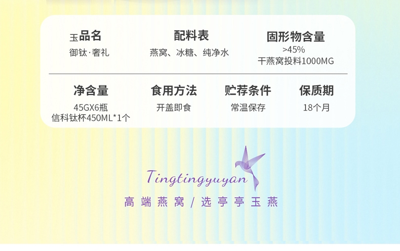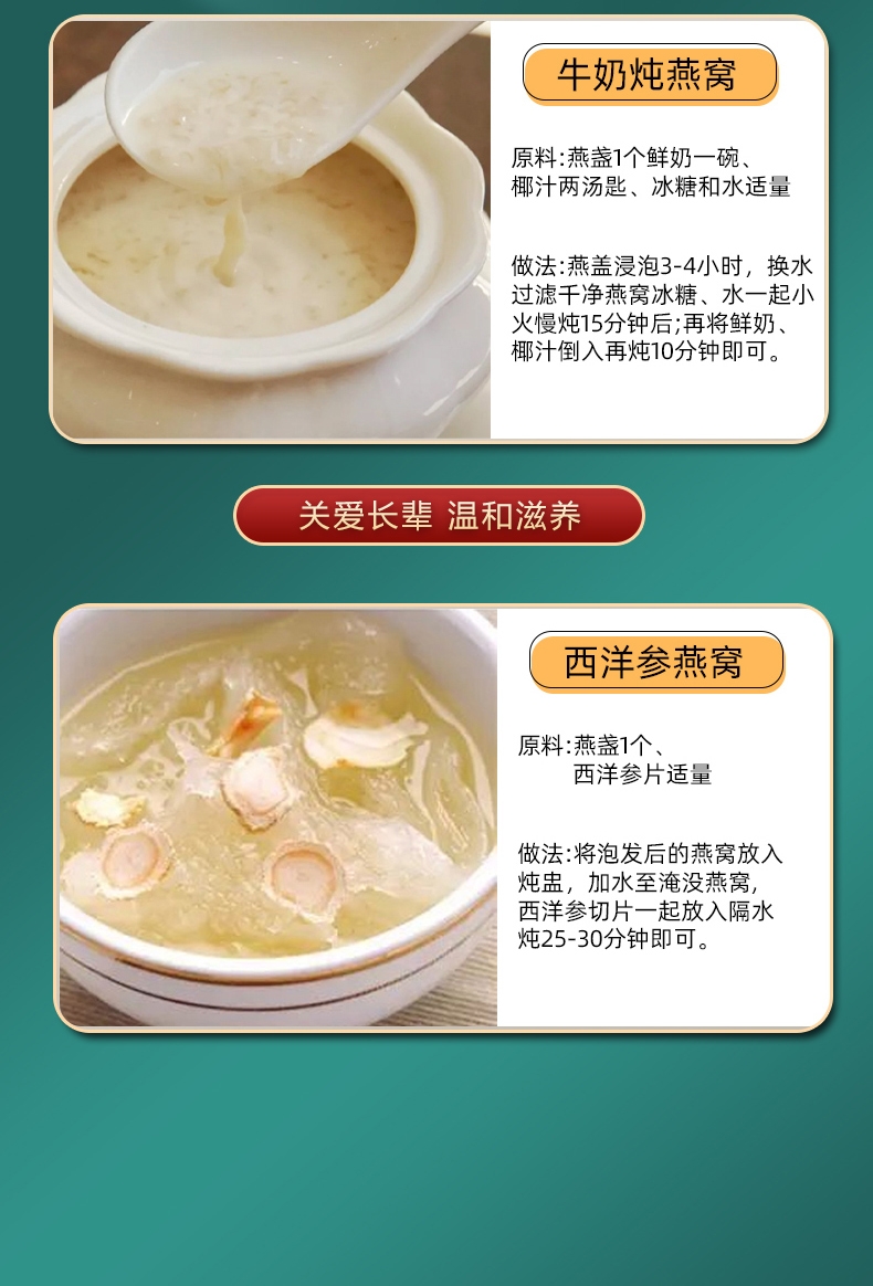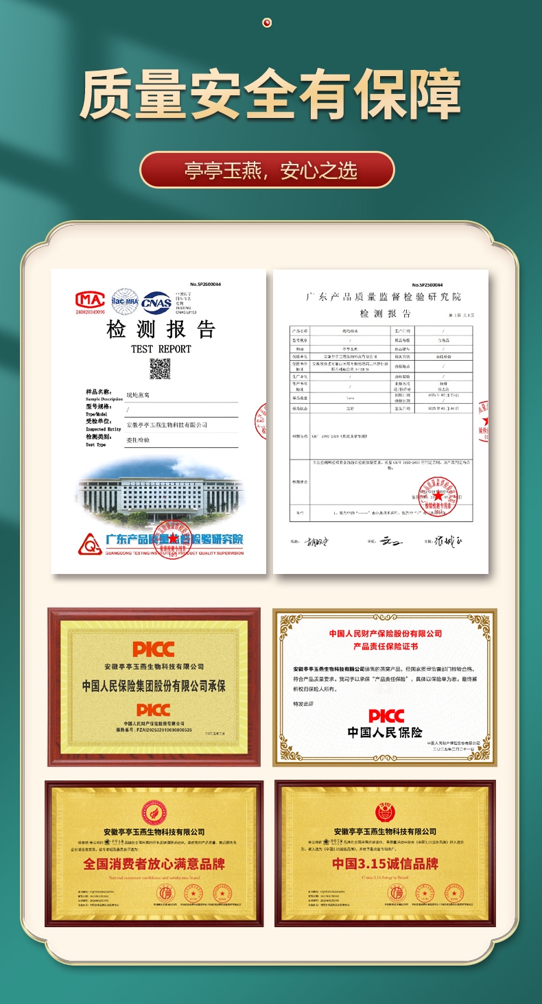 亭亭玉燕 严格甄选可溯源的上等燕窝.;结合精准控时锁鲜工艺,坚持纯手工挑毛;轻盈坚固,确保每一口饮品都纯正原味。