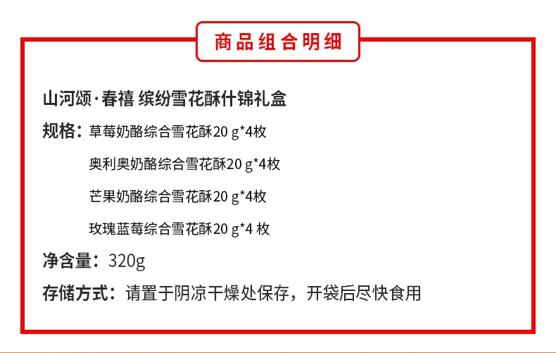 配置清单:草莓奶酪综合雪花酥20g*4 奥利奥奶酪综合雪花酥20g*4 芒果奶酪综合雪花酥20g*4 玫瑰蓝莓综合雪花酥20g*4