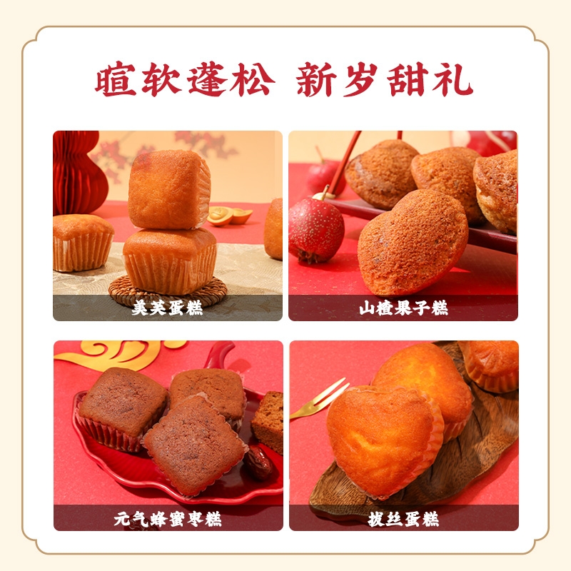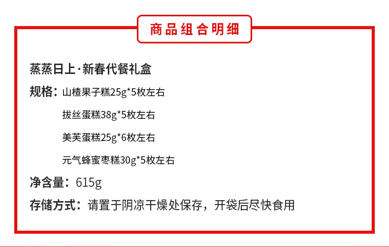 配置清单:山楂果子糕25g*5 拔丝蛋糕38g*5 美芙蛋糕25g*6 元气蜂蜜枣糕30g*5