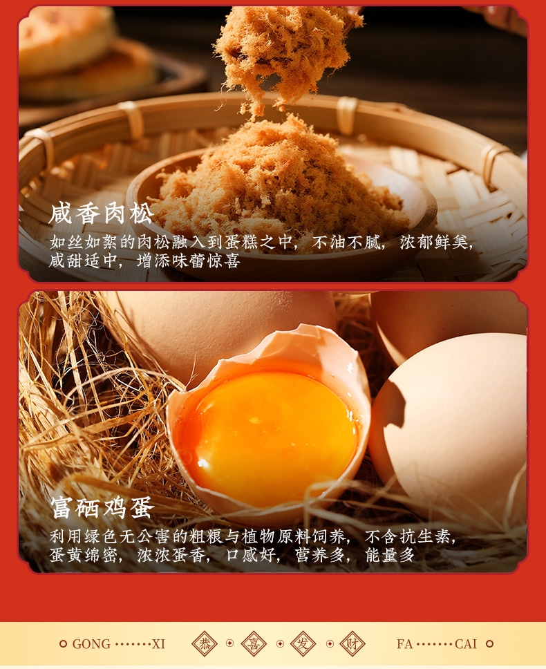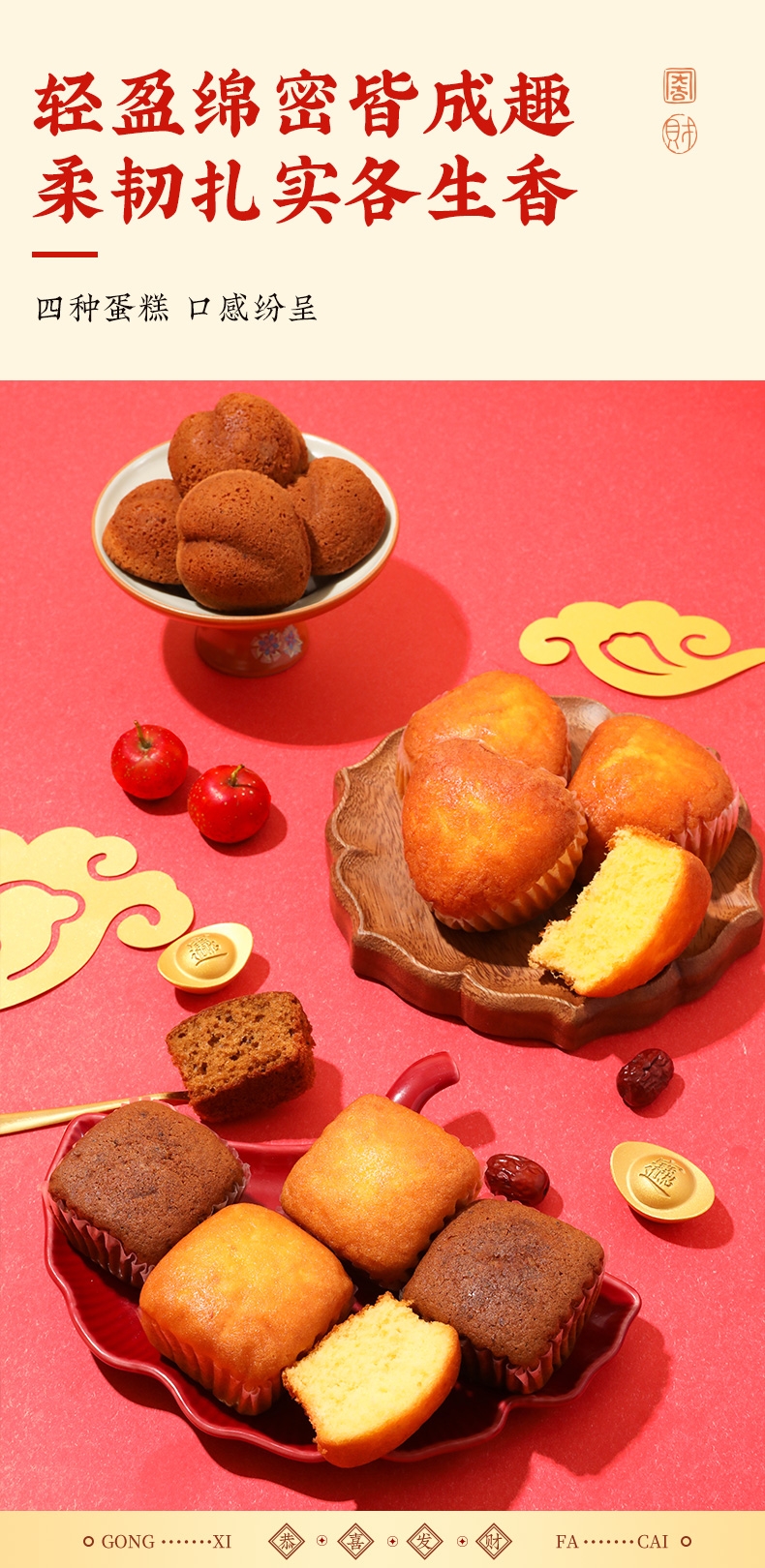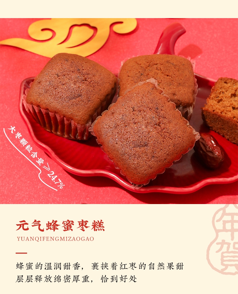 糕体暄软蓬松,不干不油,控制甜度,入口清甜;甄选安佳黄油、富硒鸡蛋、坝上牛乳、新疆红枣等食材;配料干净,不添加香精、人工合成色素、防腐剂