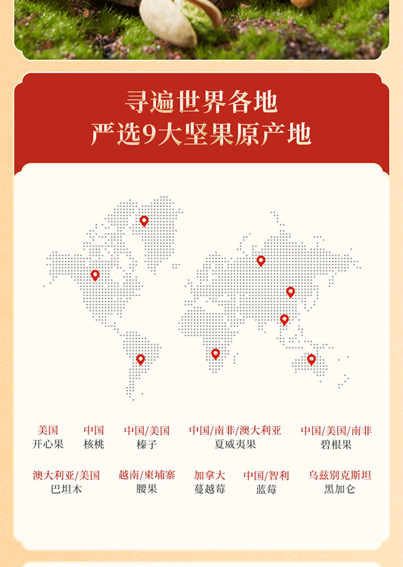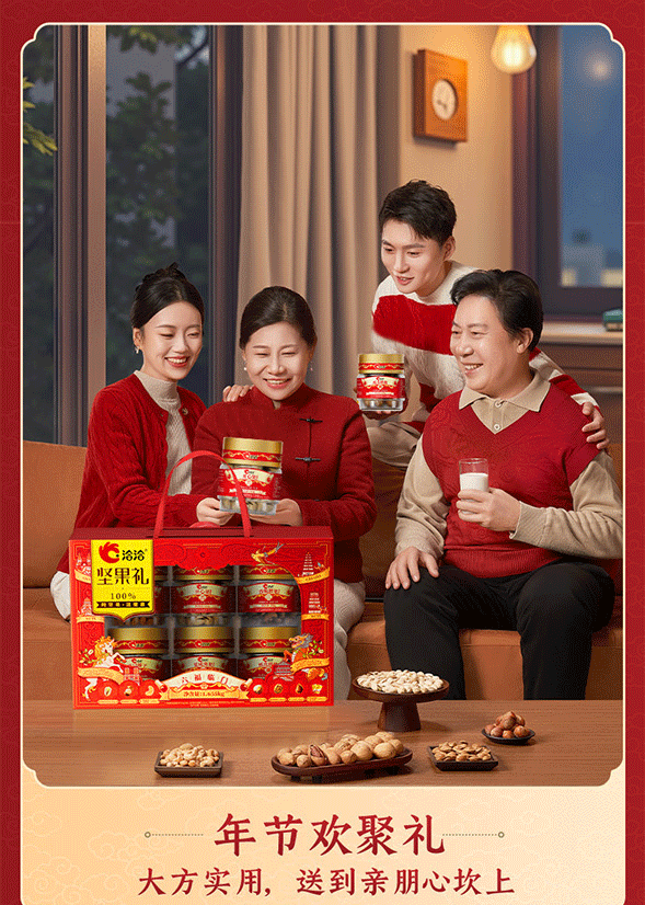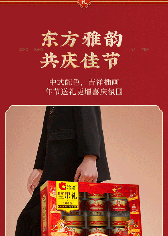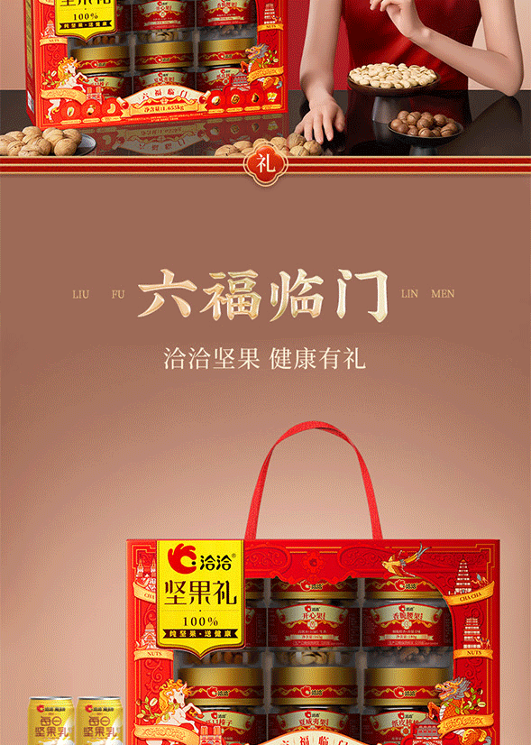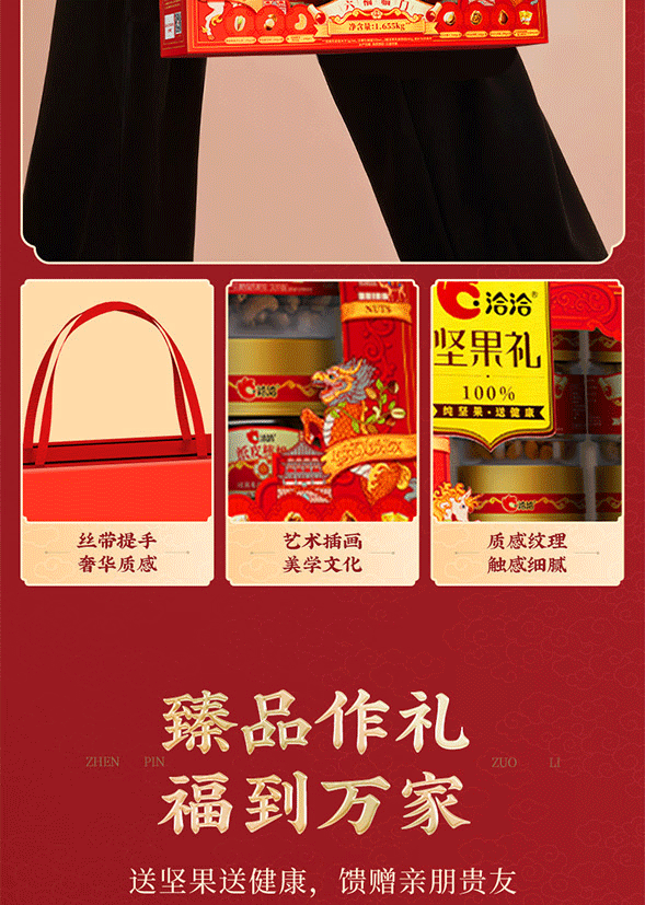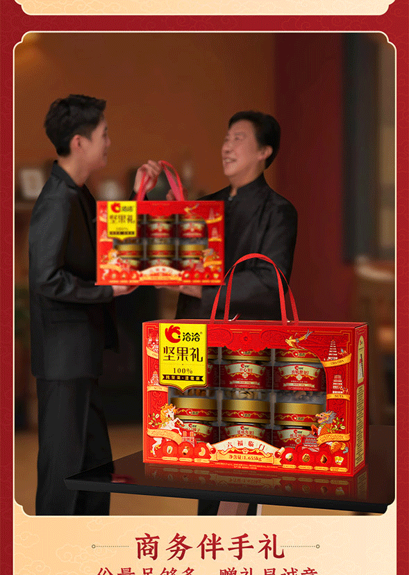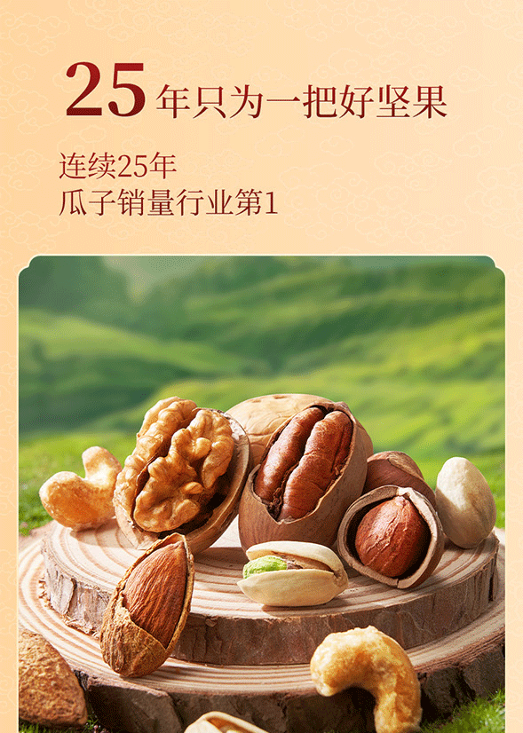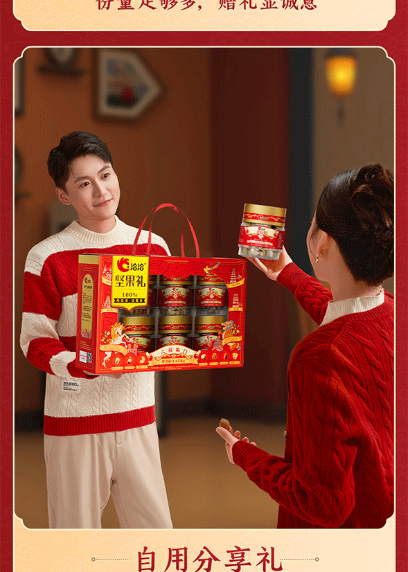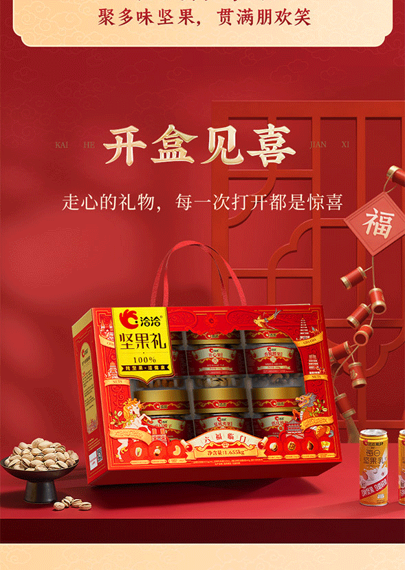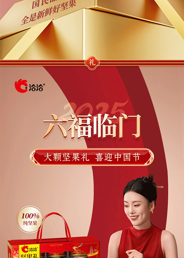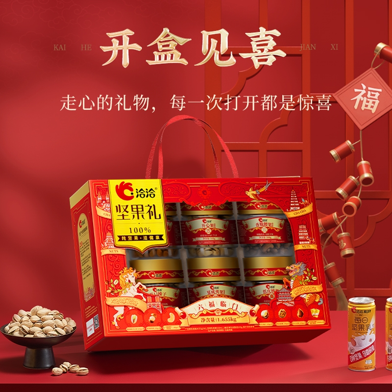 100%当季采摘坚果;精准烘烤,酥脆口感;洽洽坚果礼,新鲜、营养好心意