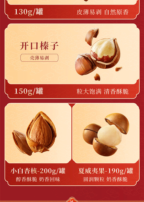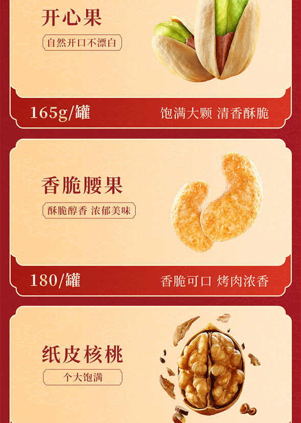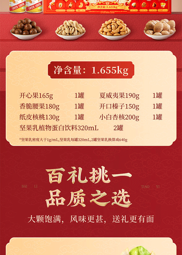 配置清单:盐焗开心果165g、小白杏核200g、纸皮核桃130g、夏威夷果190g、开口榛子150g、香脆腰果180g、坚果乳320mlx2
