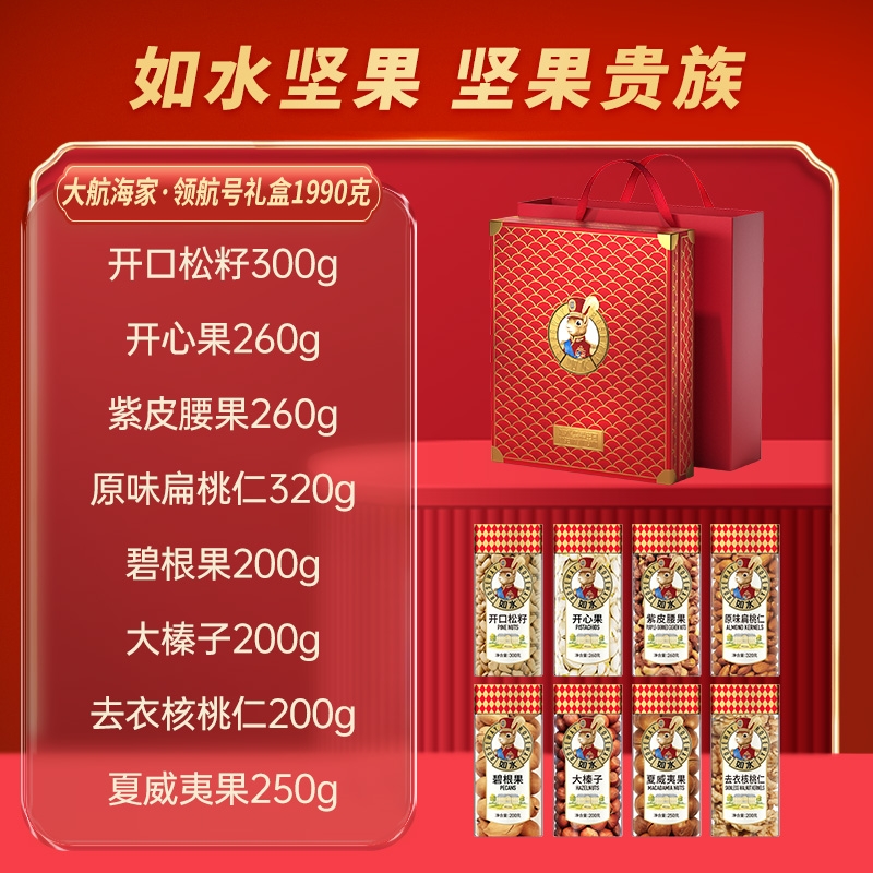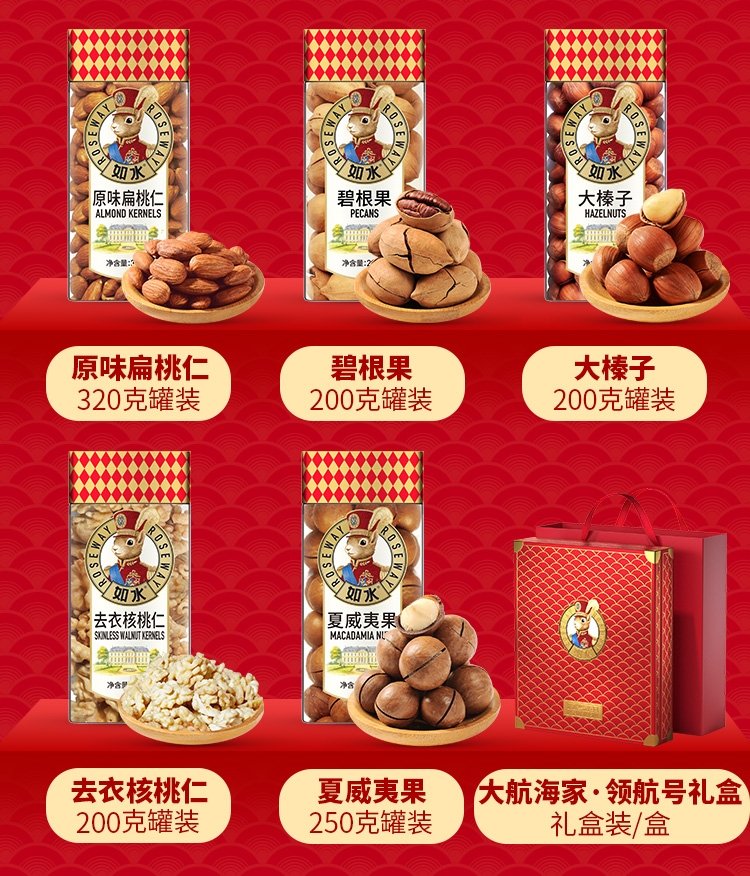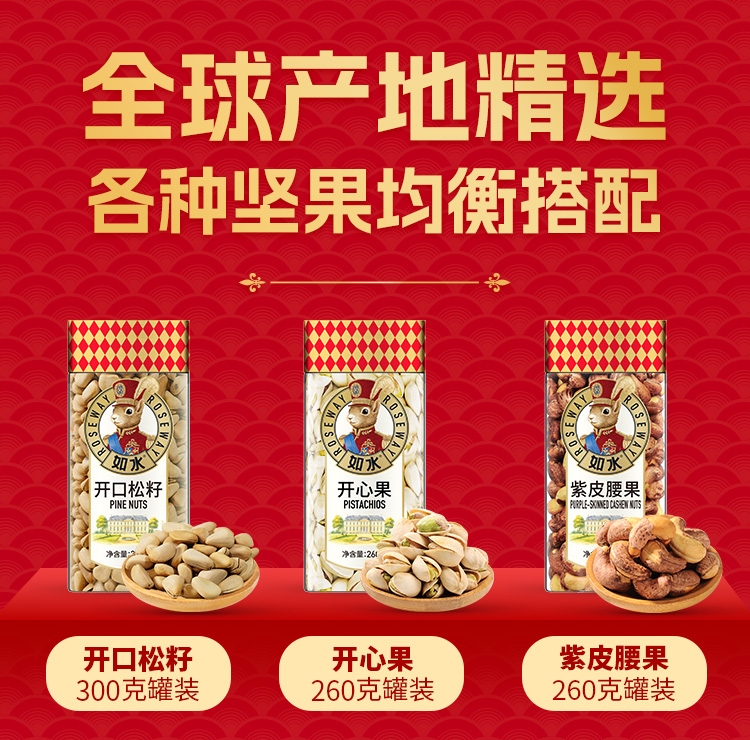 配置:如水开口松籽300g 如水开心果260g 如水紫皮腰果260g 如水原味扁桃仁320g 如水碧根果200g 如水大榛子200g 如水去衣核桃仁200g 如水夏威夷果250g