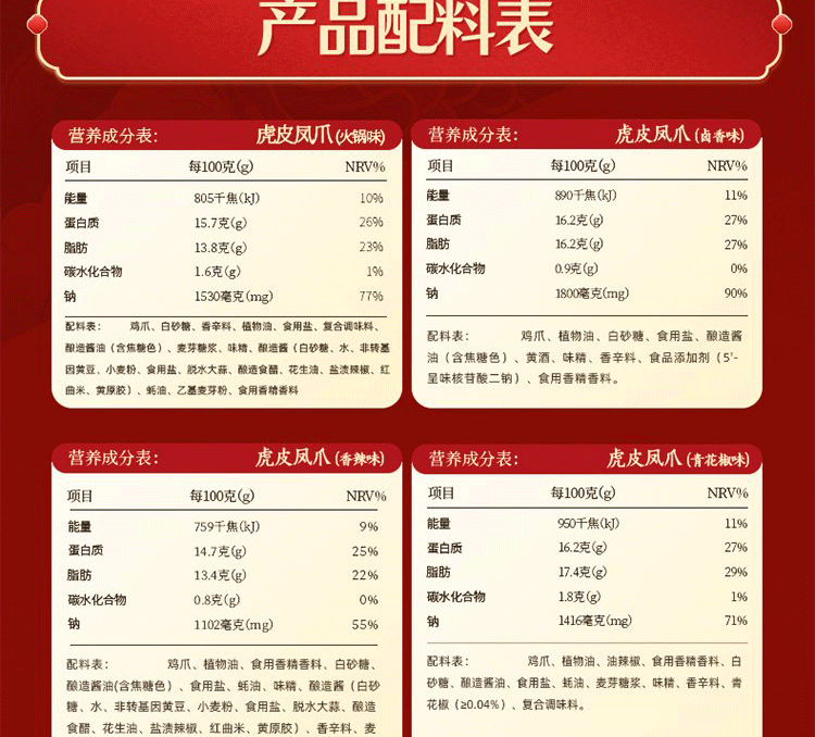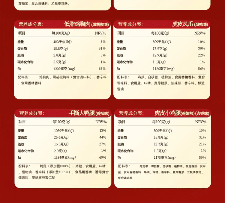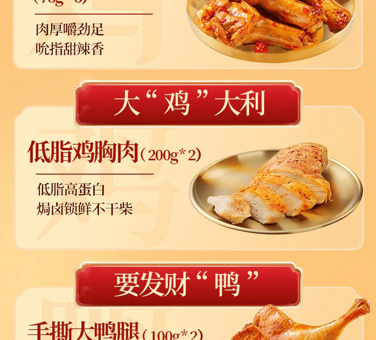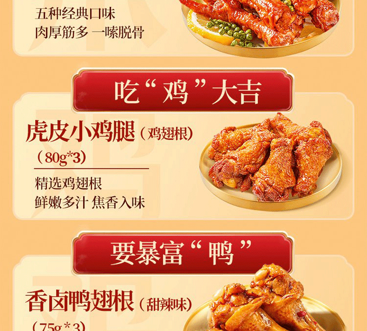 配置清单:虎皮凤爪-卤香-68g×1 鸡翅根-卤香-80g×2 虎皮凤爪-青花椒-105g×1 鸡翅根-香辣-80g×1 虎皮凤爪-黑鸭-105g×1 鸭翅根-甜辣-75g×3 虎皮凤爪-香辣-105g×1 鸡胸肉-黑胡椒-200g×2 虎皮凤爪-火锅-105g×1 手撕鸭腿-香辣-100g×2