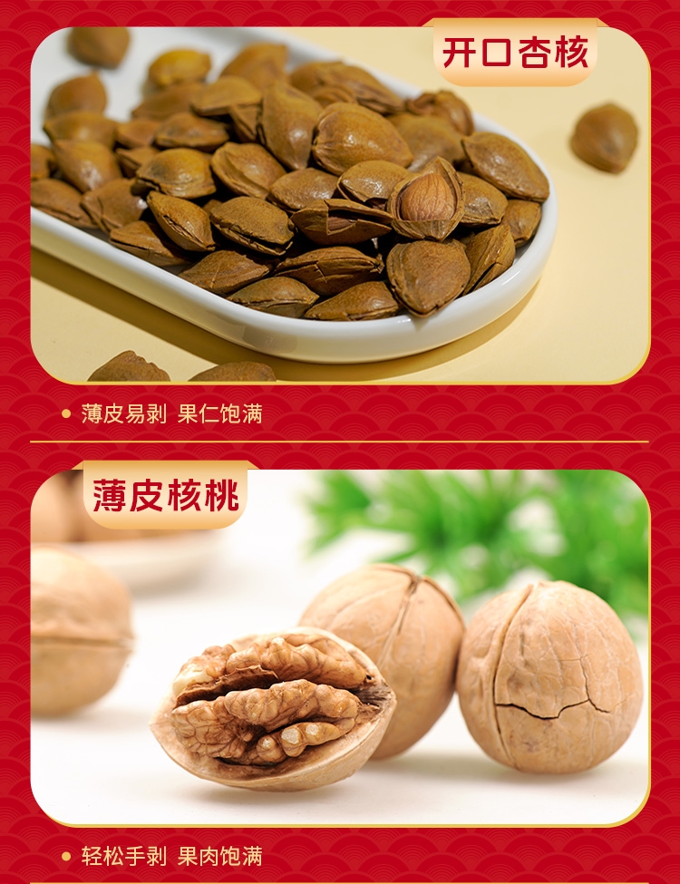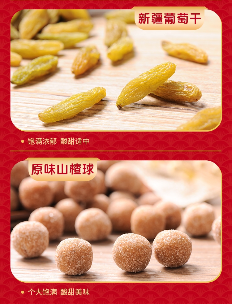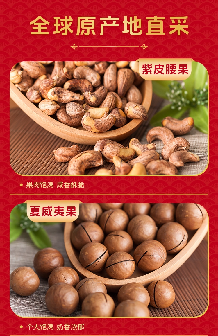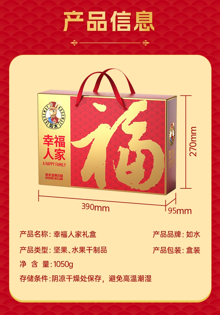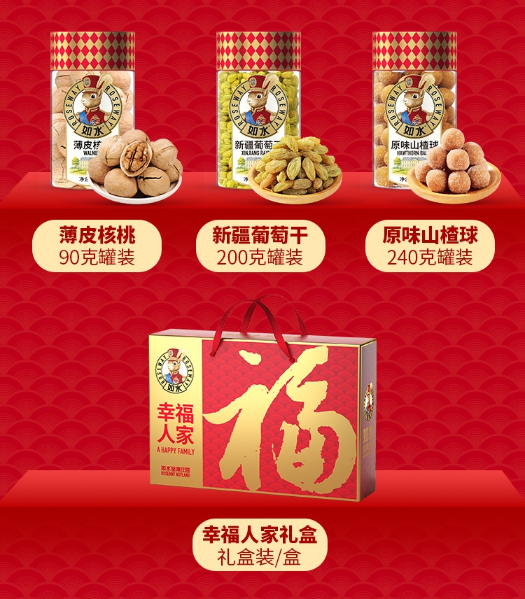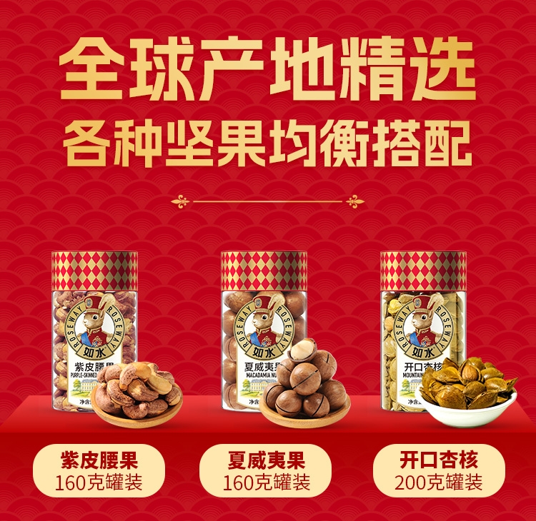 配置:如水紫皮腰果160g 如水夏威夷果160g 如水开口杏核200g 如水薄皮核桃90g 如水新疆葡萄干200g 如水原味山楂球240g