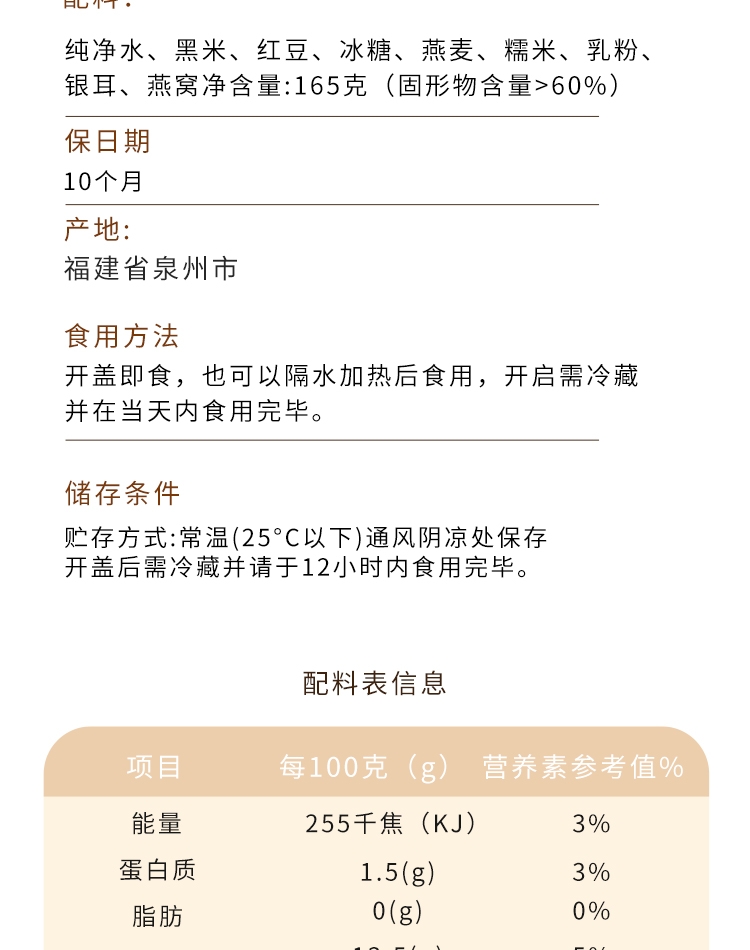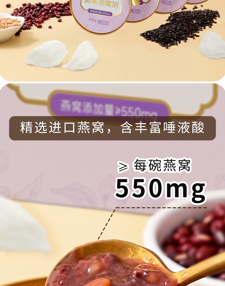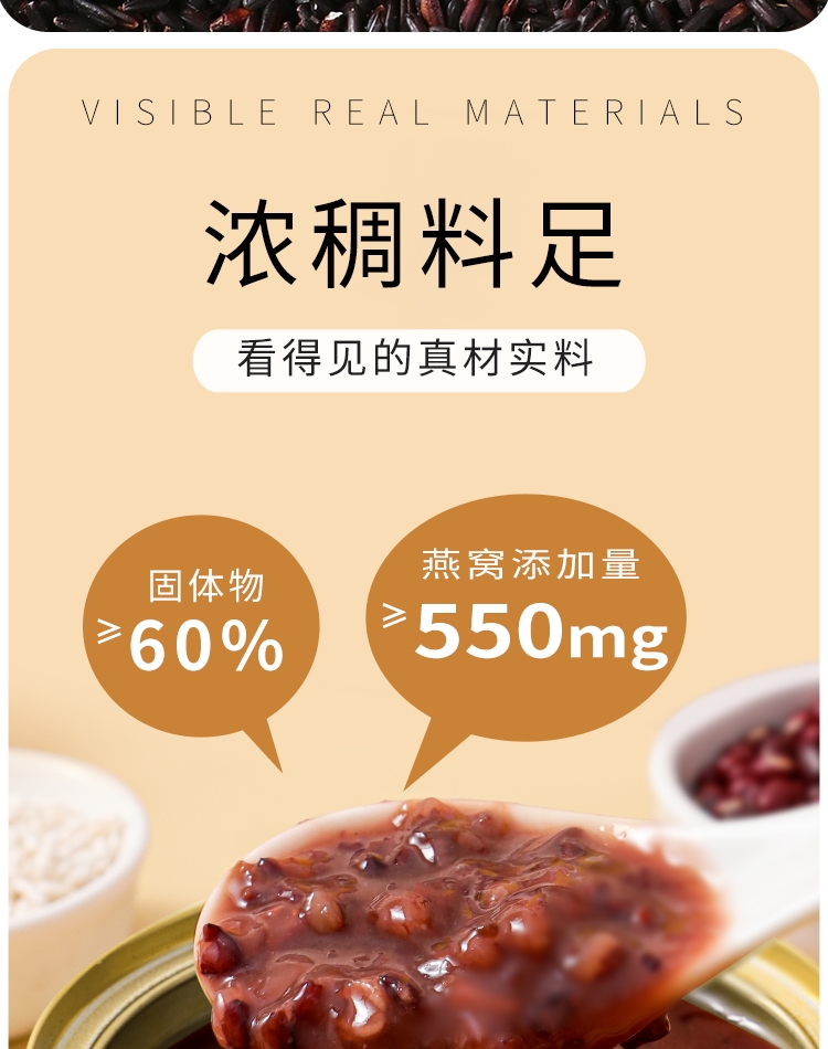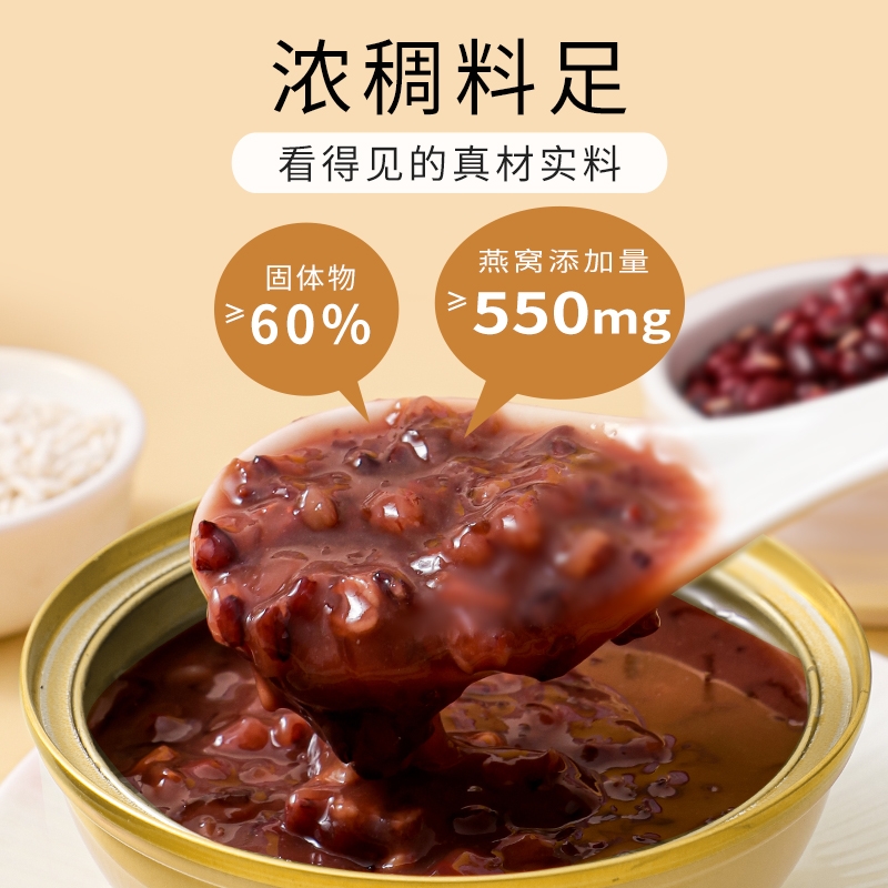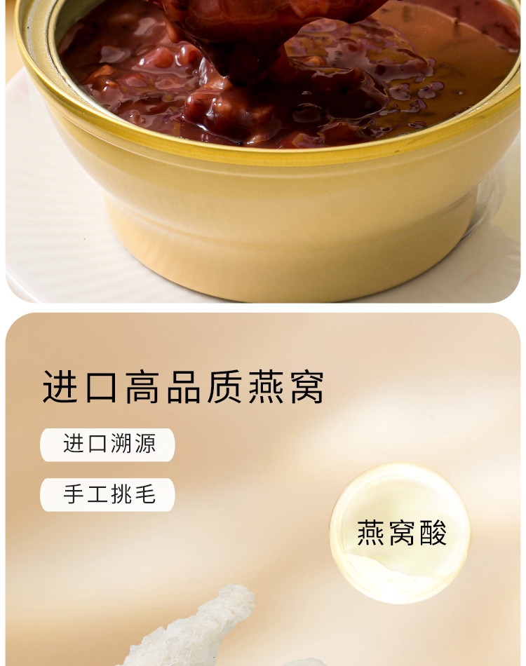 真材实料,纯净天然,燕窝丝饱满,孕妇老人小孩可食用;核心成分: 马来西亚燕窝、黑米、红豆、燕麦、糯米、;独立小袋包装,方便携带,无需任何步骤,1秒开盖即食