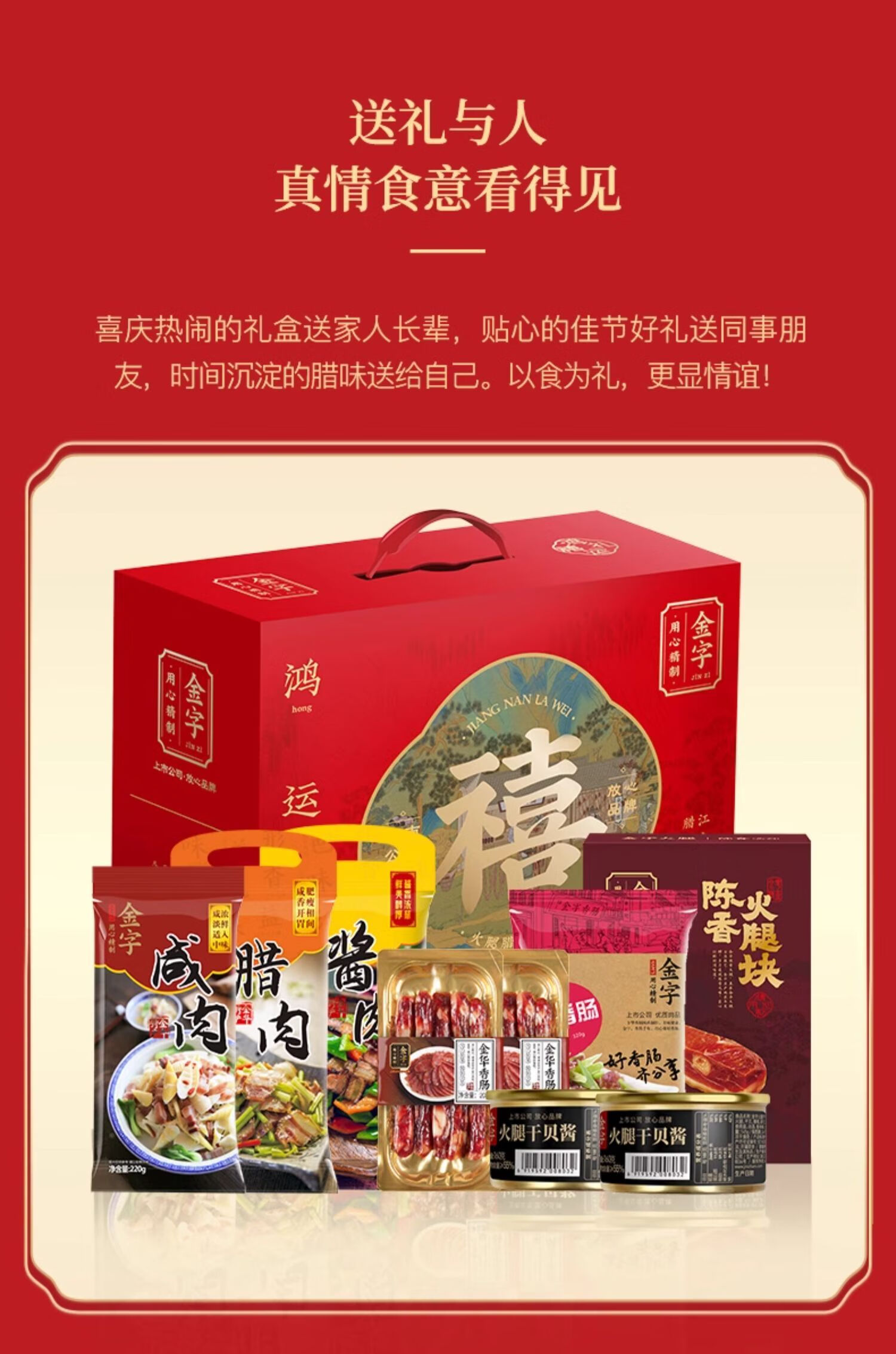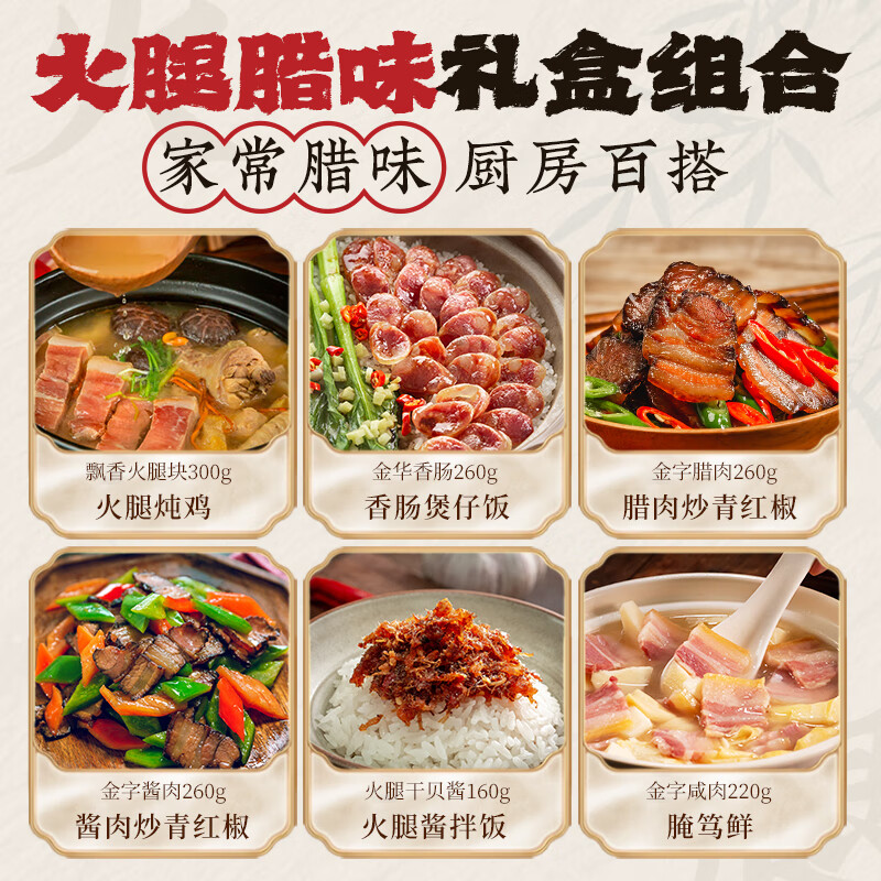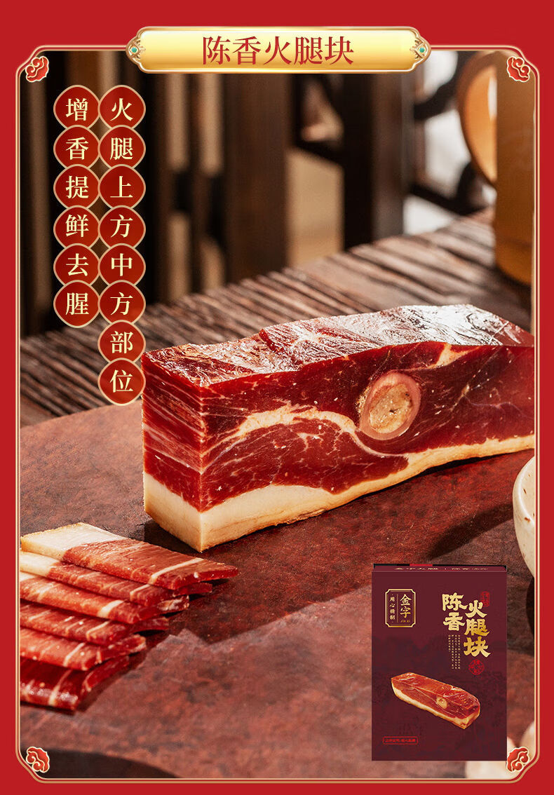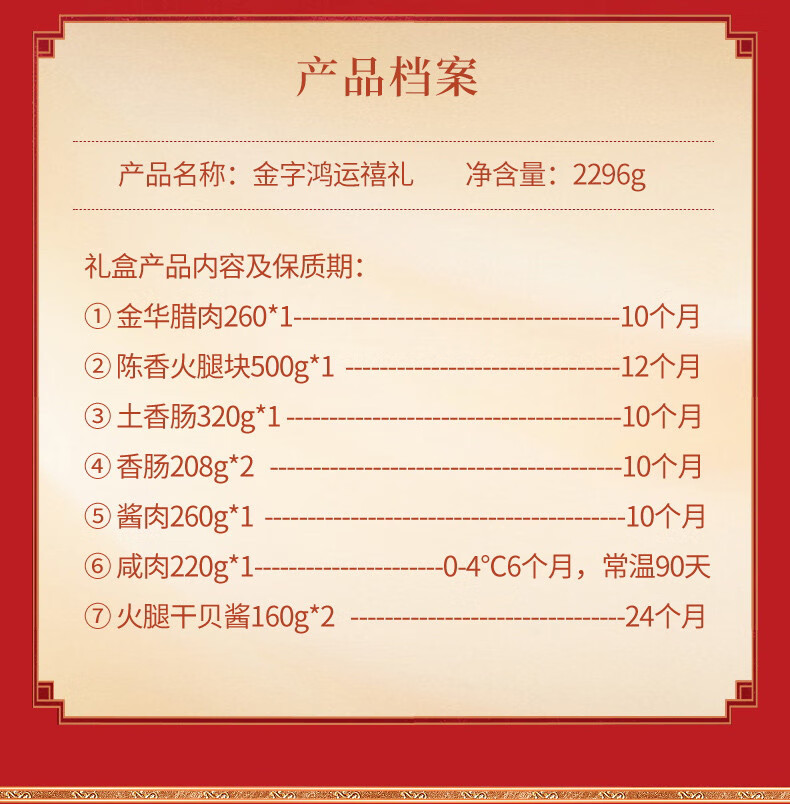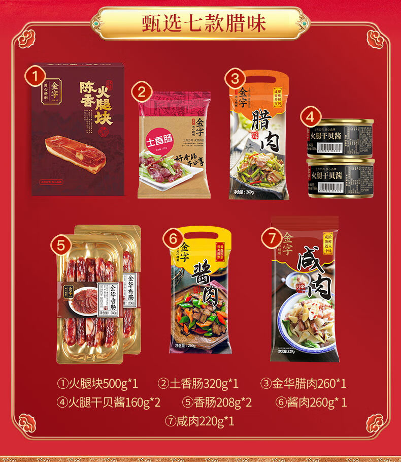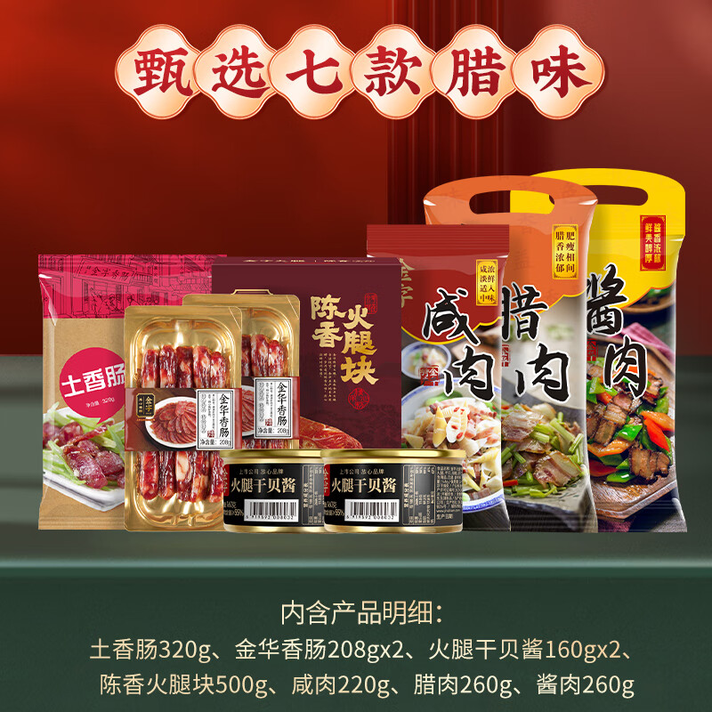 配置:陈香火腿块500g*1盒 土香肠320g*1袋 腊肉260g*1袋 酱肉260g*1袋 咸肉220g*1袋 香肠208g*2盒 火腿干贝酱160g*2罐 包装盒-鸿运禧礼礼箱*1