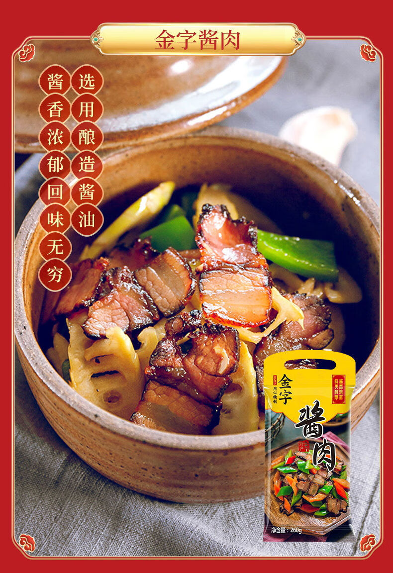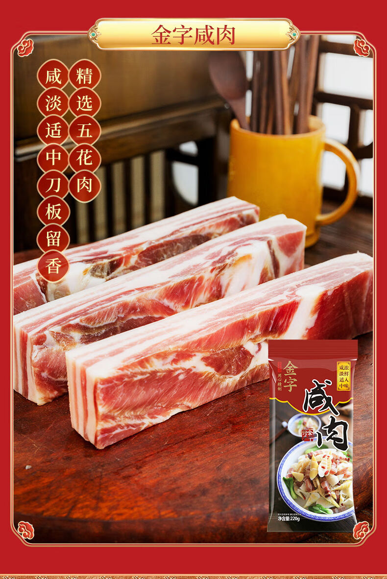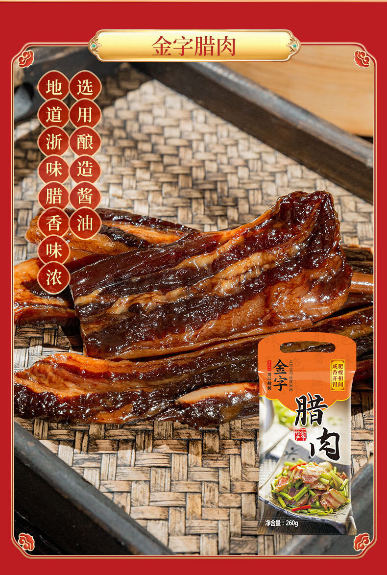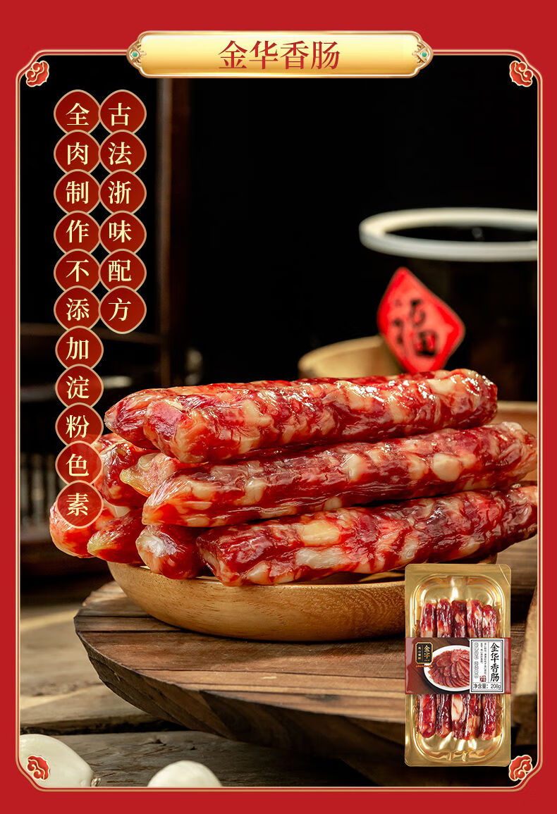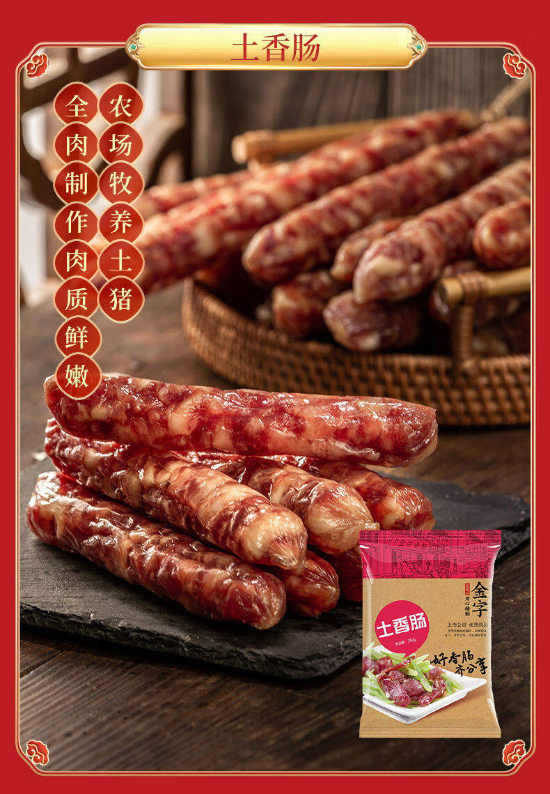 配置:陈香火腿块500g*1盒 土香肠320g*1袋 腊肉260g*1袋 酱肉260g*1袋 咸肉220g*1袋 香肠208g*2盒 火腿干贝酱160g*2罐 包装盒-鸿运禧礼礼箱*1
