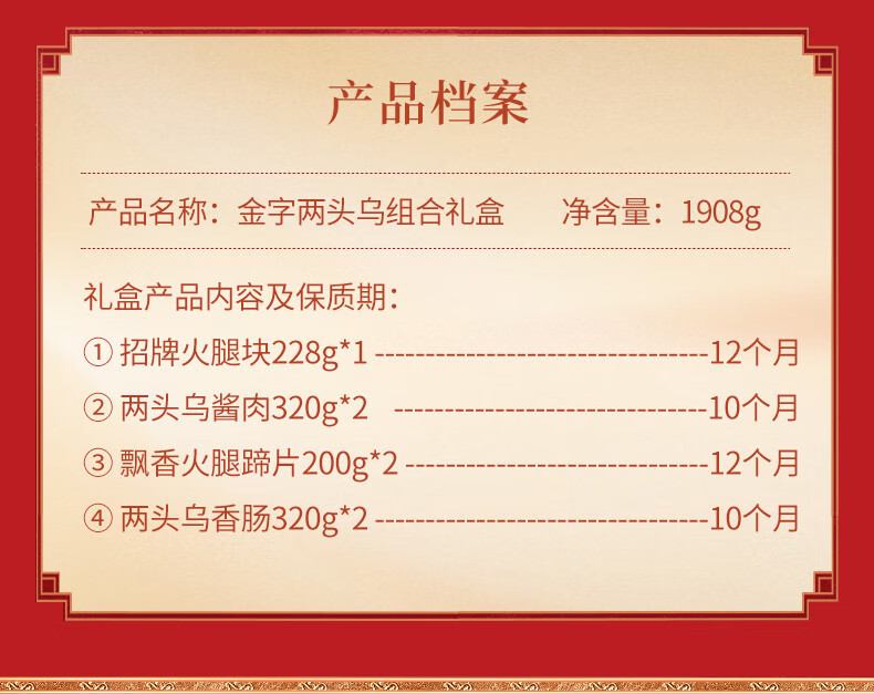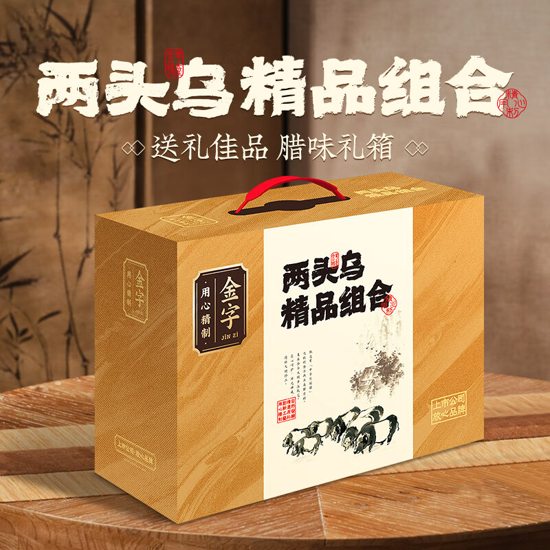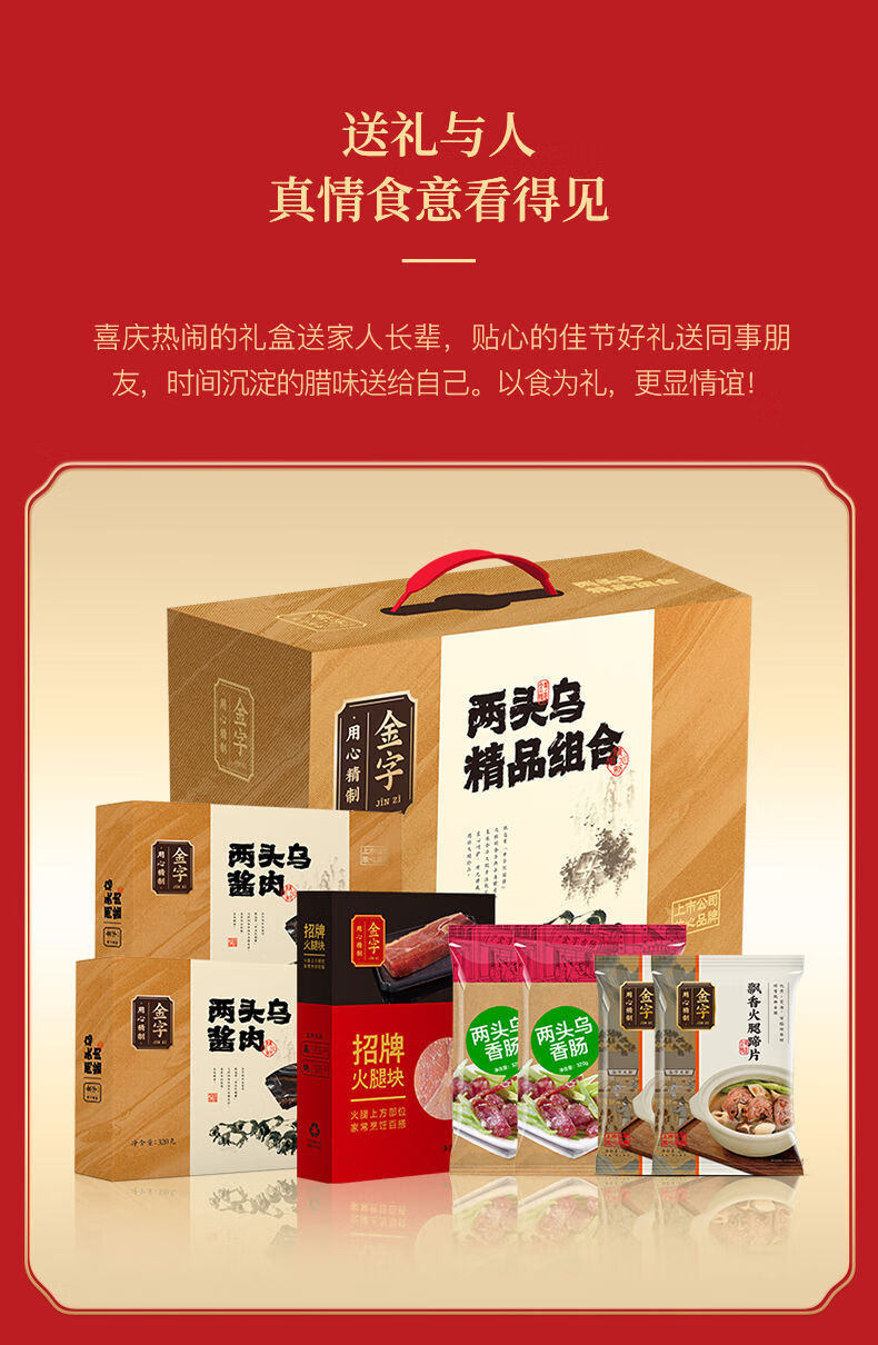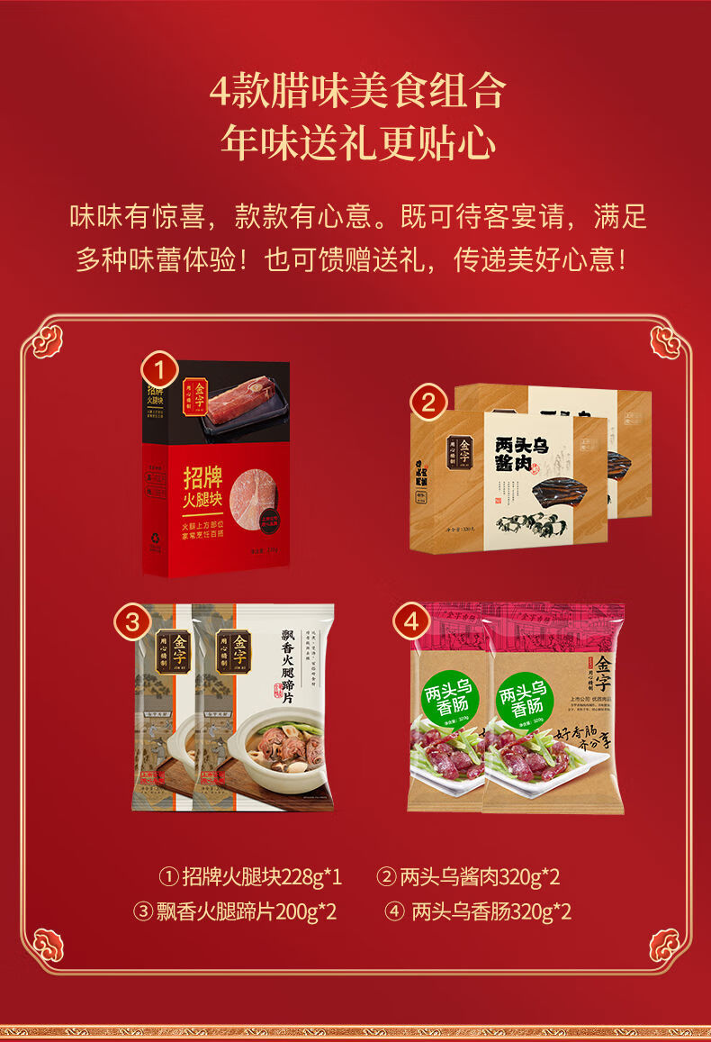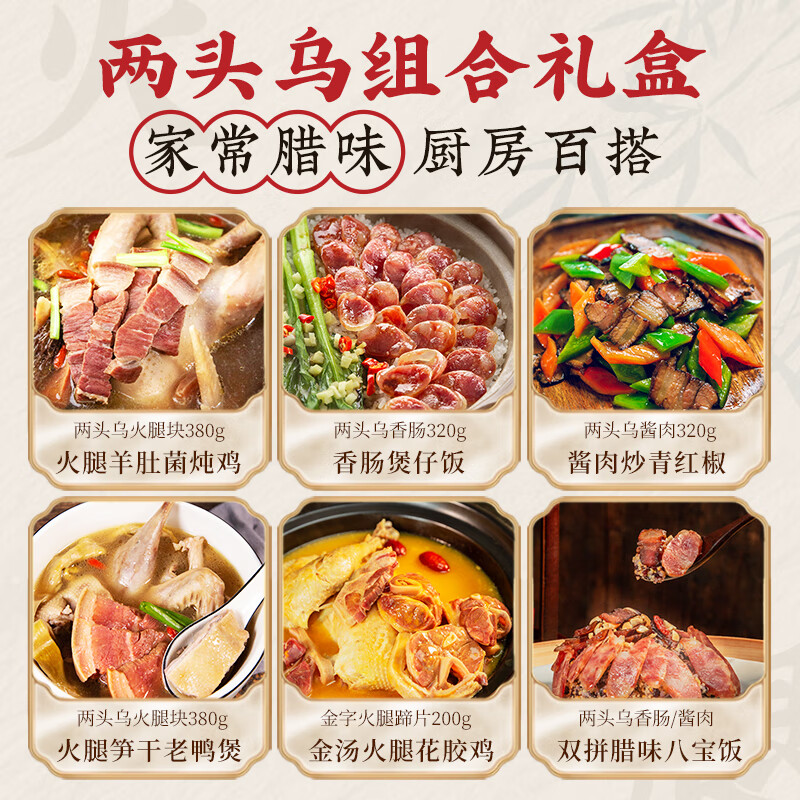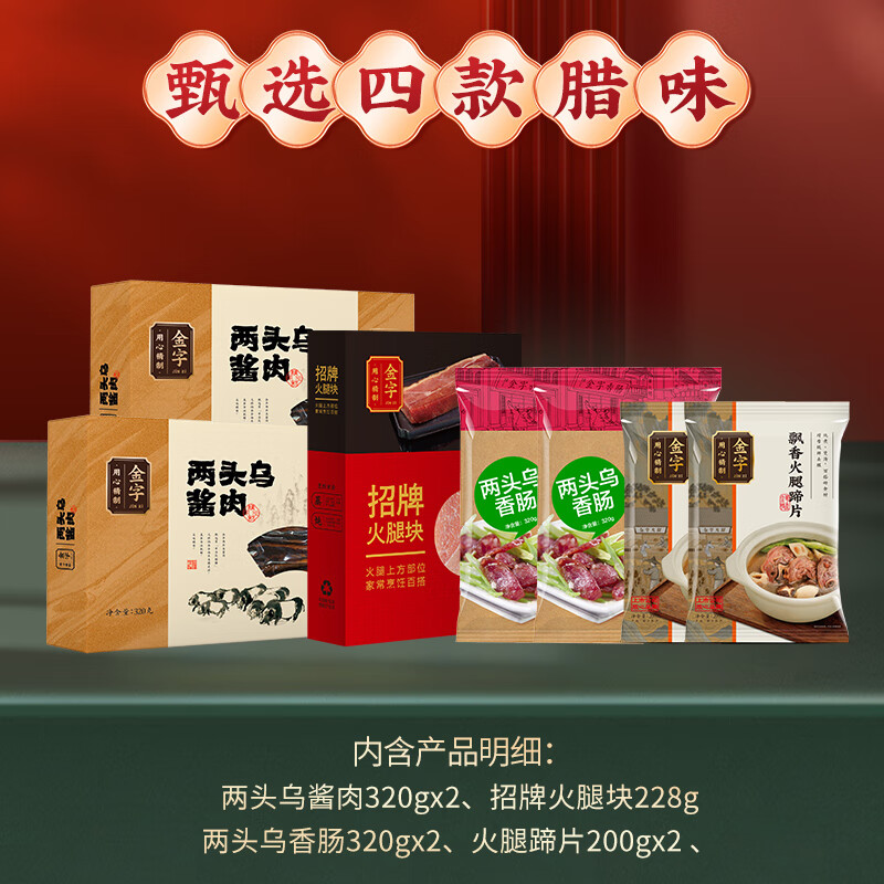 配置:两头乌香肠320g*2袋 两头乌酱肉320g*2袋 招牌火腿块228g*1盒 飘香火腿蹄片200g*2袋 包装盒-两头乌礼箱