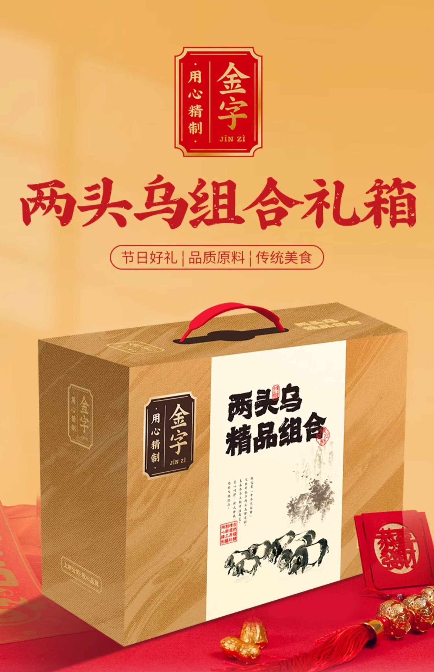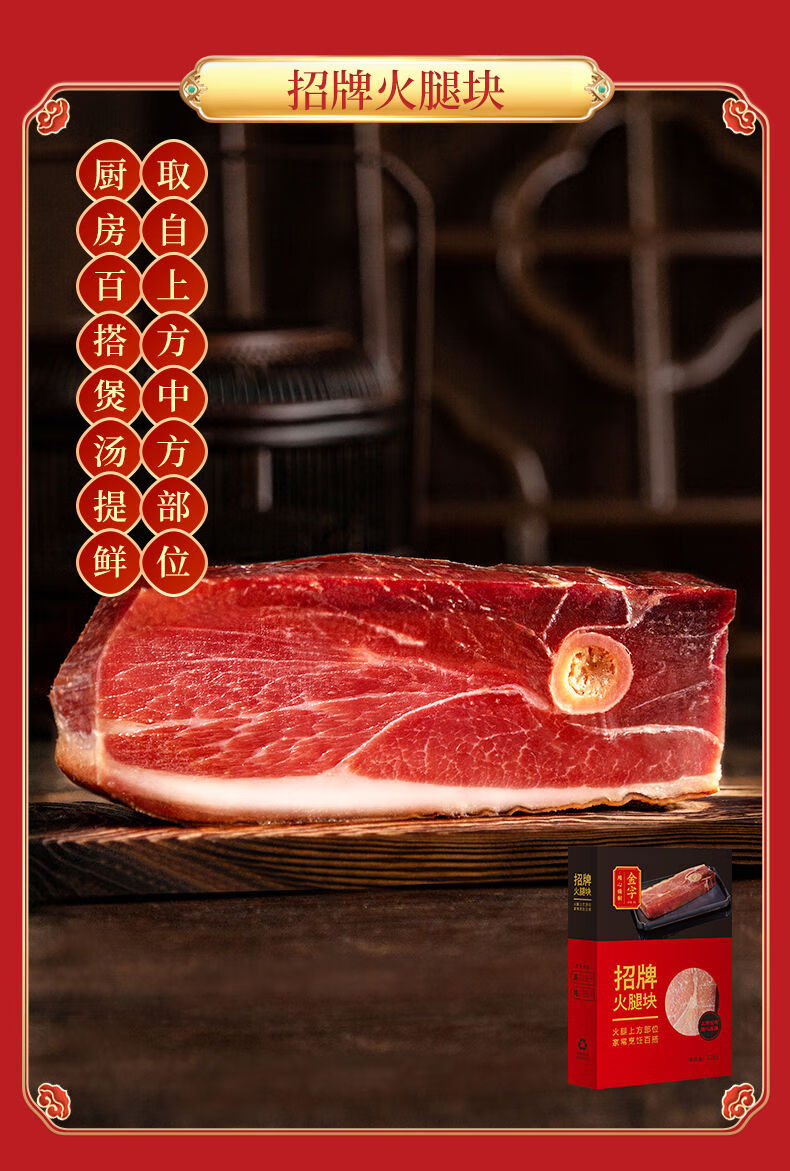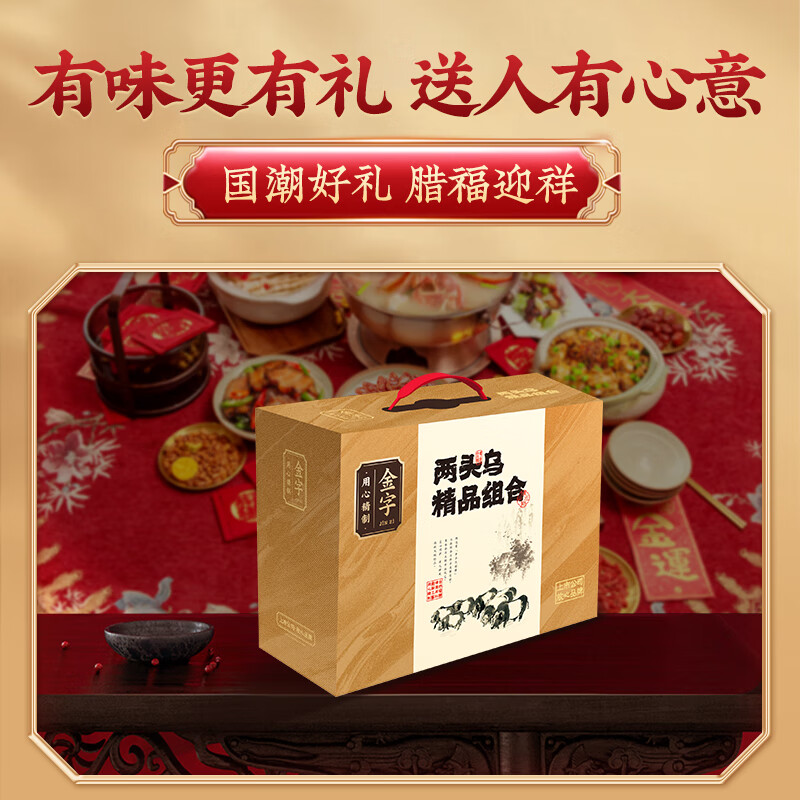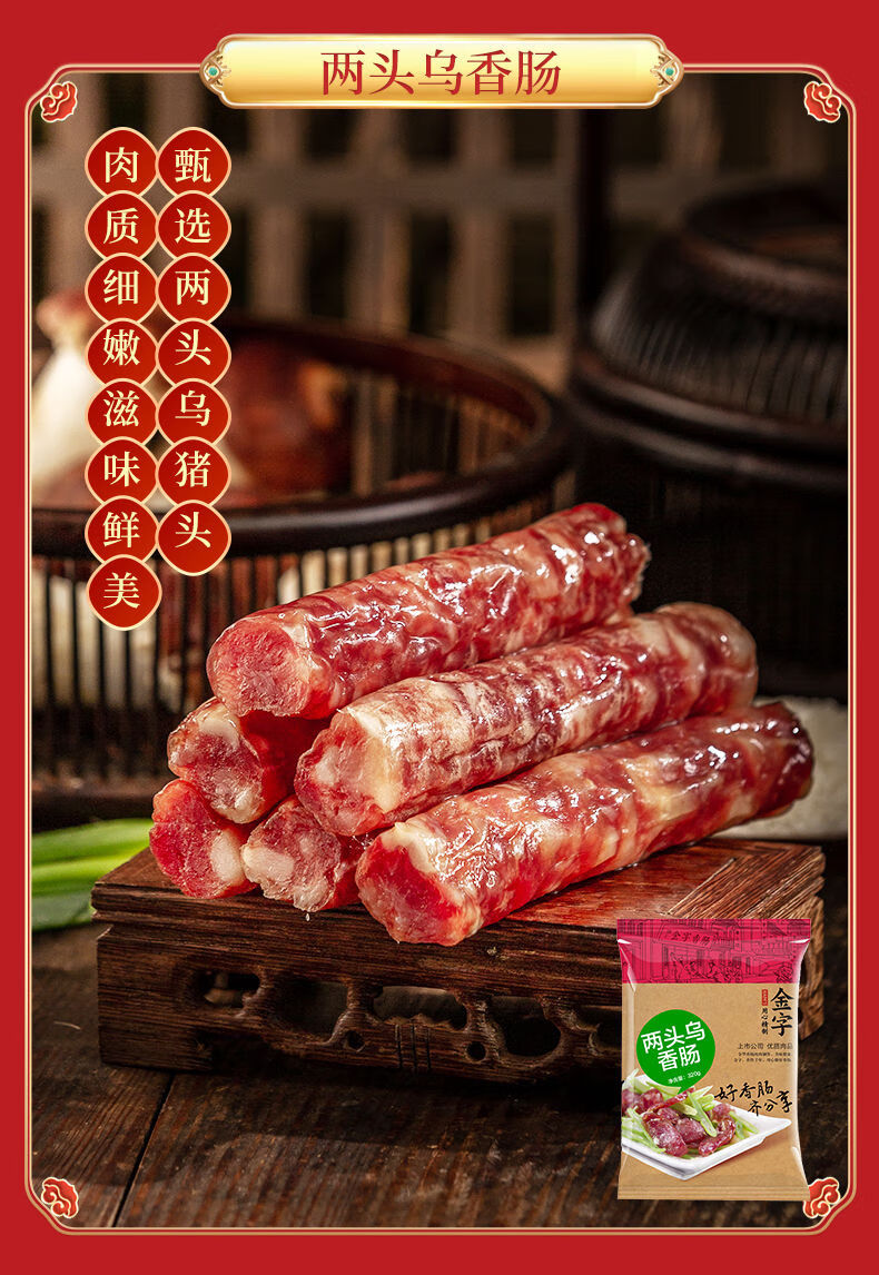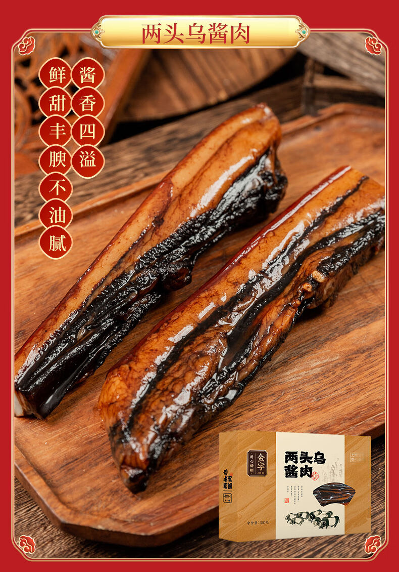 配置:两头乌香肠320g*2袋 两头乌酱肉320g*2袋 招牌火腿块228g*1盒 飘香火腿蹄片200g*2袋 包装盒-两头乌礼箱