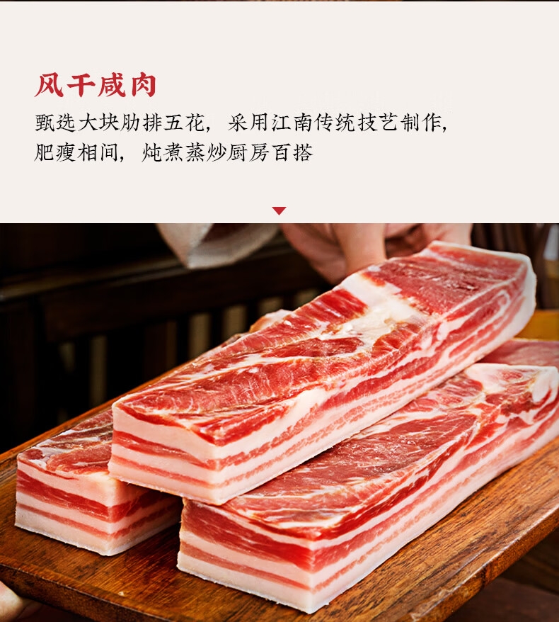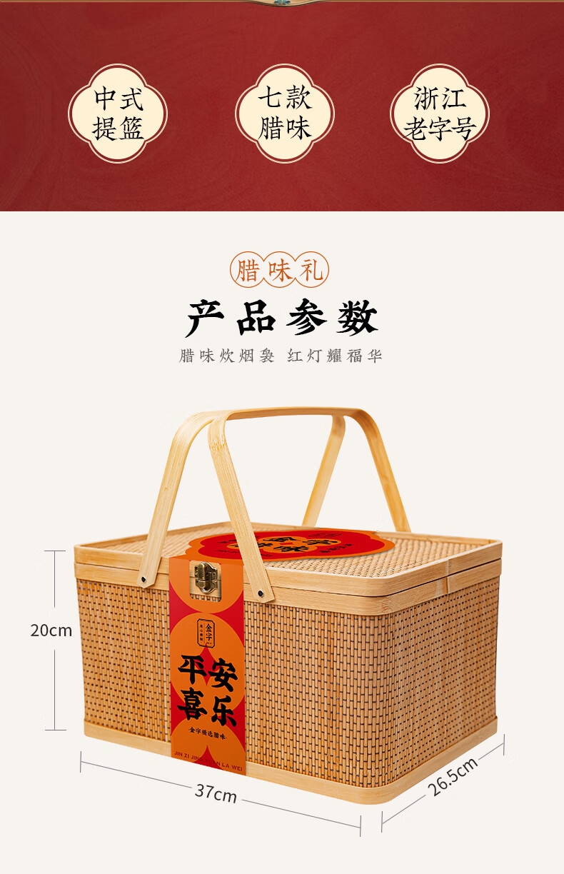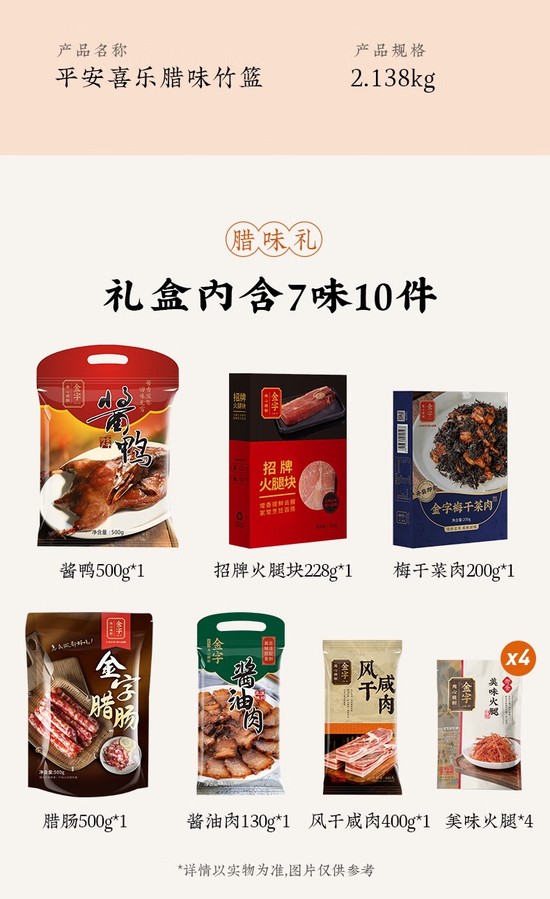 配置:风干咸肉400g*1袋 招牌火腿块228g*1盒 金字腊肠500g*1袋 酱鸭500g*1袋 酱油肉130g*1袋 梅干菜肉200g*1罐 美味火腿45g*4袋 竹篮*1
