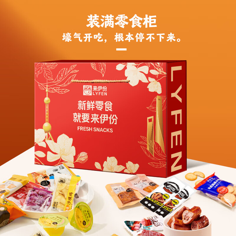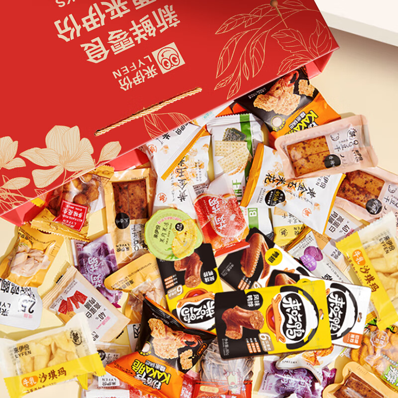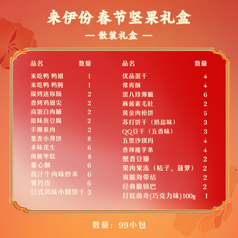 配置:·鸭翅*1 ·优品蛋干*4 ·鸭肫*1 ·常青酥*4 ·碳烤迷你肠*2 ·黑八珍薄脆*6 ·香烤鸡翅尖*2 ·麻酱素毛肚*2 ·高蛋白肉脯*2 ·黄金肉松饼*5 ·原味鱼豆腐*2 ·苏打饼干(奶盐味)*3 ·手撕素肉*2 ·QQ豆干(五香味)*3 ·葱香小薄饼*8 ·低GI五黑沙琪玛*4 ·多味花生SY*6 ·香辣魔芋条*4 ·南酸枣糕*8 ·蟹香豆瓣*2 ·紫心酥*6 ·果肉果冻(桔子、菠萝)*2 ·酱汁牛肉味炒米*6 ·爽脆海带结*2 ·果丹皮*6 ·经典脆锅巴*2 ·日式风味小圆饼干*3 ·打糕曲奇(巧克力味)100g*1