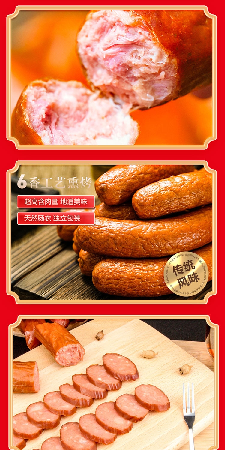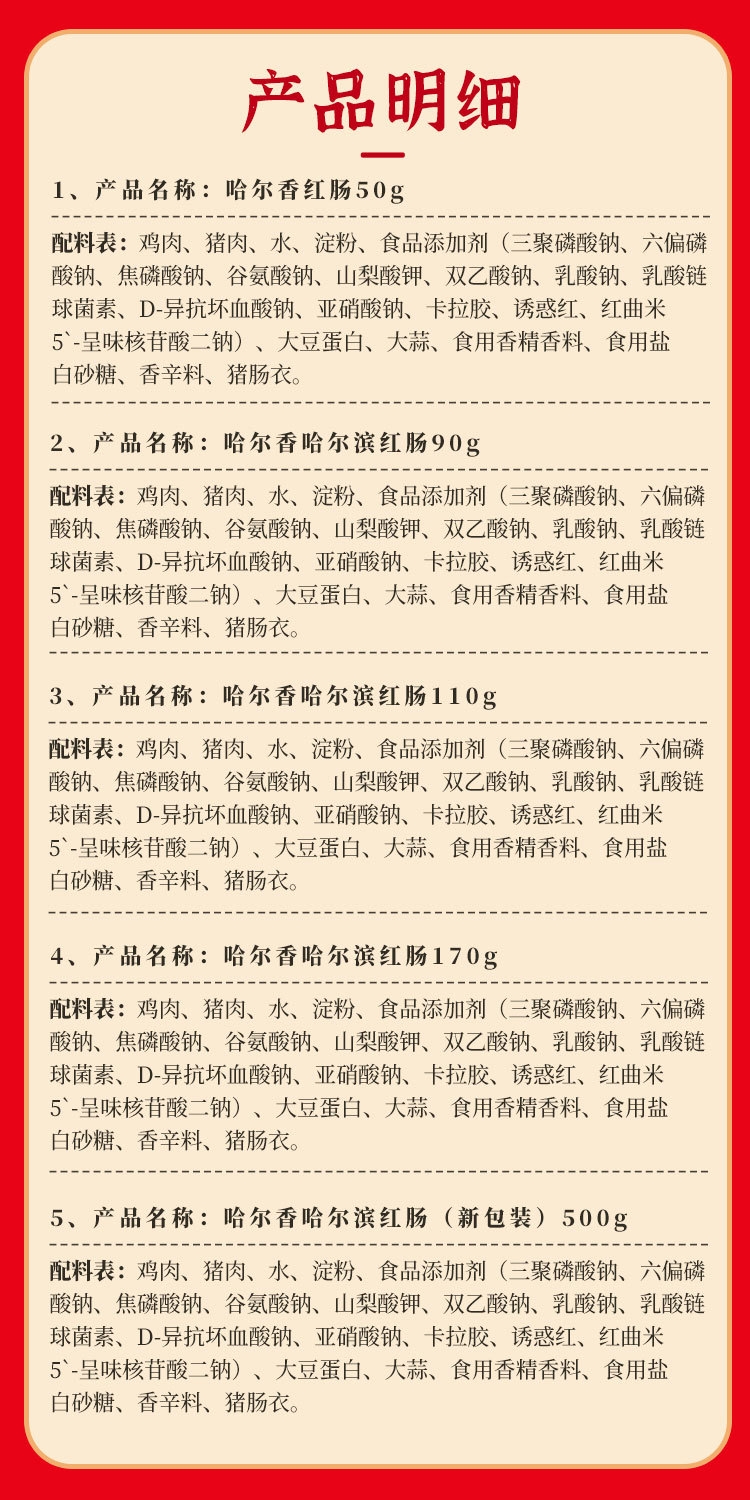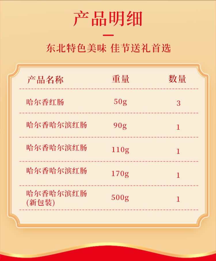 配置:哈尔香哈尔滨红肠(精装版)500g*1哈尔香哈尔滨红肠90g*1 哈尔香哈尔滨红肠110g*1 哈尔香哈尔滨红肠170g*1 哈尔香红肠50g*3