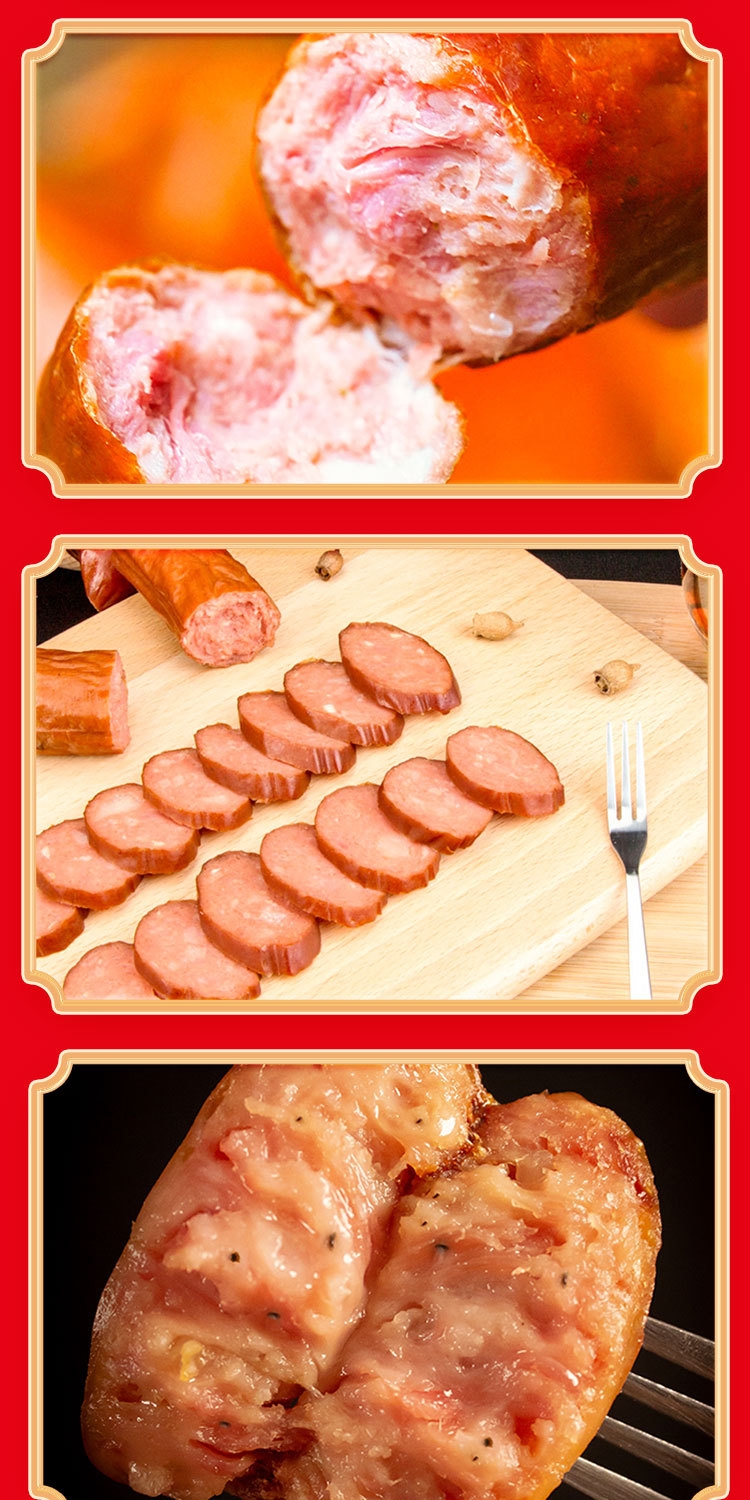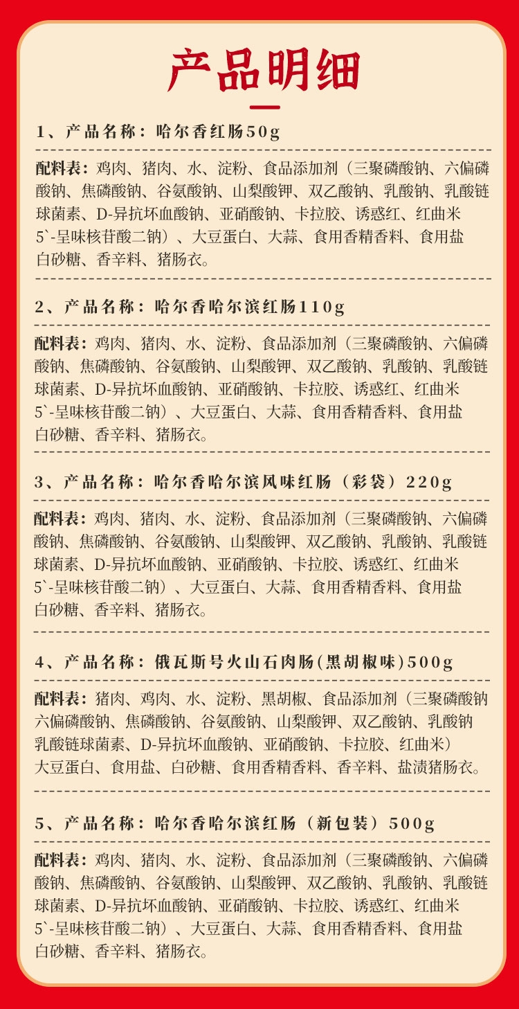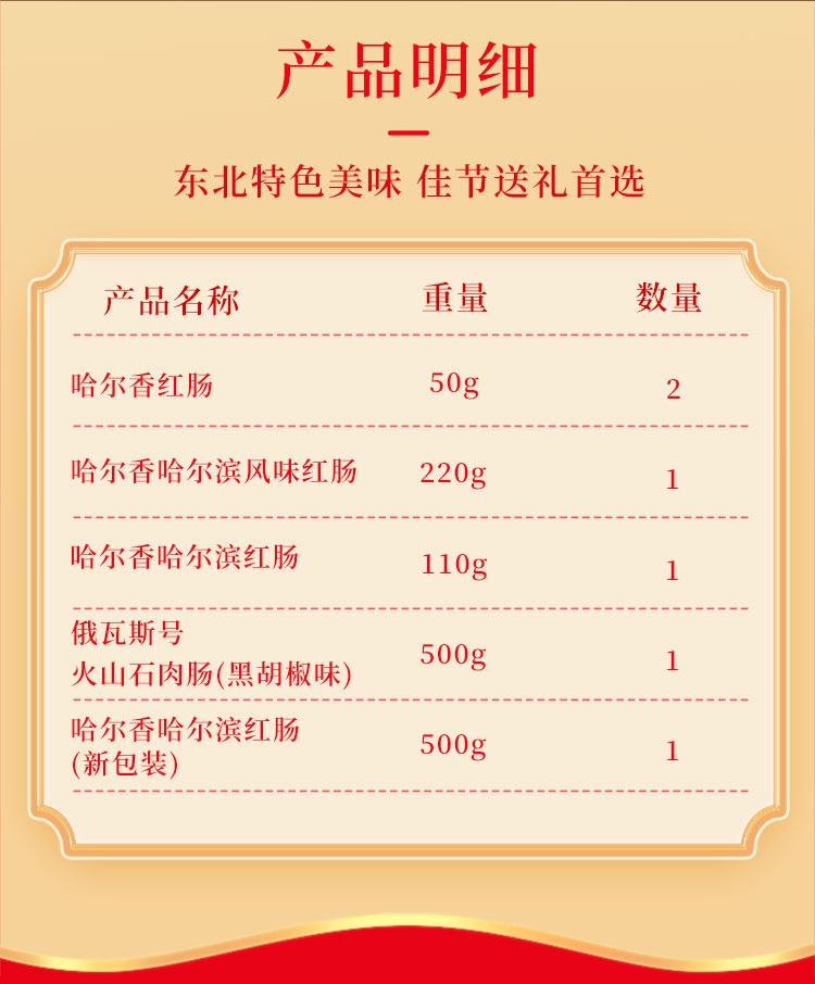 配置:哈尔香哈尔滨红肠(精装版)500g*1俄瓦斯号火山石肉肠(黑胡椒味)500g*1哈尔香哈尔滨风味红肠(彩袋)220g*1 哈尔香哈尔滨红肠110g*1 哈尔香红肠50g*2