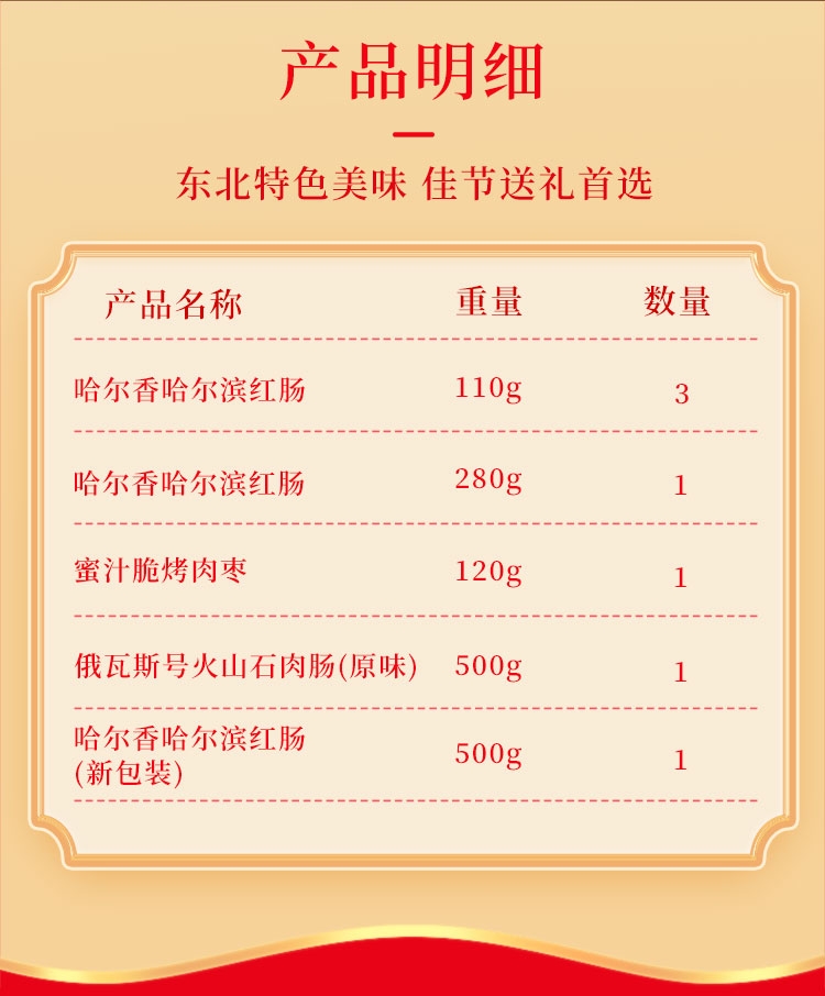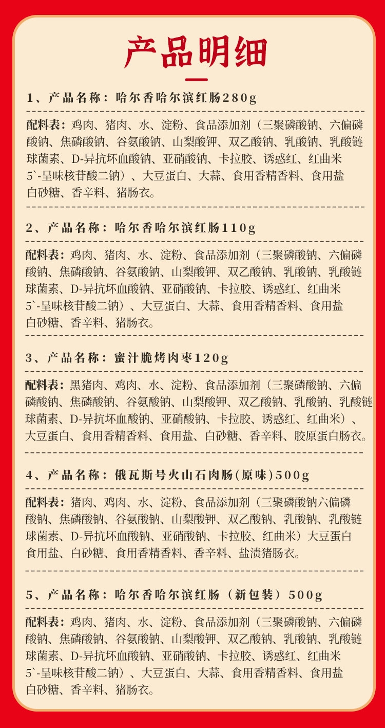 配置:哈尔香哈尔滨红肠(精装版)500g*1俄瓦斯号火山石肉肠(原味)500g*1 哈尔香哈尔滨红肠280g*1 哈尔香蜜汁脆烤肉枣120g*1 哈尔香哈尔滨红肠110g*3