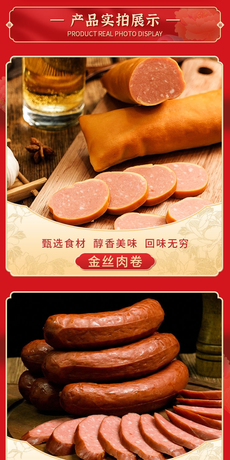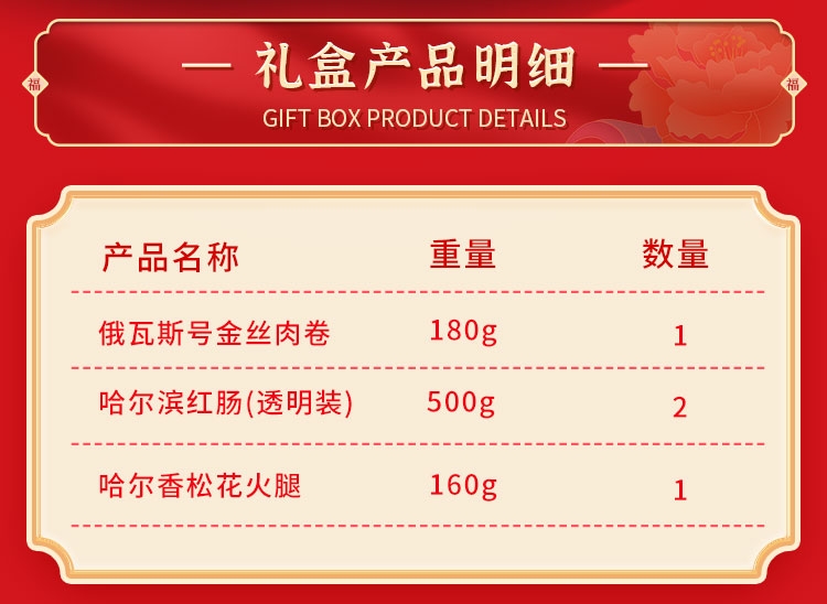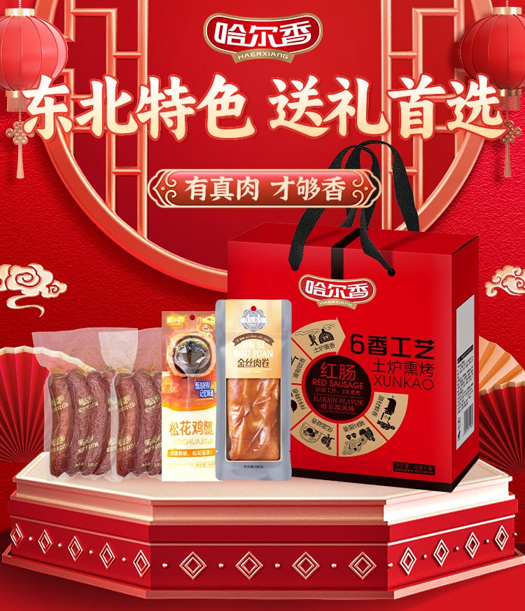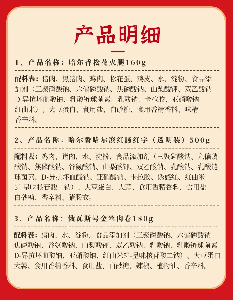 配置:哈尔香哈尔滨红肠(透明装)500g*2 俄瓦斯号金丝肉卷180g*1 哈尔香松花鸡腿160g*1