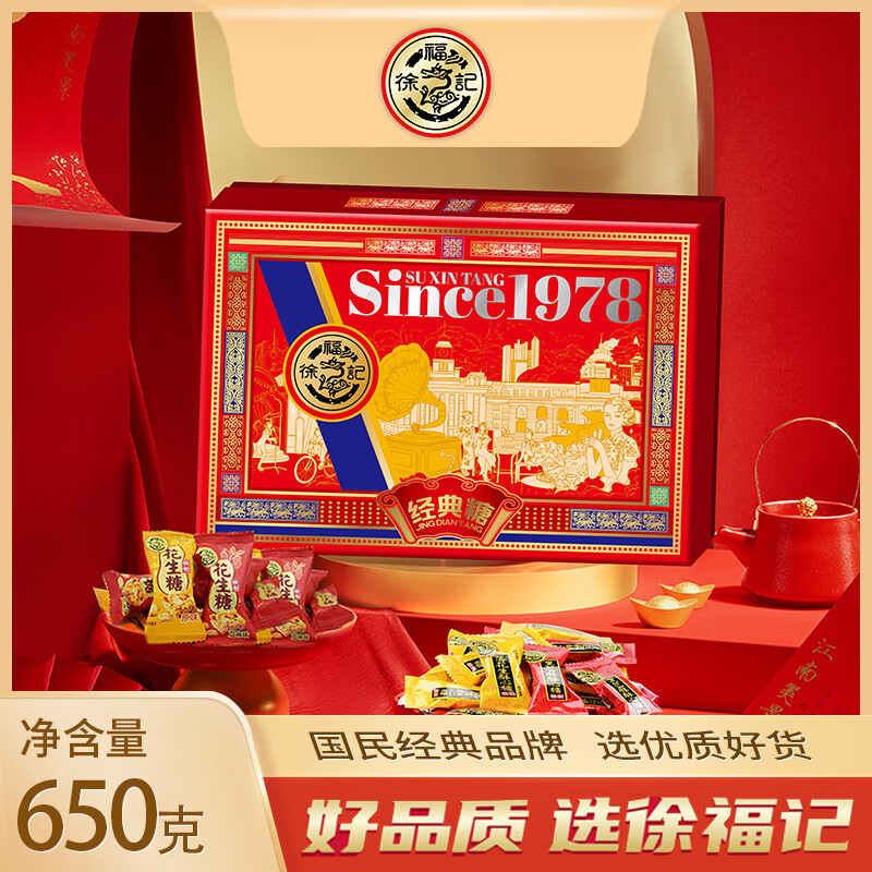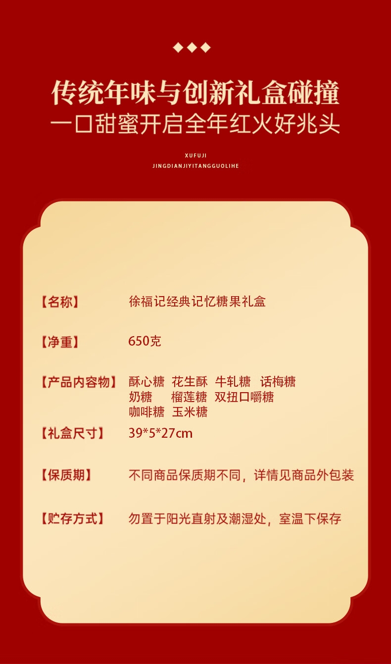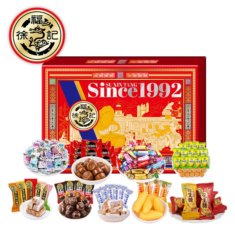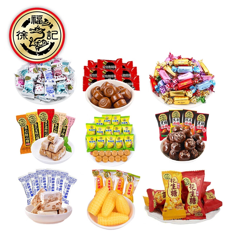 配置:徐福记酥心糖 徐福记花生酥 徐福记牛轧糖 徐福记话梅糖 徐福记奶糖 徐福记榴莲糖 徐福记双扭口嚼糖 徐福记咖啡糖 徐福记玉米糖