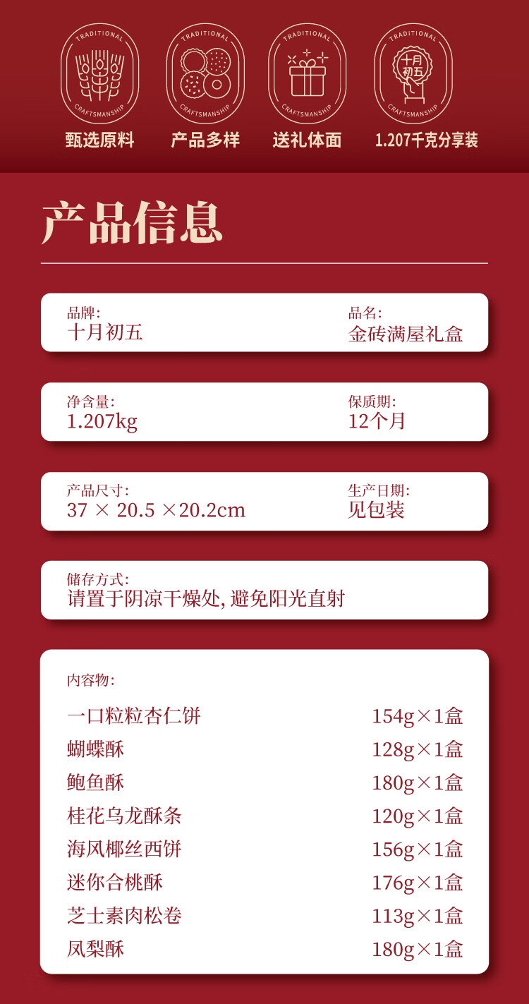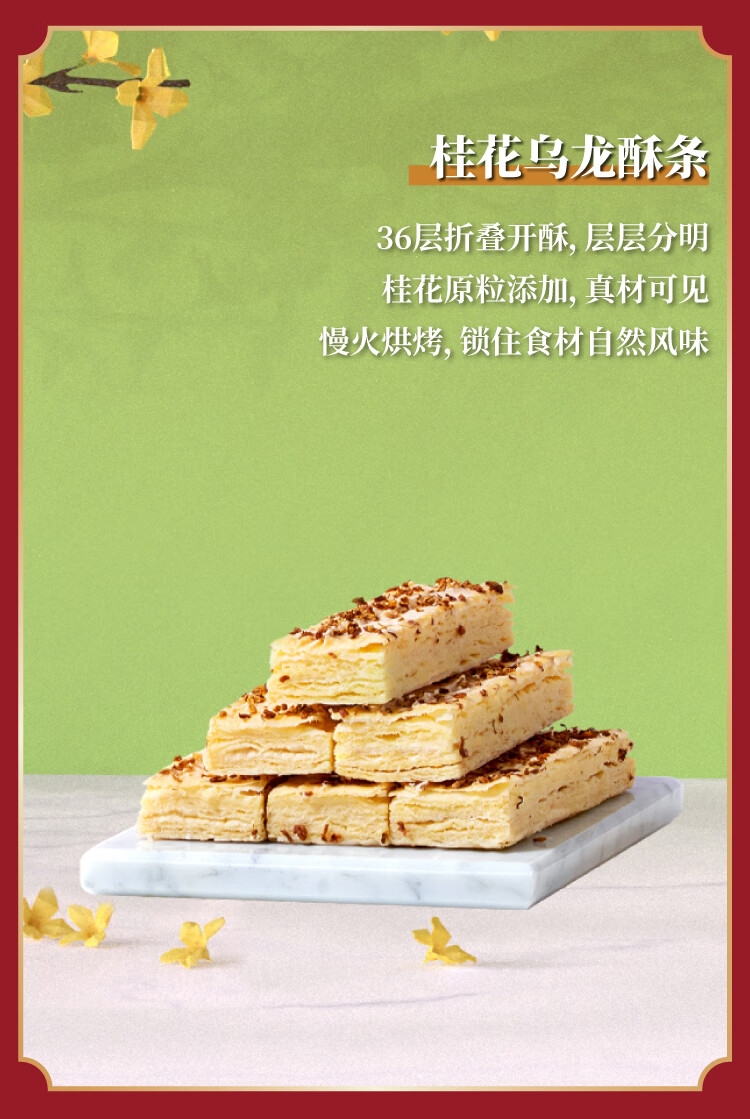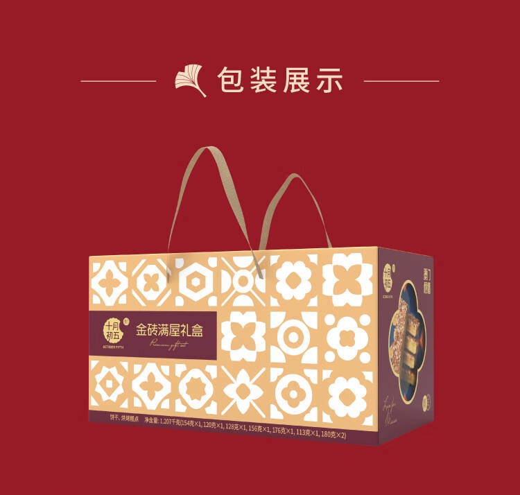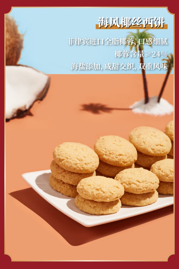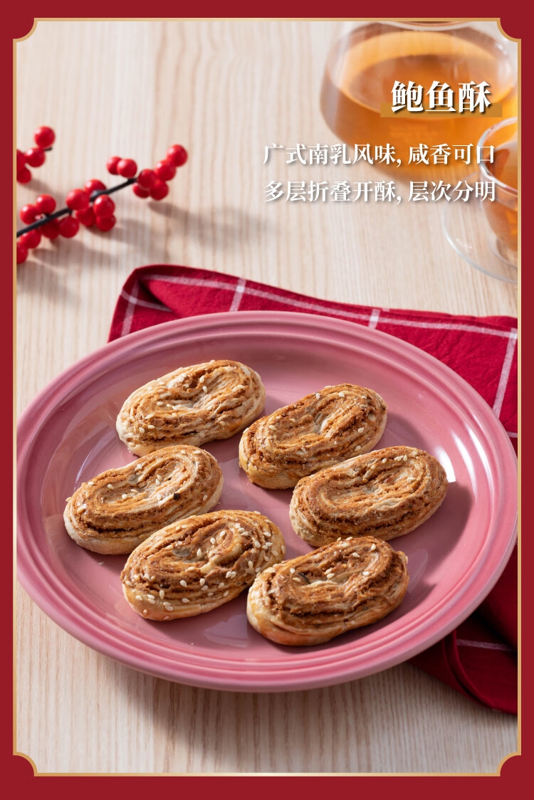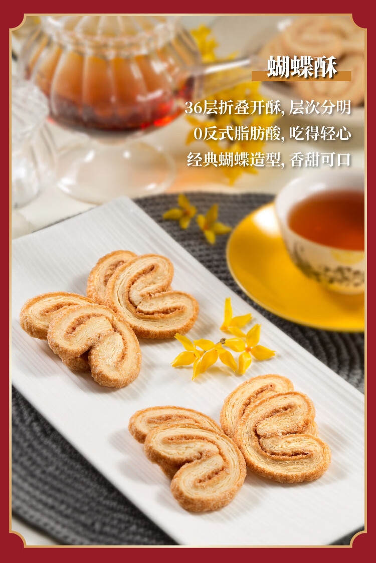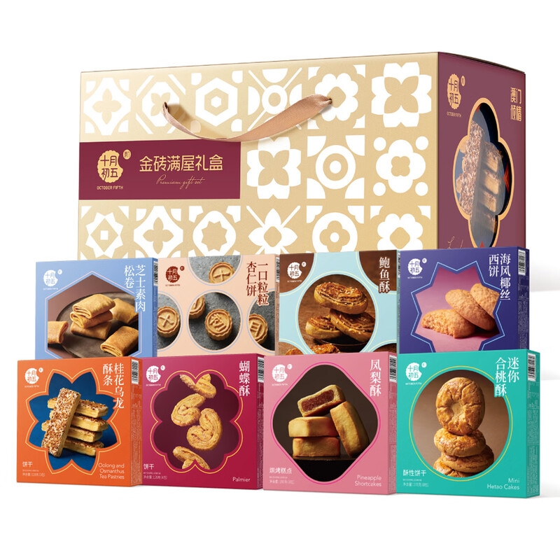 配置:113g芝士素肉松卷(澳门倾情系列)X1盒 120g桂花乌龙酥条(澳门倾情系列)X1盒 128g蝴蝶酥(澳门倾情系列)X1盒 180g凤梨酥(澳门倾情系列)X1盒 156g海风椰丝西饼(澳门倾情系列)X1盒 180g鲍鱼酥(澳门倾情系列)X1盒 154g一口粒粒杏仁饼(澳门倾情系列)X1盒 176g迷你合桃酥(澳门倾情系列)X1盒