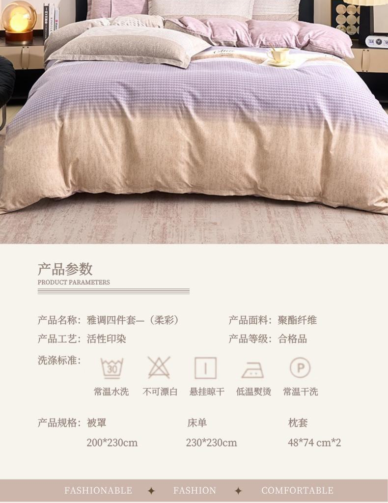 配置清单:被罩:200*230cm*1 床单:230*230cm*1 枕套:48*74 cm*2