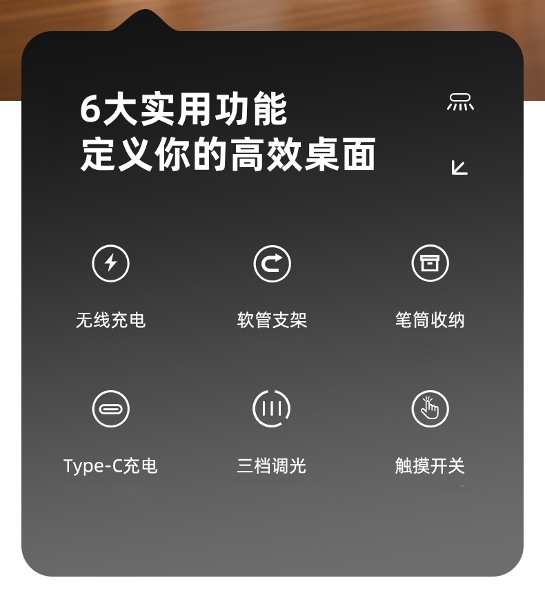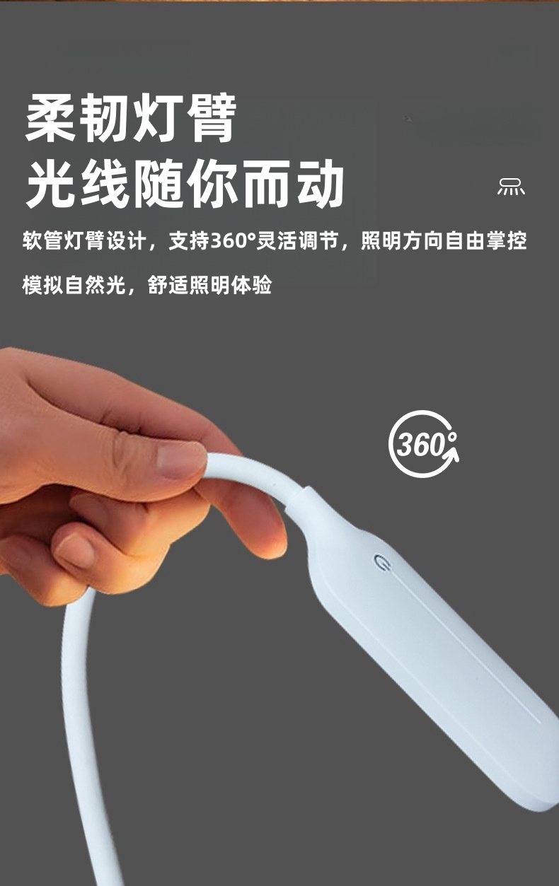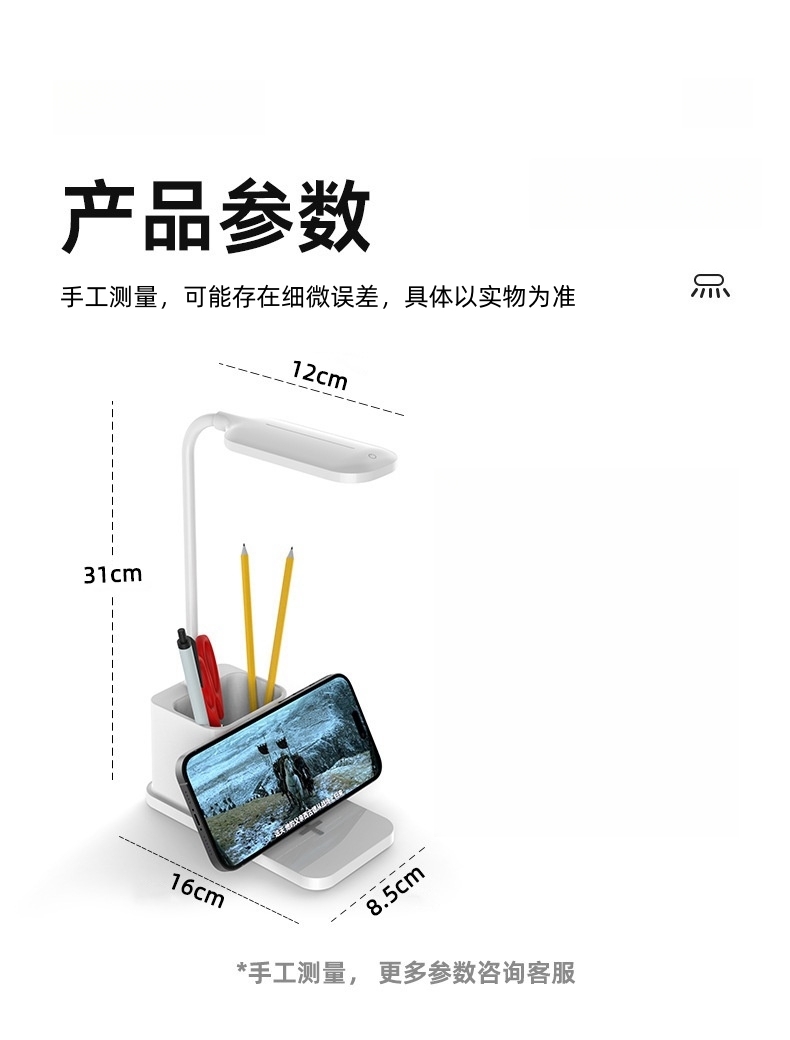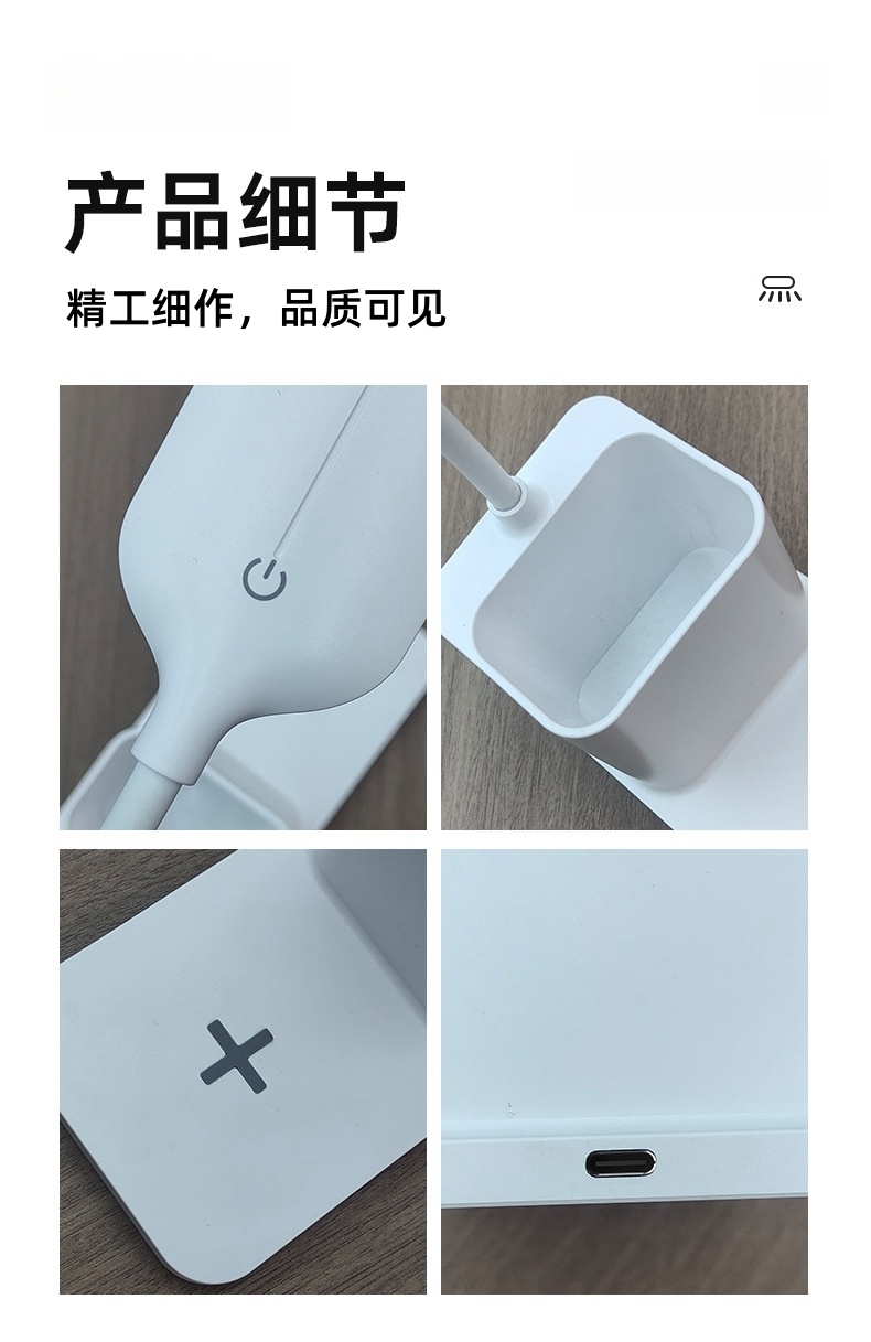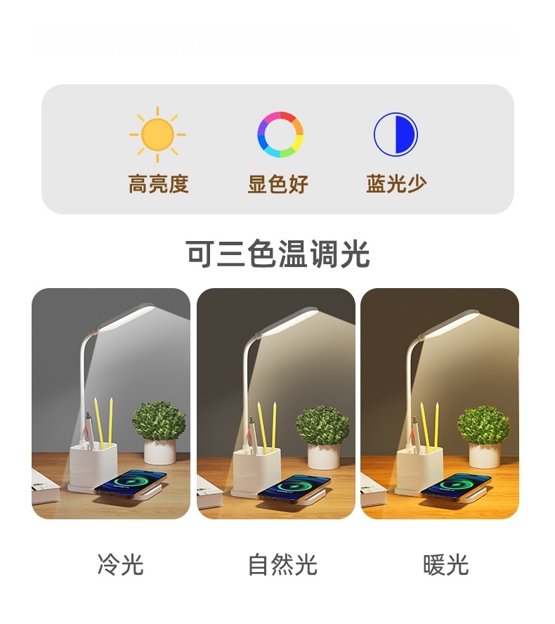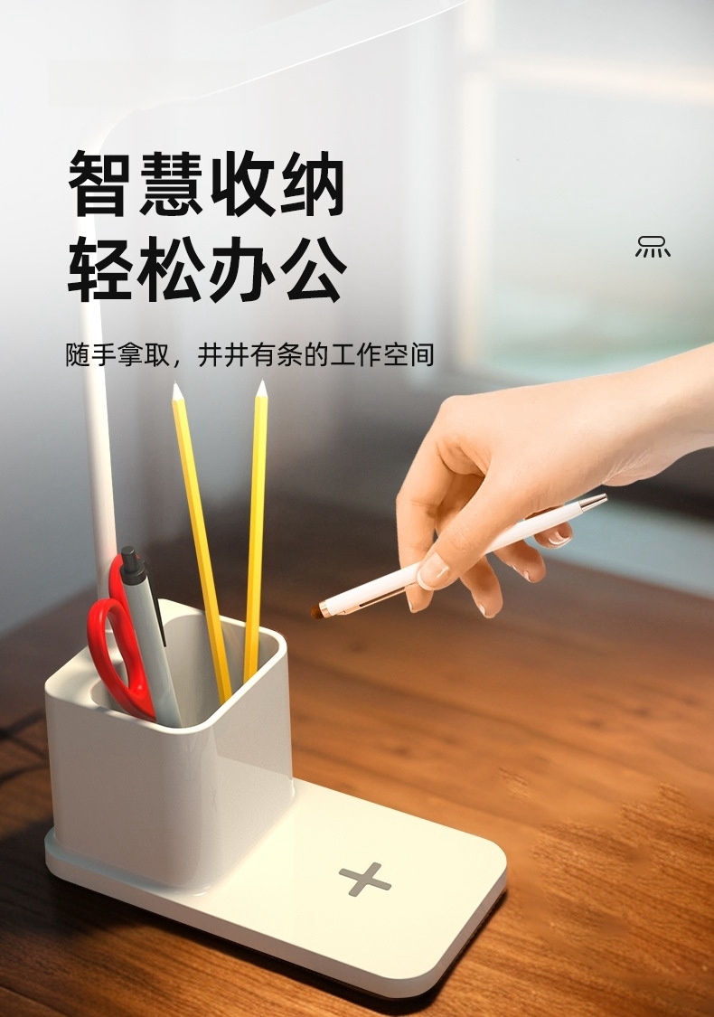 集成无线充电、笔筒收纳与照明,减少设备堆叠保持整洁;支持15W充电功率,兼容Qi协议手机,使用便捷;灯臂可弯曲拉伸,轻松适配不同位置与角度的照明需求;冷光自然光暖光一键切换,满足工作阅读休闲不同场景;支持PD充电器充电宝电脑USB供电,移动办公更方便