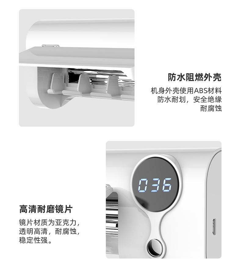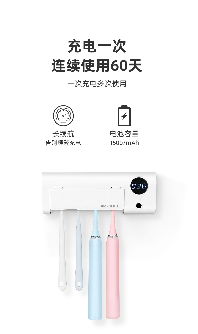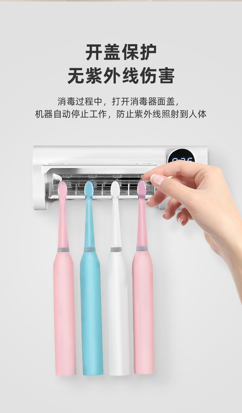 4牙刷位紫外线无死角杀菌;;多牙刷同时消毒,一键启动360秒高效净化;;一次充电约可用26天,告别频繁充电;;磁控安全开盖即停;;简约设计,免钉安装。
