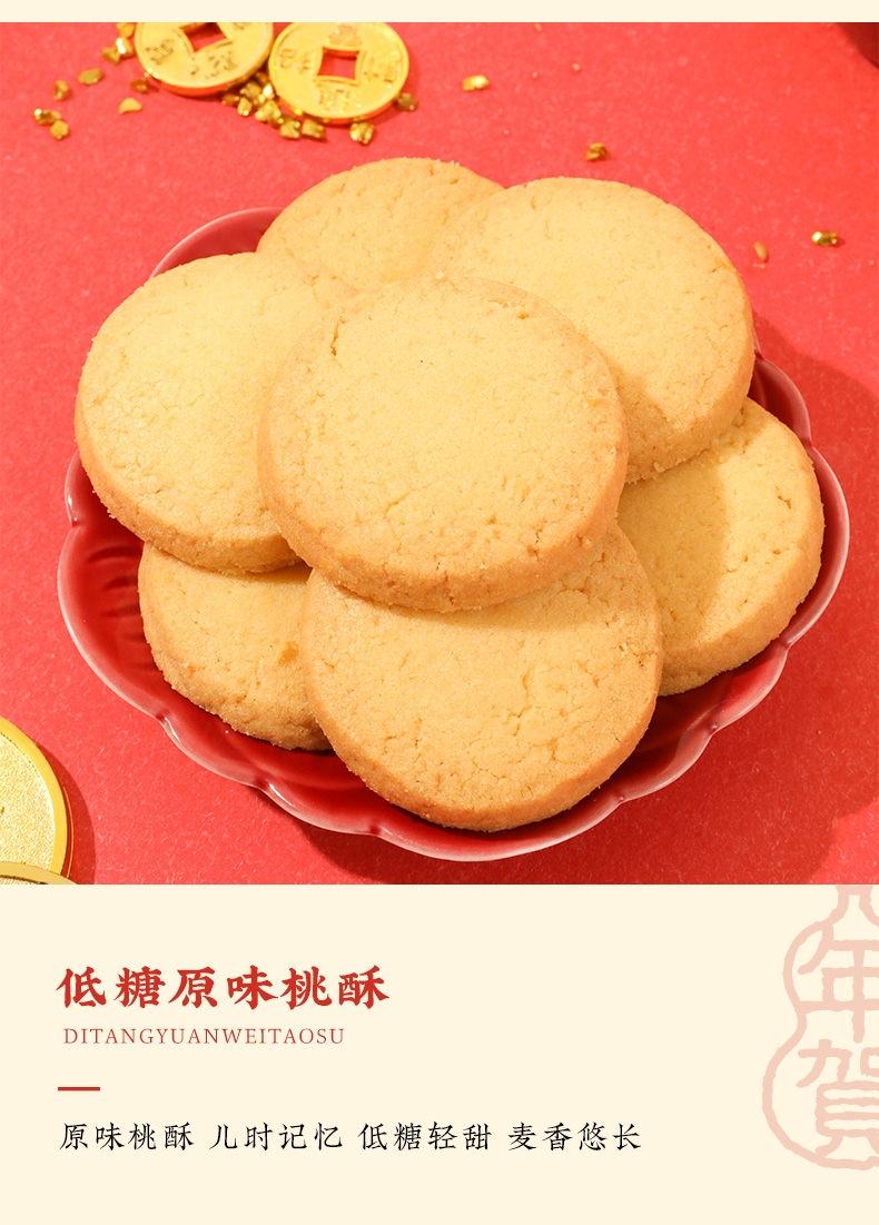 经典酥香,轻甜无负担,回归食物本真之味;不添加防腐剂、香精、人工合成色素 ,独立包装;因其甜度降低,更能凸显原料香气,明确标示低糖