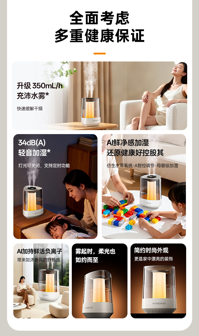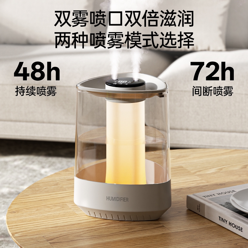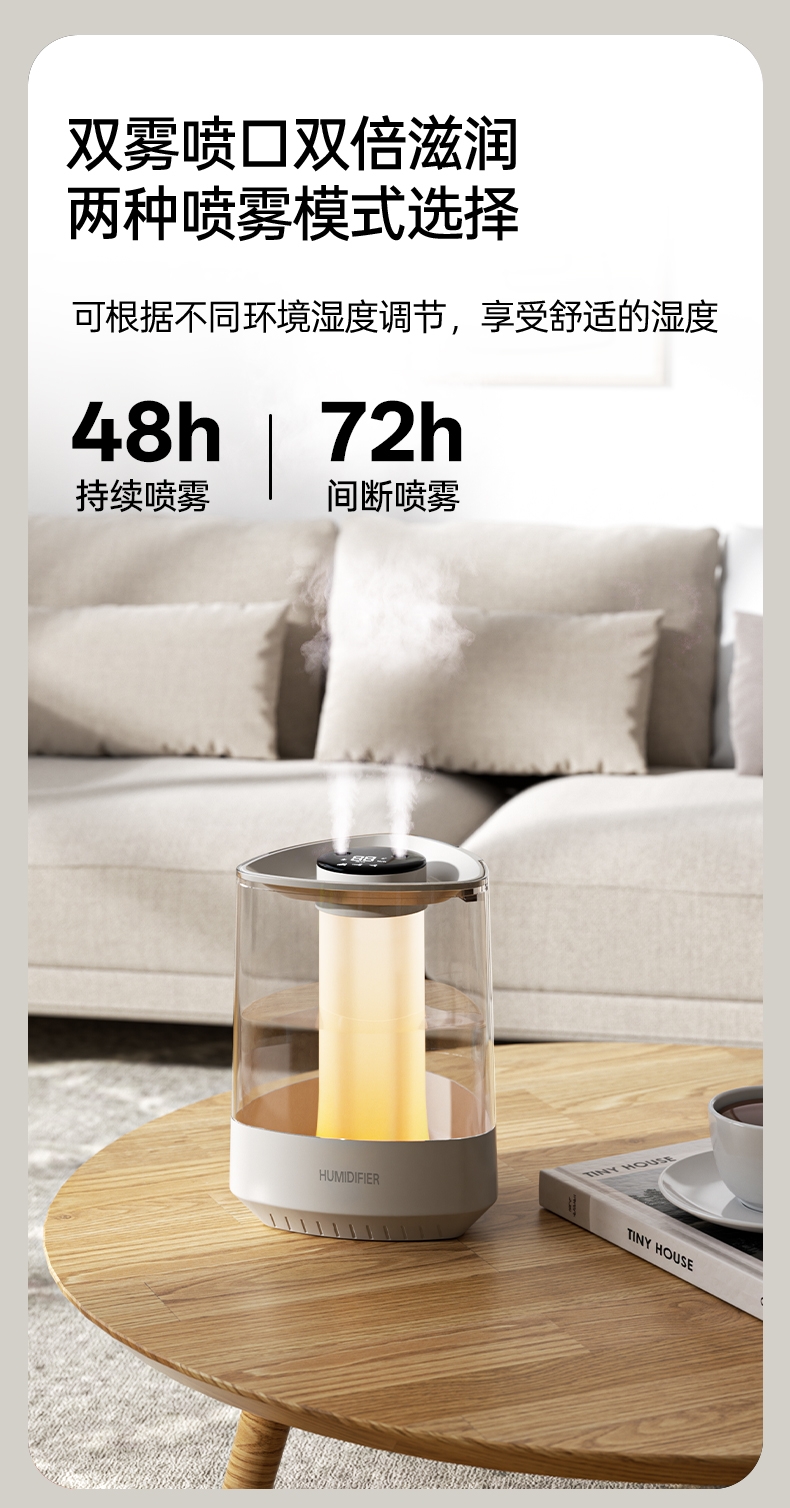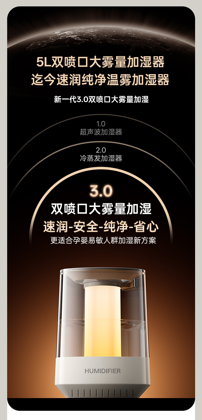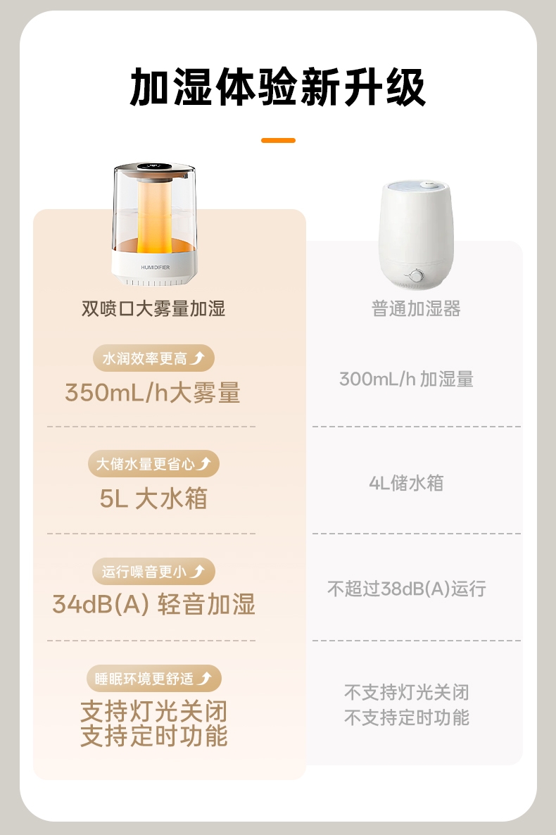 双喷口大雾量加湿,速润安全纯净省心;5L大水箱,大储水量更省心;支持灯光关闭及定时功能
