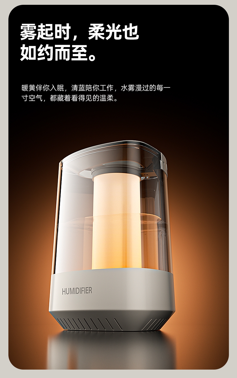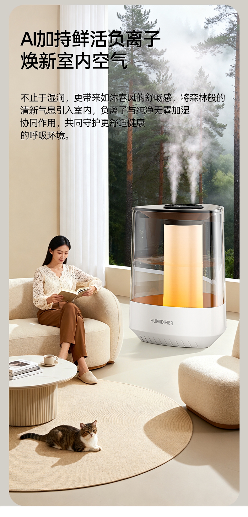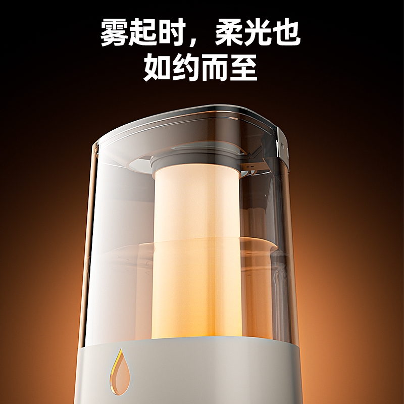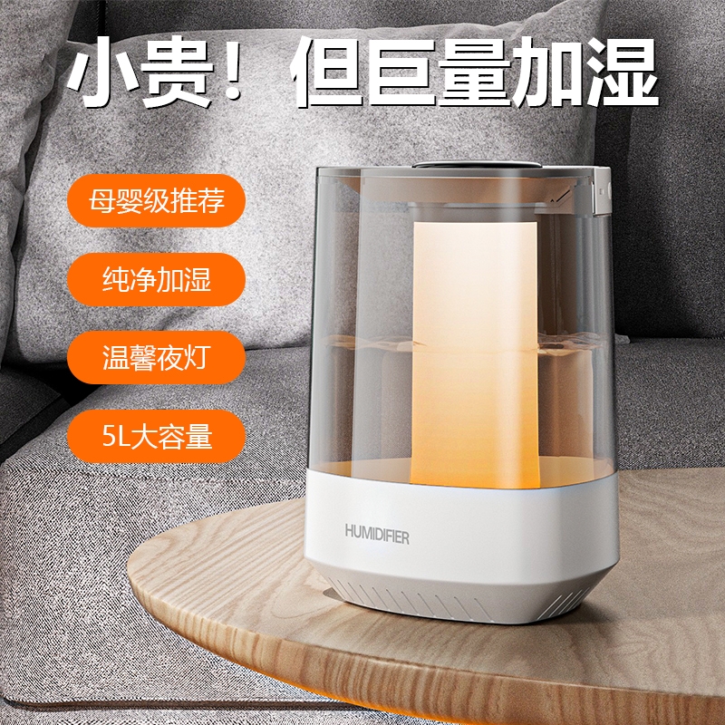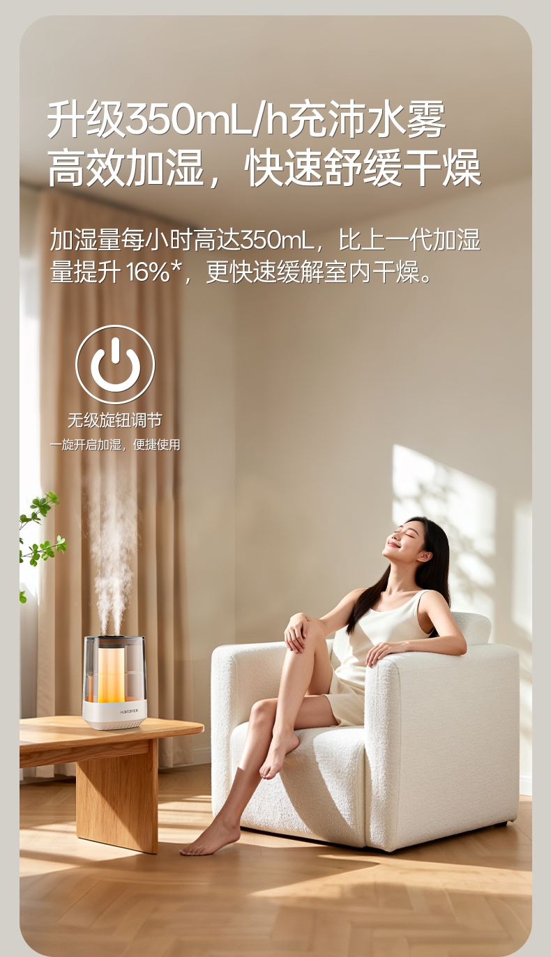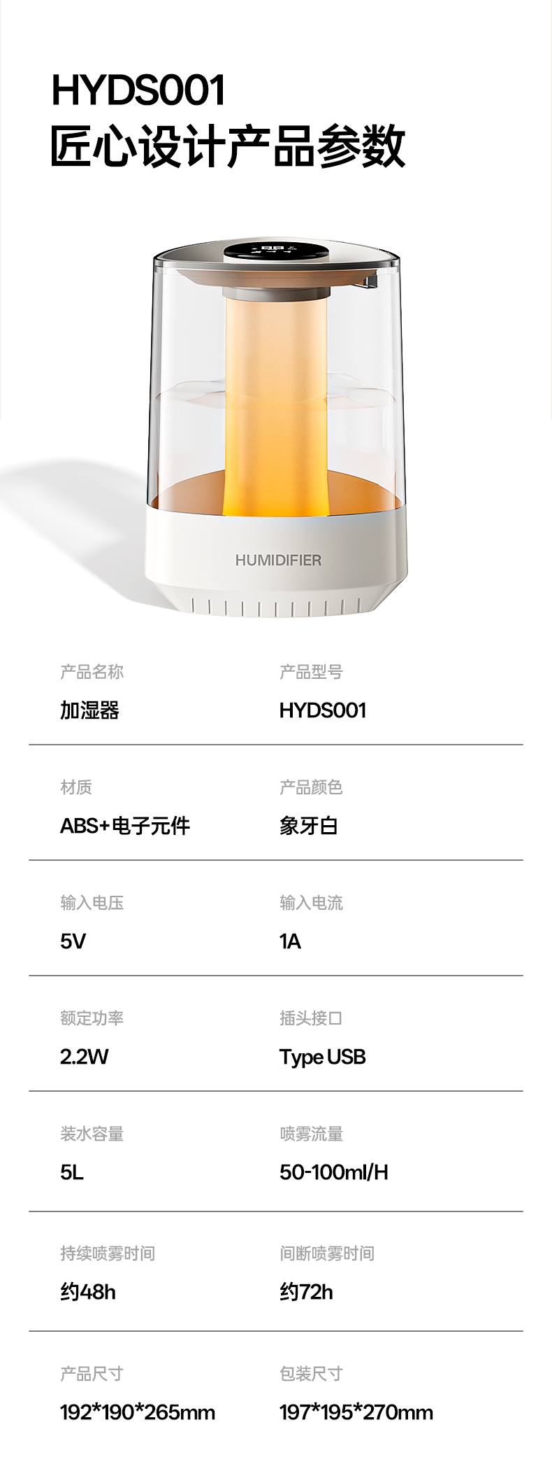 双喷口大雾量加湿,速润安全纯净省心;5L大水箱,大储水量更省心;支持灯光关闭及定时功能