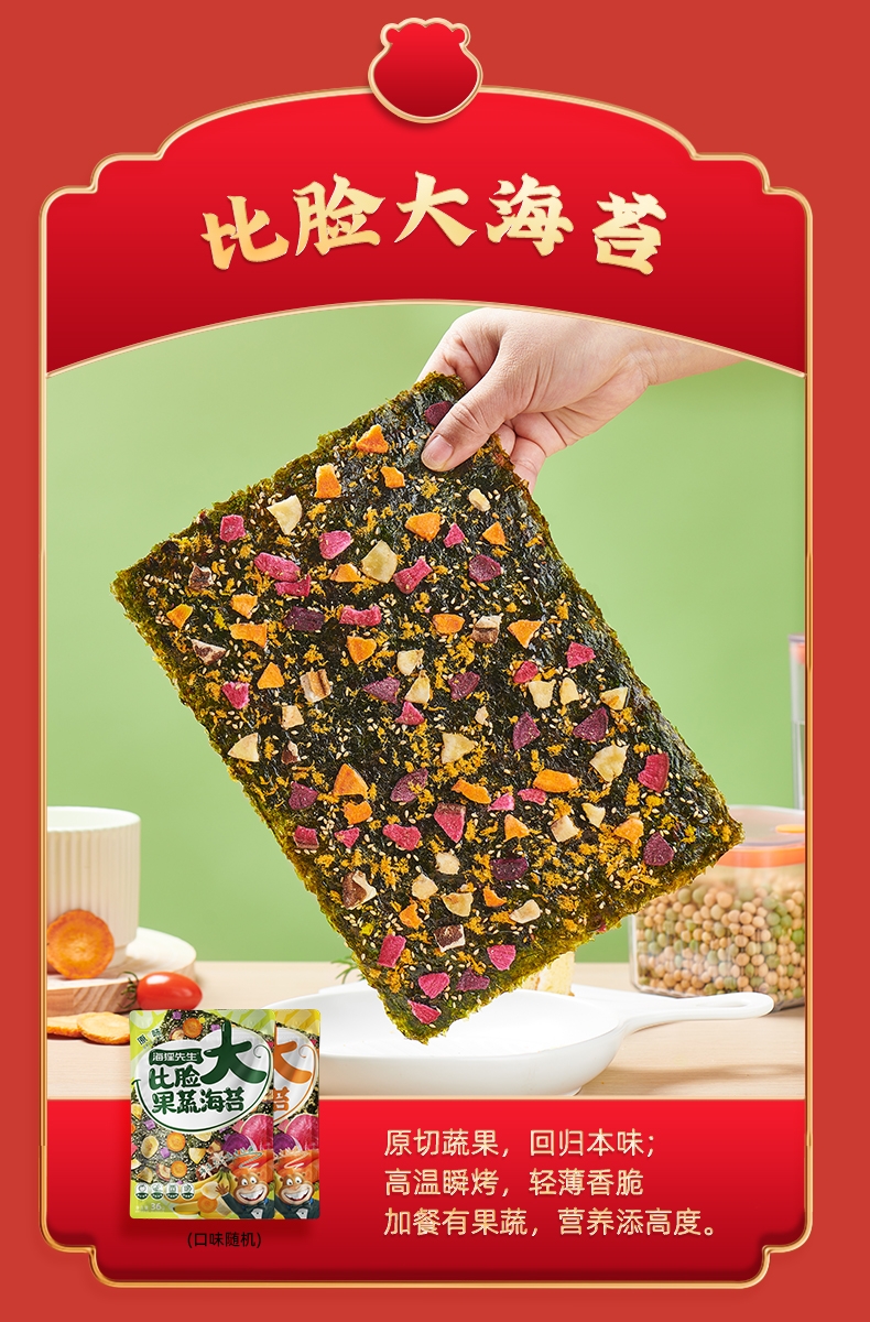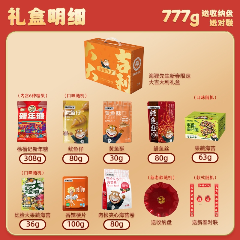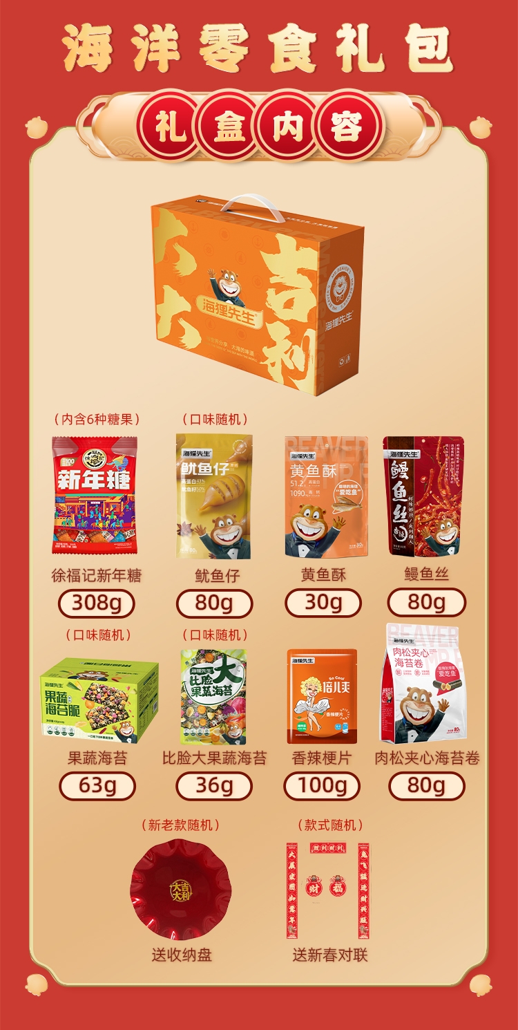 配置:果蔬海苔63g(口味随机),鱿鱼仔80g(口味随机),比脸大果蔬海苔36g(口味随机),香辣梗片100g/袋,肉松夹心海苔卷80g/袋,鳗鱼丝80g/袋,黄鱼酥30g/袋,徐福记新年糖308g/袋(内含6种糖果)