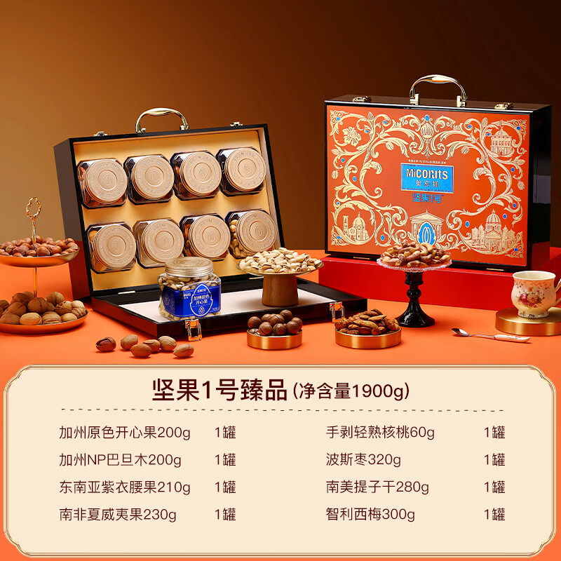 配置:加州原色开心果(环球罐) 200g 加州NP巴旦木(环球罐) 200g 东南亚紫衣腰果(环球罐) 210g 南非夏威夷果(环球罐) 230g 手剥轻熟核桃(环球罐) 160g 波斯枣(环球罐) 320g 南美提子干(环球罐) 280g 智利西梅(环球罐) 300g